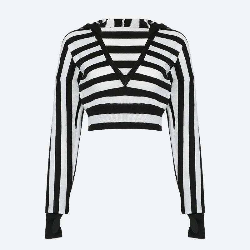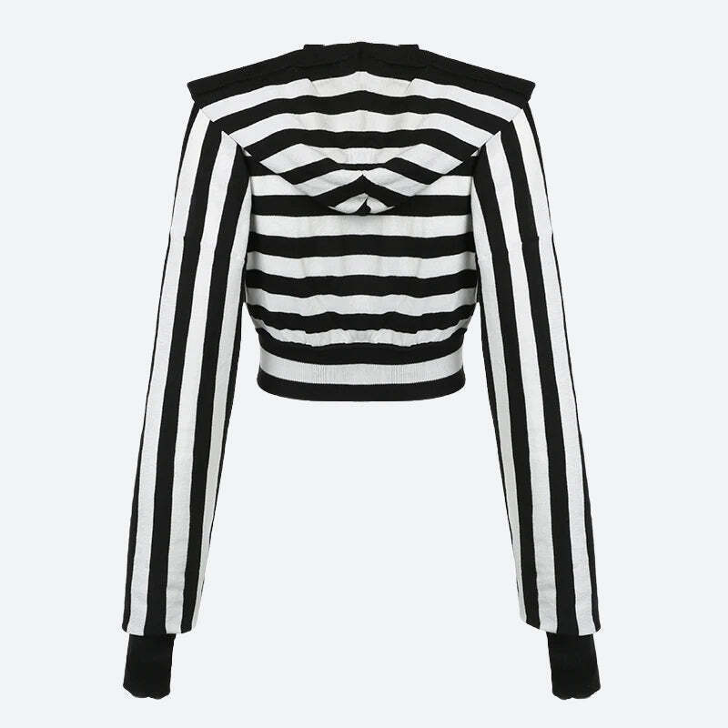 Add edgy style with this grunge striped hooded crop top. Bold lines and a comfy hood make it a statement piece for casual days or parties. Pair it with jeans or skirts for a fresh vibe.