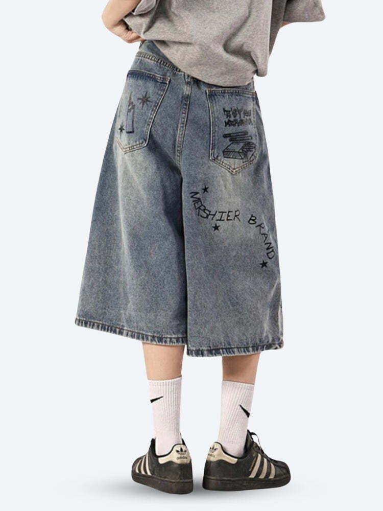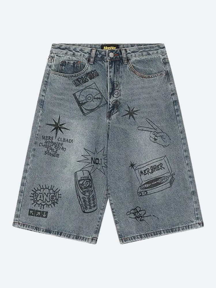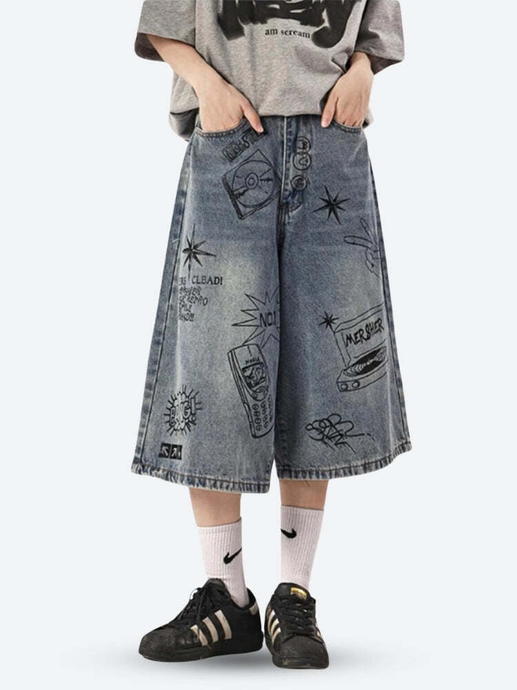 Add some retro flair to your wardrobe with these Grunge Wide Leg Denim Shorts. Featuring bold graphic prints and an oversized fit, they offer a rebellious, vintage vibe. Perfect for pairing with a tee or hoodie for a laid-back, edgy look.