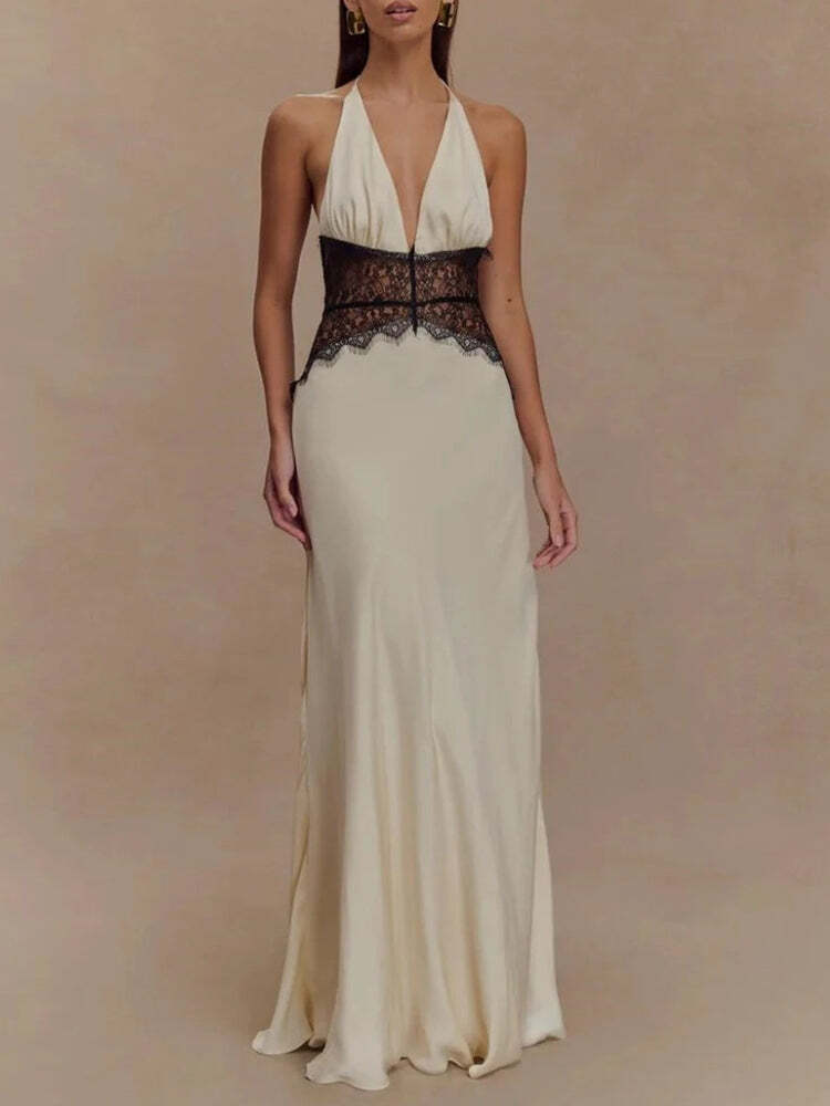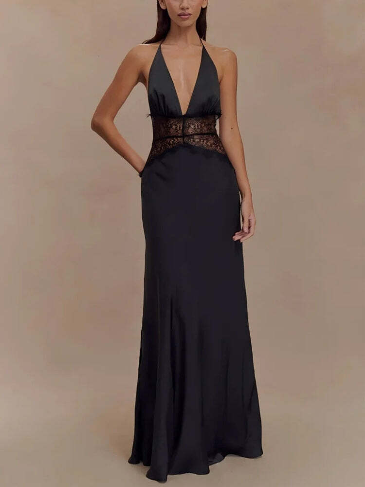A dress that whispers elegance with every step. This halter neck maxi features a deep plunge, sheer lace corset waist, and a silky flow that flatters every curve. Perfect for night events or upscale summer occasions.