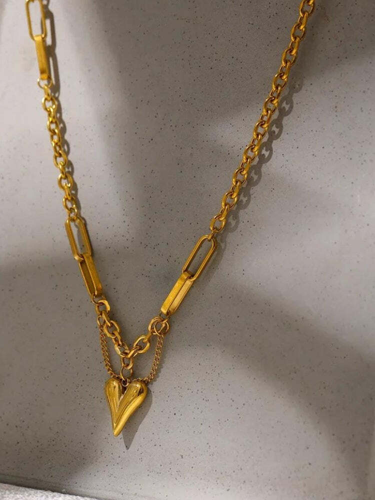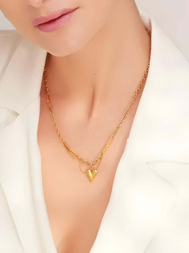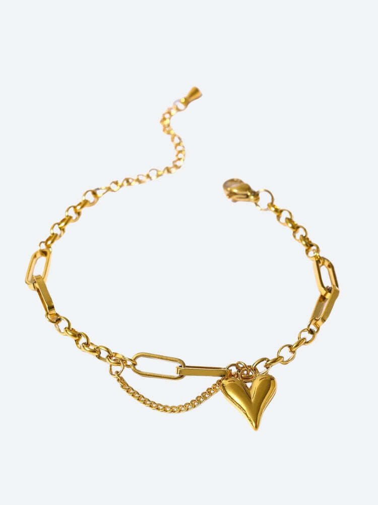 Golden heart pendant necklace and bracelet set, crafted with a blend of chain and link design. This duo offers a touch of sophistication, making it a standout addition to any jewelry collection. Ideal for accessorizing with elegance and style.