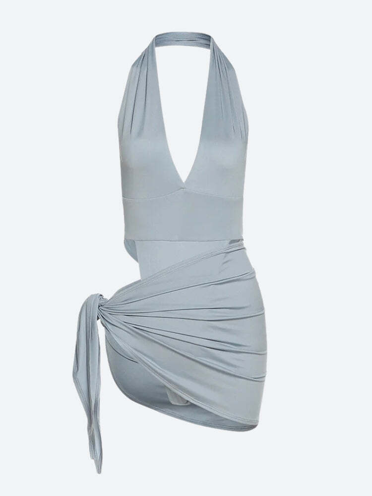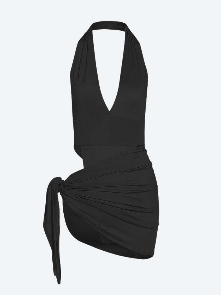 Breeze through summer in this high-cut swimsuit skirt two-piece set. A sleek halter neckline and revealing cutouts keep it bold, while the wrap skirt offers breezy coverage. Great for sunny poolside days or tropical getaways.