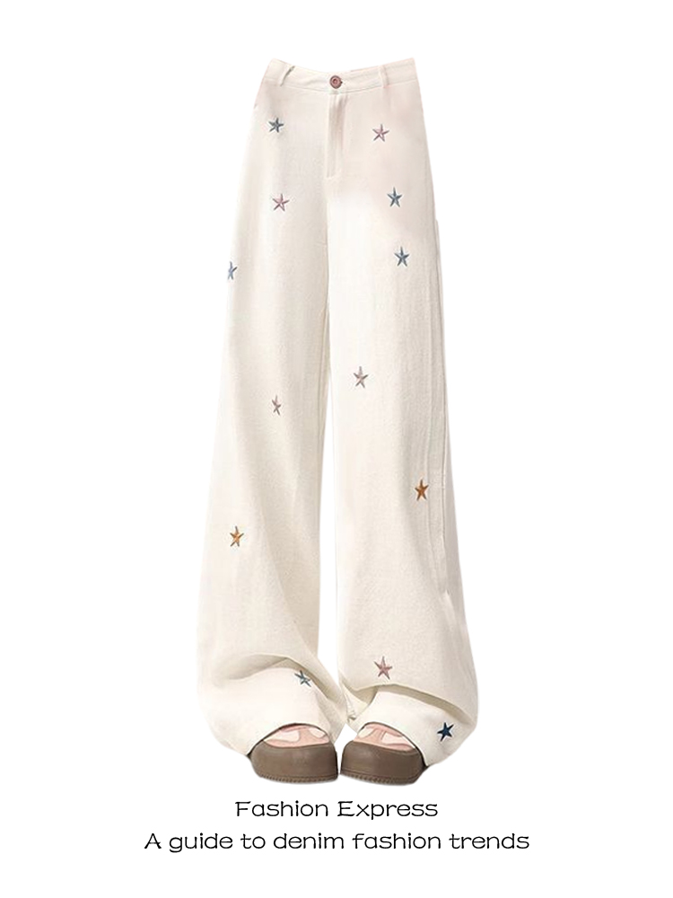 High Waisted White Star Embroidered Denim Pants Women, – Leather Pants Outfit Winter