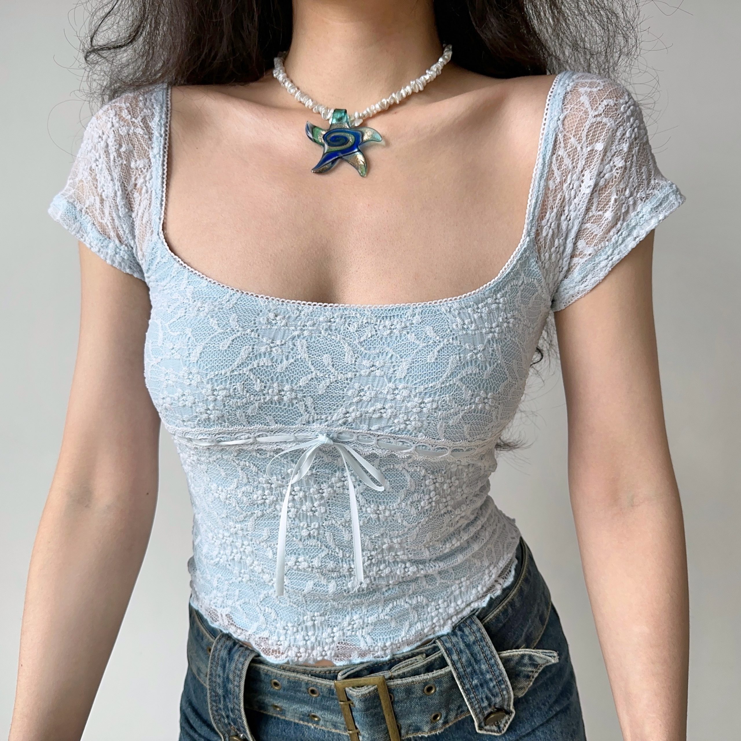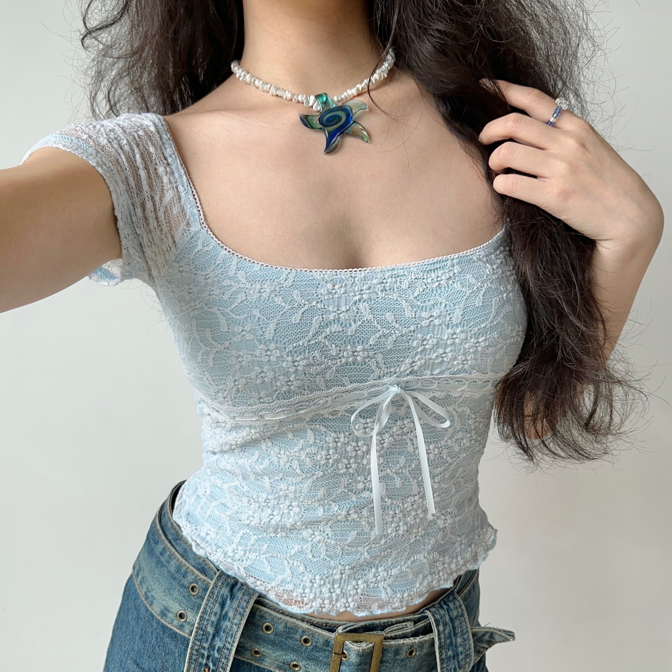 Hollow Lace Trim Square Neck Short Sleeve Women Summer Slim Fit Top in High-quality product featuring casual summer outfits, fall fits, fall outfits women and more. Modern design that fits the latest trends. Premium materials ensure durability and comfort. Order now for special offers! Product designed with attention to every detail. Suitable for all occasions and personal styles.
