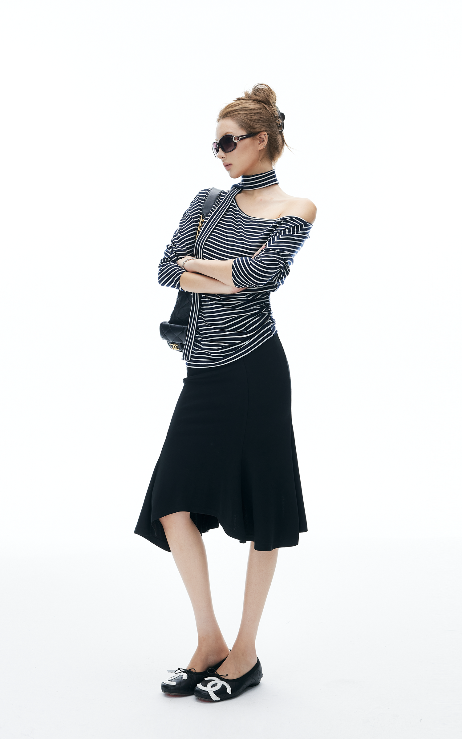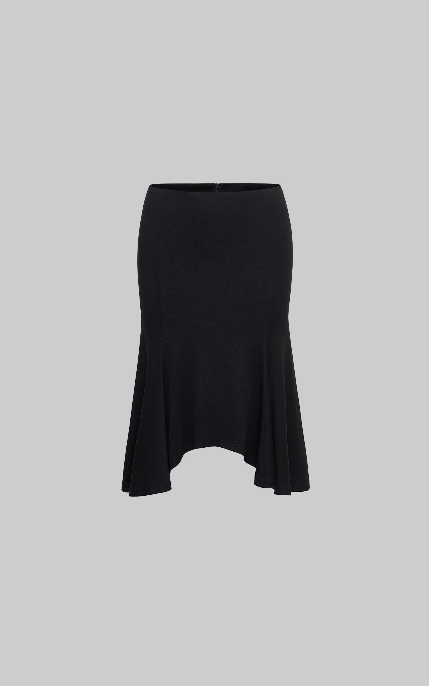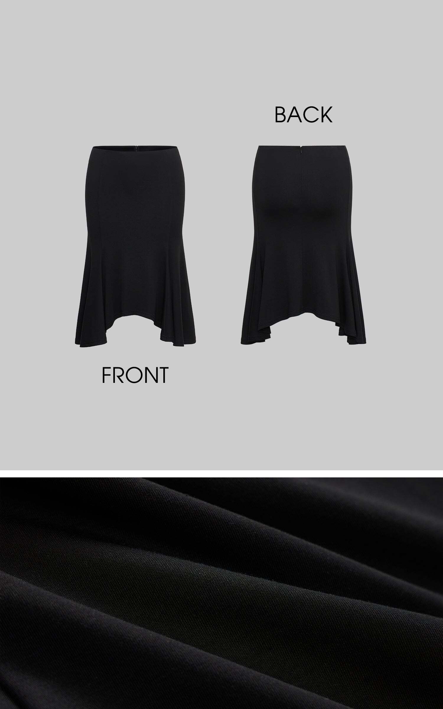 A sleek midi skirt with a playful edge—cut with an asymmetric flared hem that moves with every step. The slim fit waistline highlights your curves while the soft stretch fabric keeps it comfortable all day. Style it with a cropped cardigan or an off-shoulder top for that easy cool-girl energy, perfect from coffee runs to night outs.