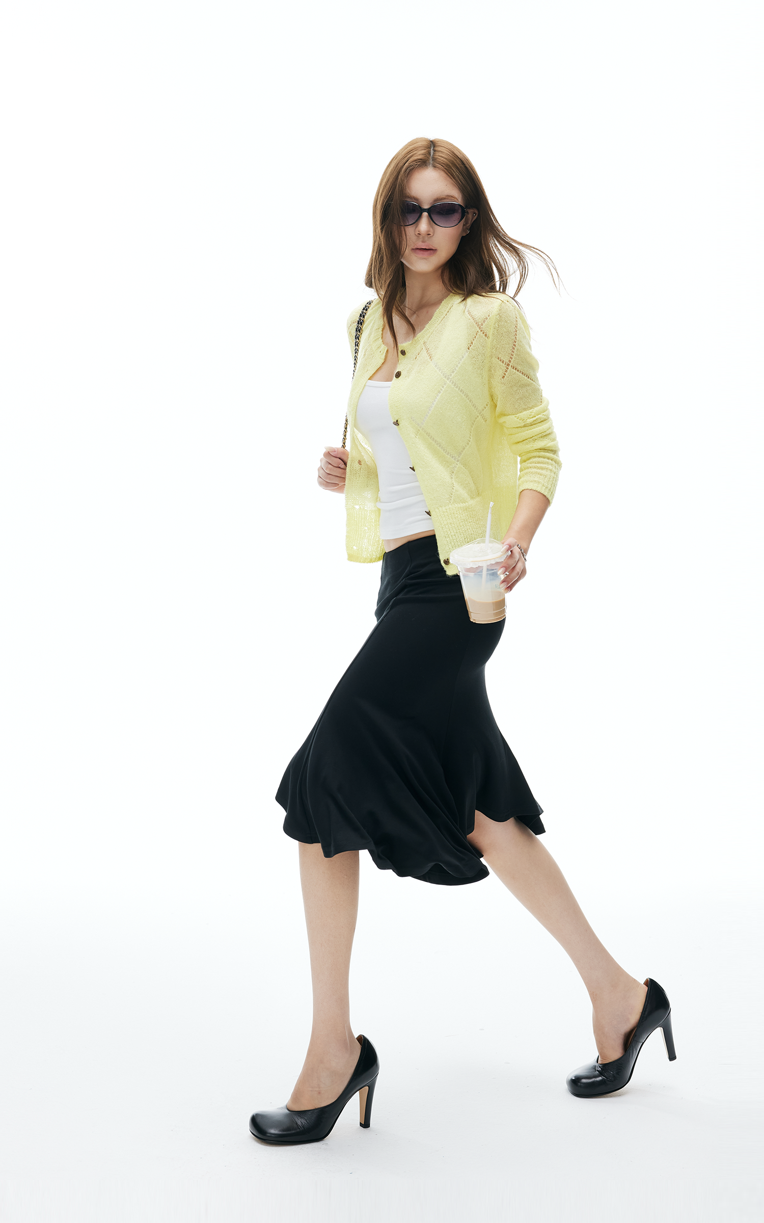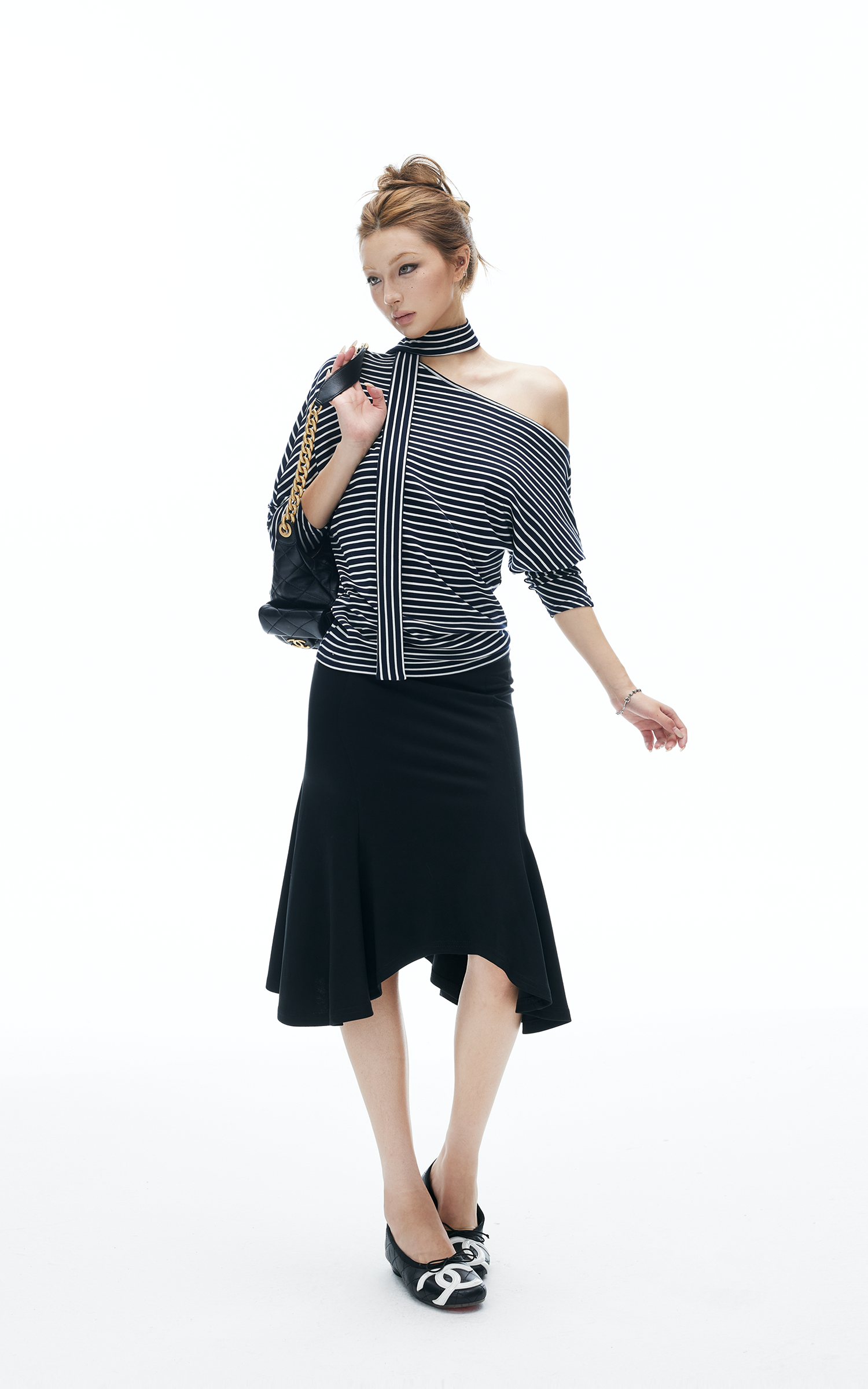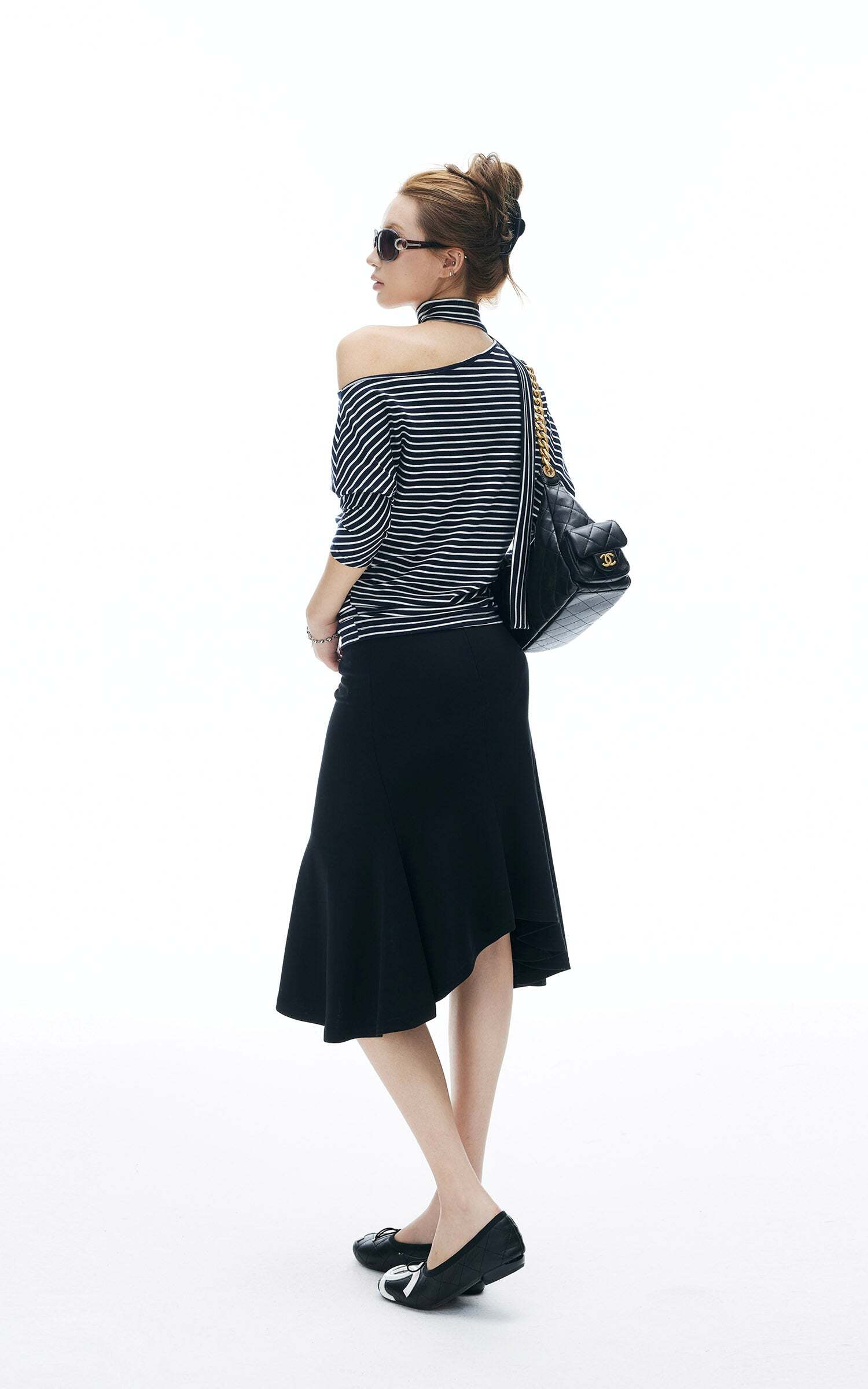 A sleek midi skirt with a playful edge—cut with an asymmetric flared hem that moves with every step. The slim fit waistline highlights your curves while the soft stretch fabric keeps it comfortable all day. Style it with a cropped cardigan or an off-shoulder top for that easy cool-girl energy, perfect from coffee runs to night outs.