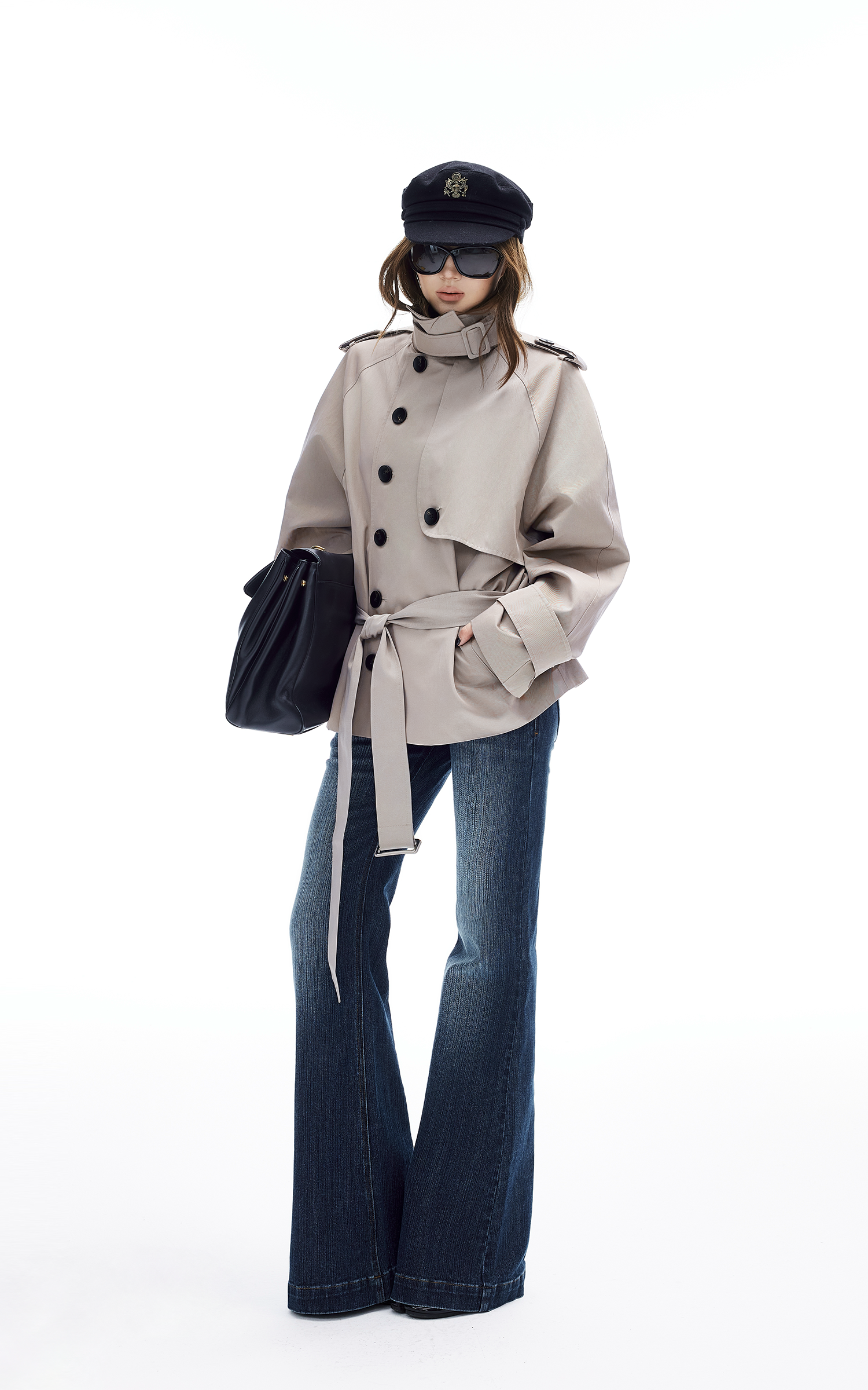 This belted trench coat reimagines a classic silhouette with a bold, modern twist. Featuring an oversized fit, structured shoulders, and a cropped length, it delivers both drama and versatility. The high stand collar and wide storm flap give it an elevated edge, while the waist tie cinches the shape for a flattering finish. Perfect for layering over sleek trousers, denim, or mini skirts, this piece is your new statement jacket for city-ready looks.