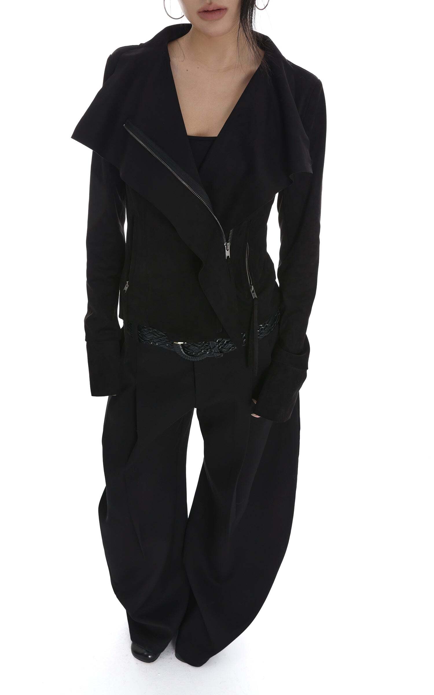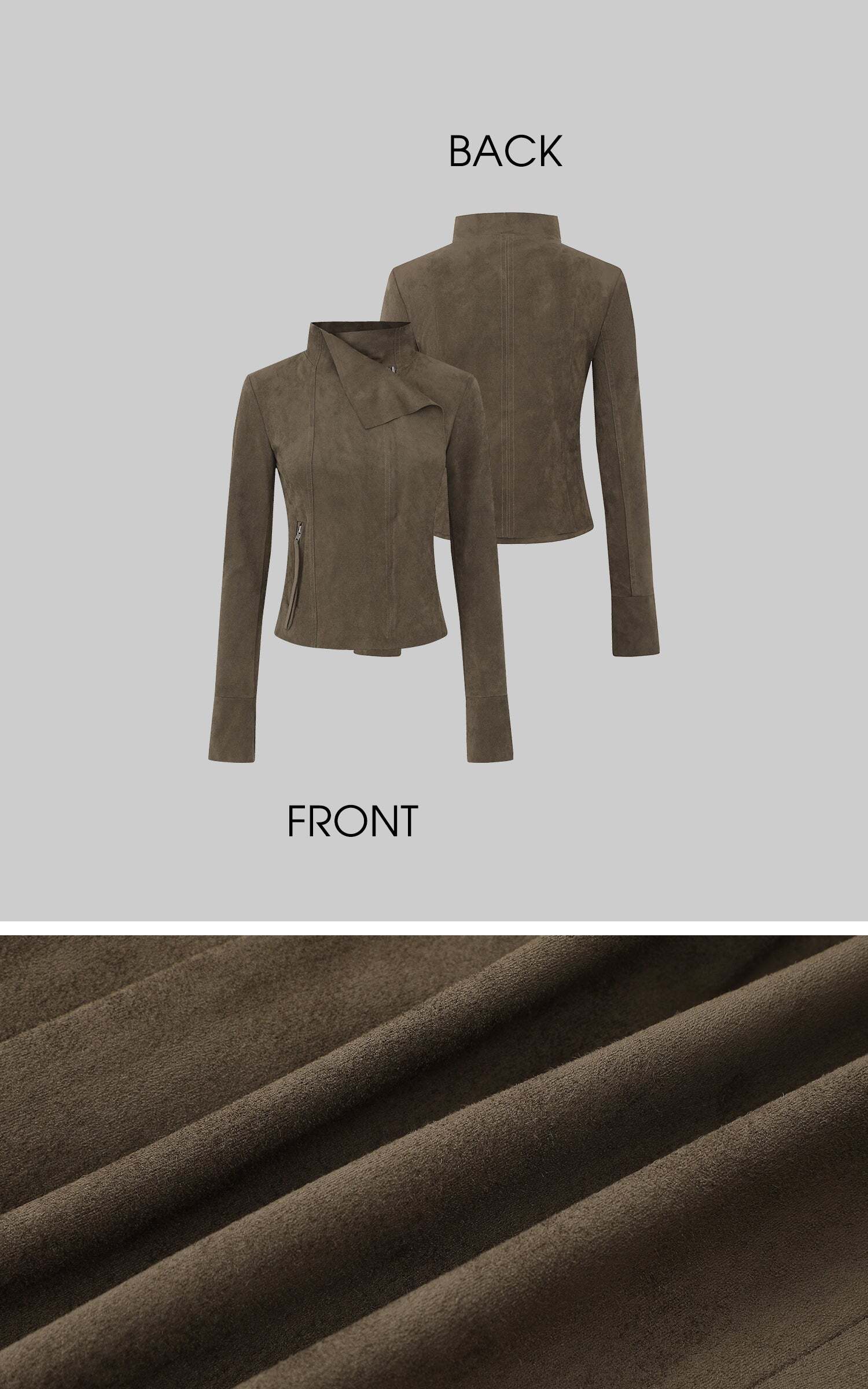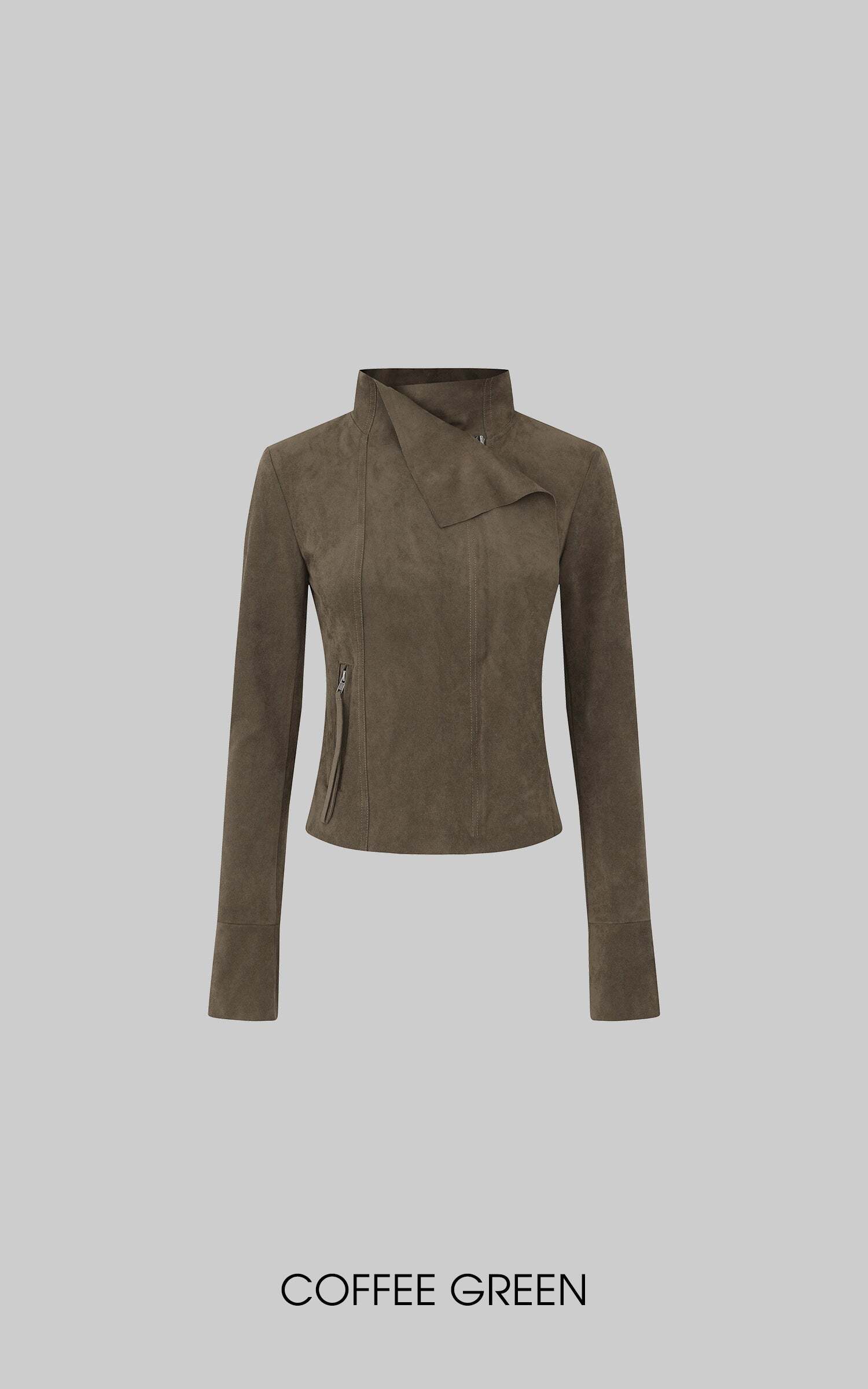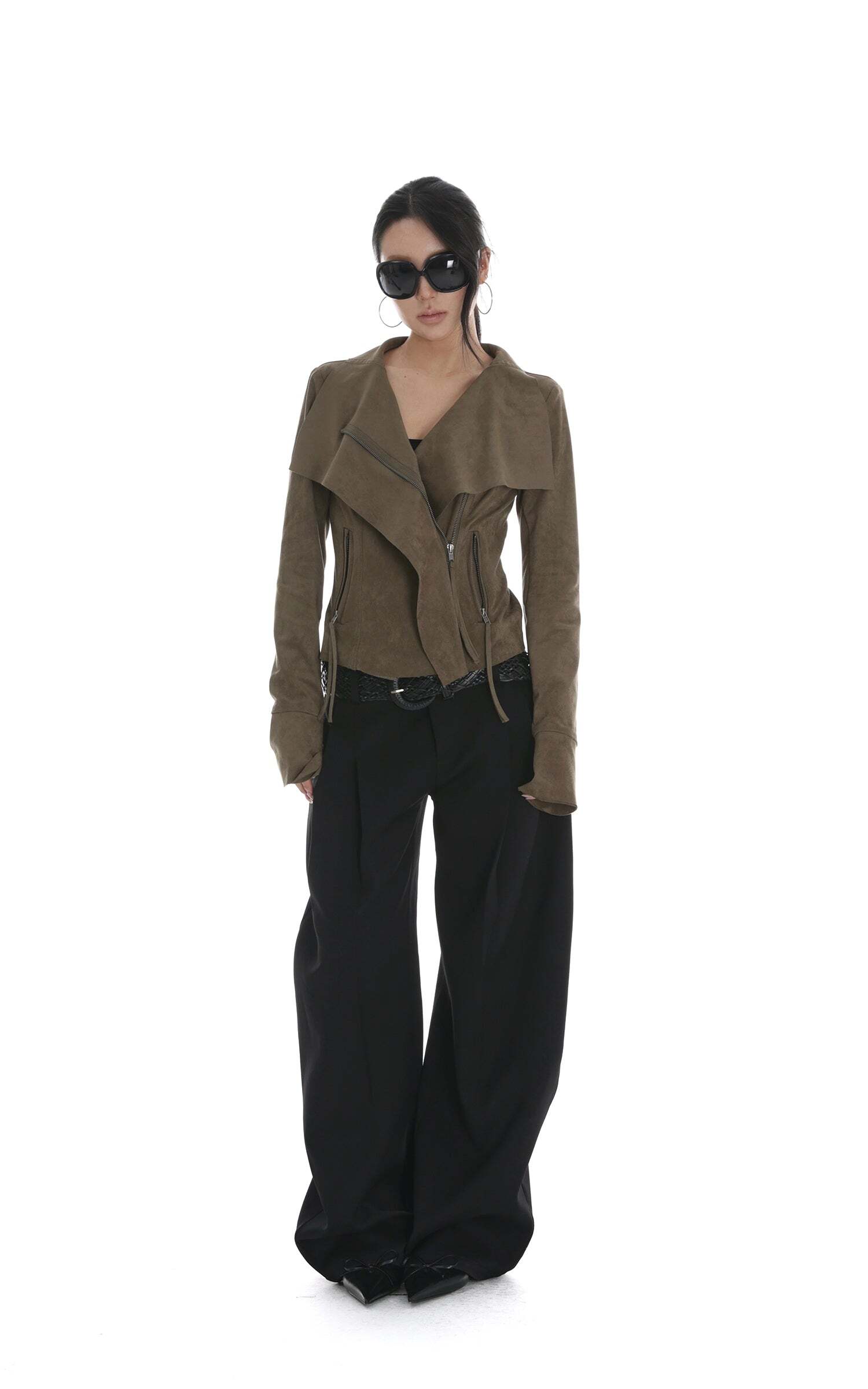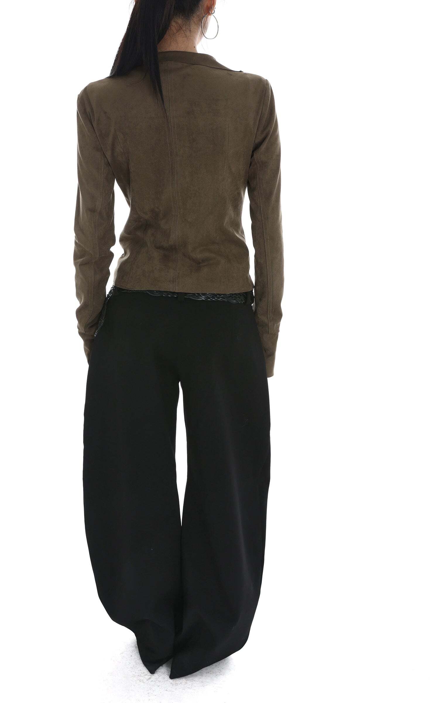 A sharp cropped moto jacket cut from soft suede-touch fabric with an asymmetric front zip. Fitted through the body with structured seams, flared cuffs, and a draped collar that can be styled open or closed. The sleek silhouette pairs effortlessly with oversized trousers or a mini skirt for a bold off-duty look.