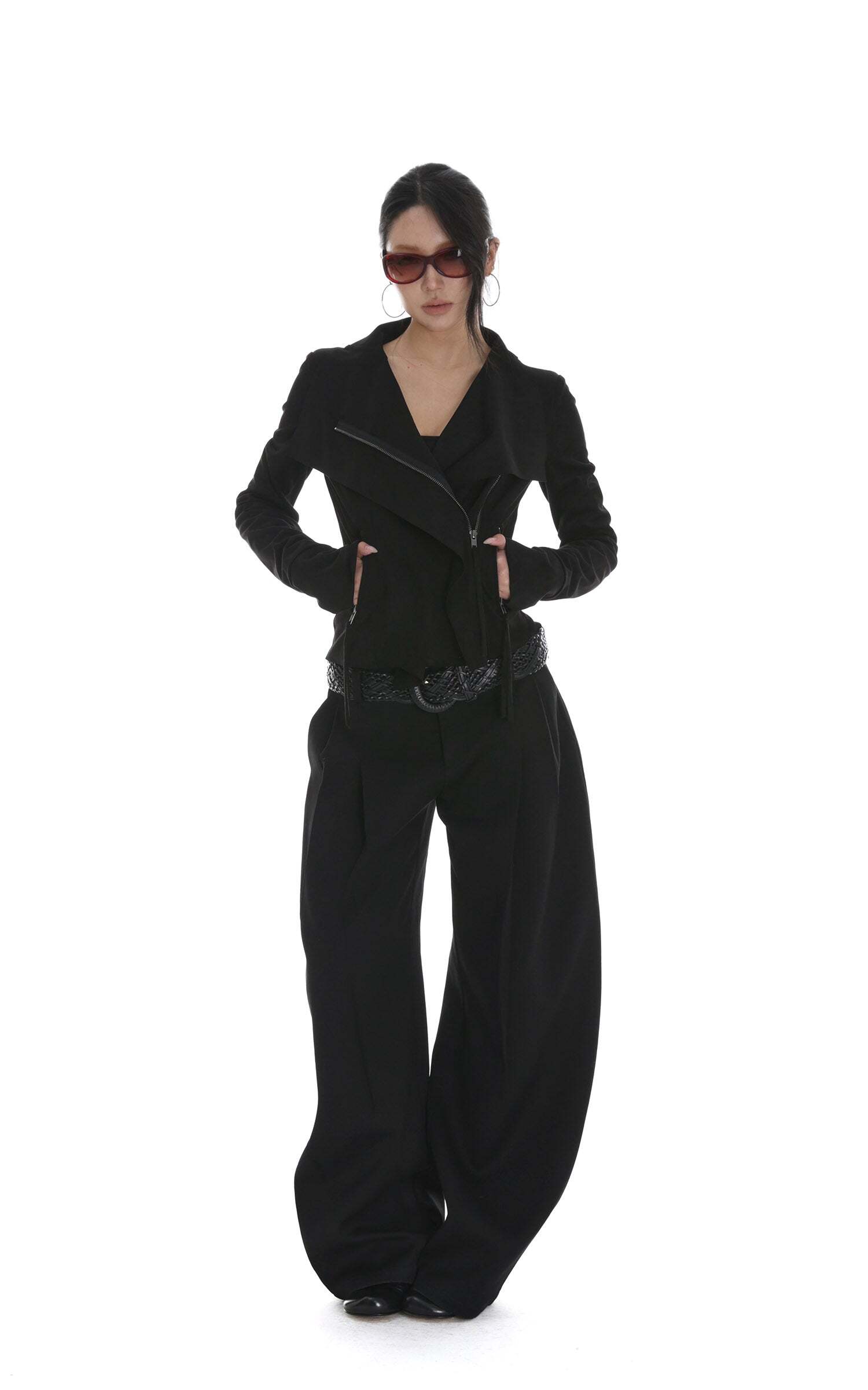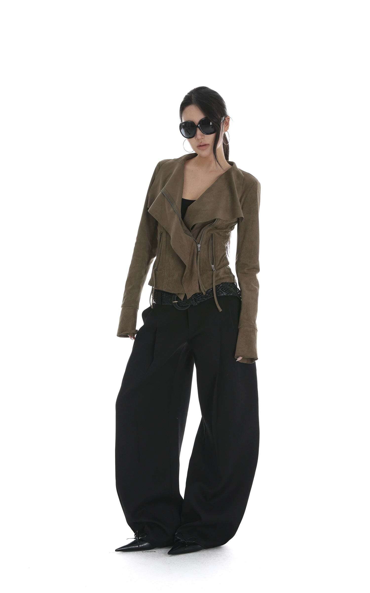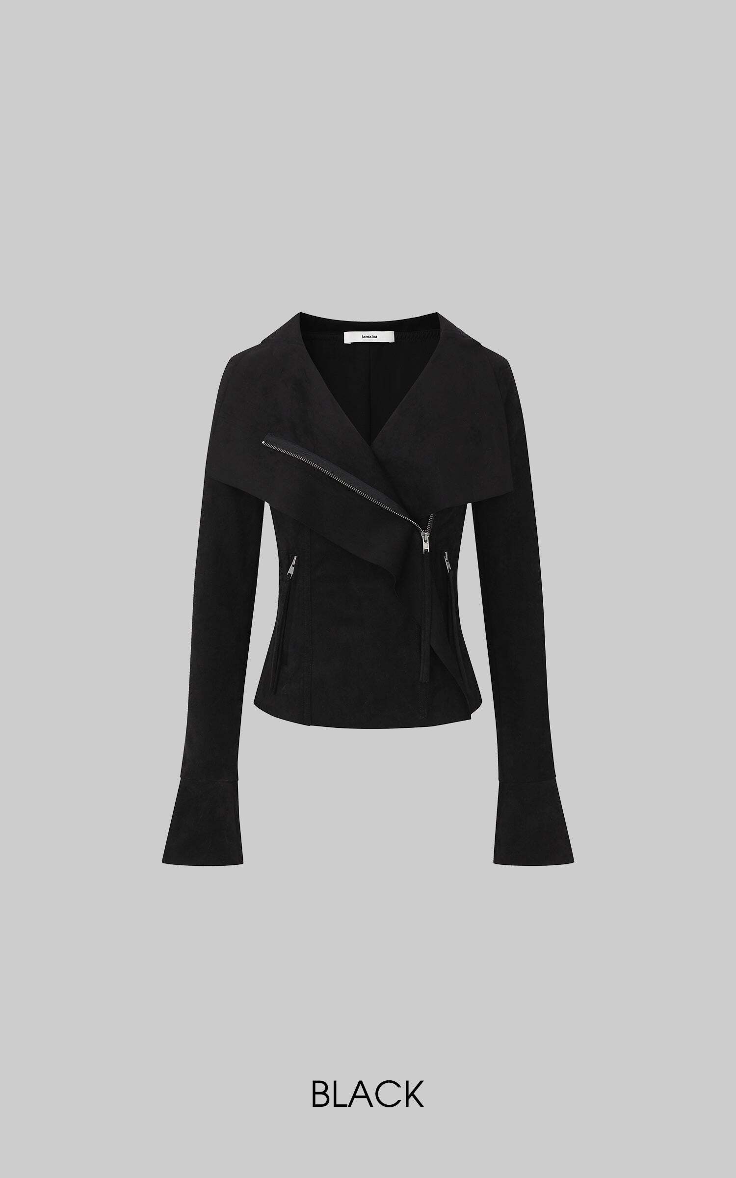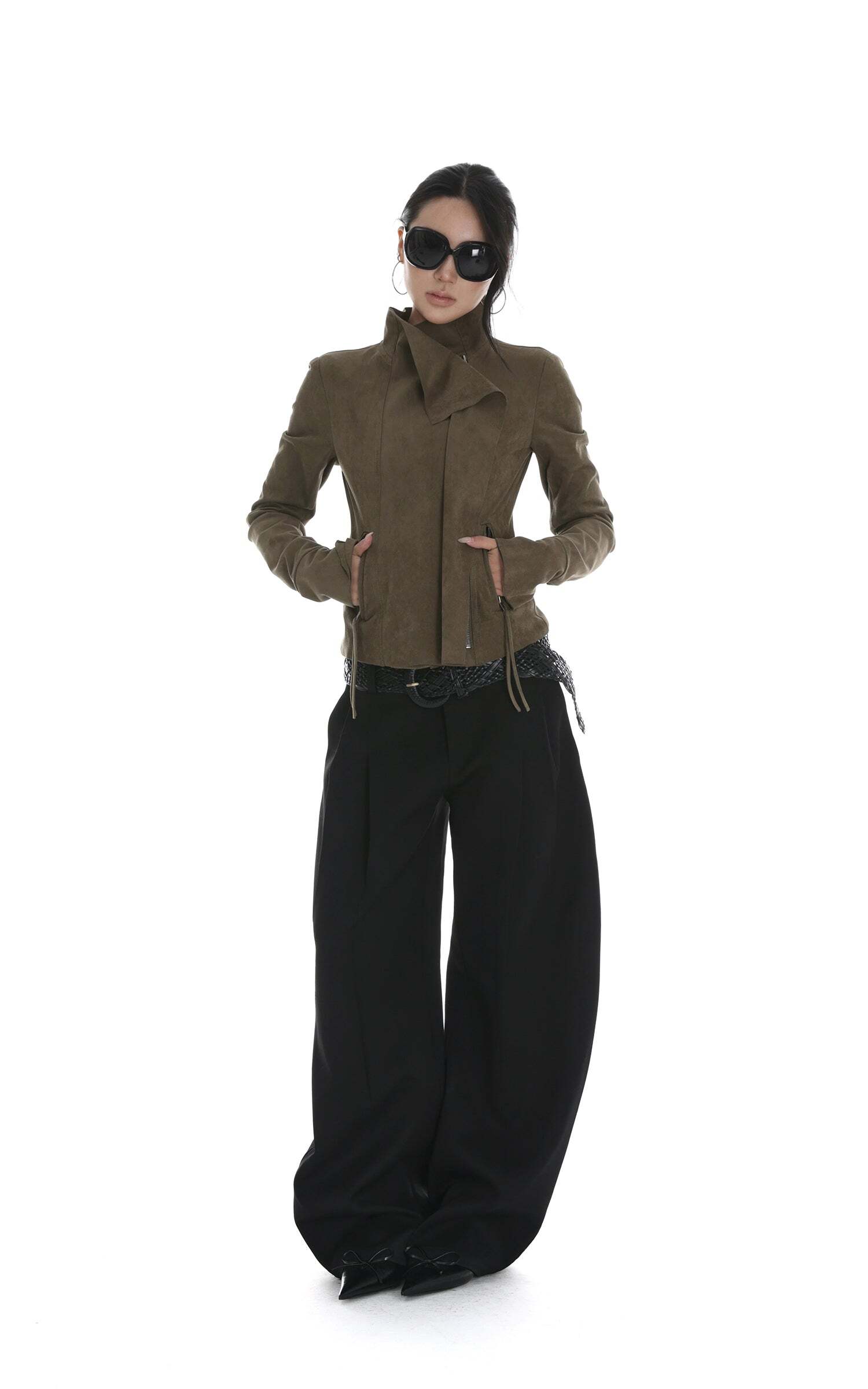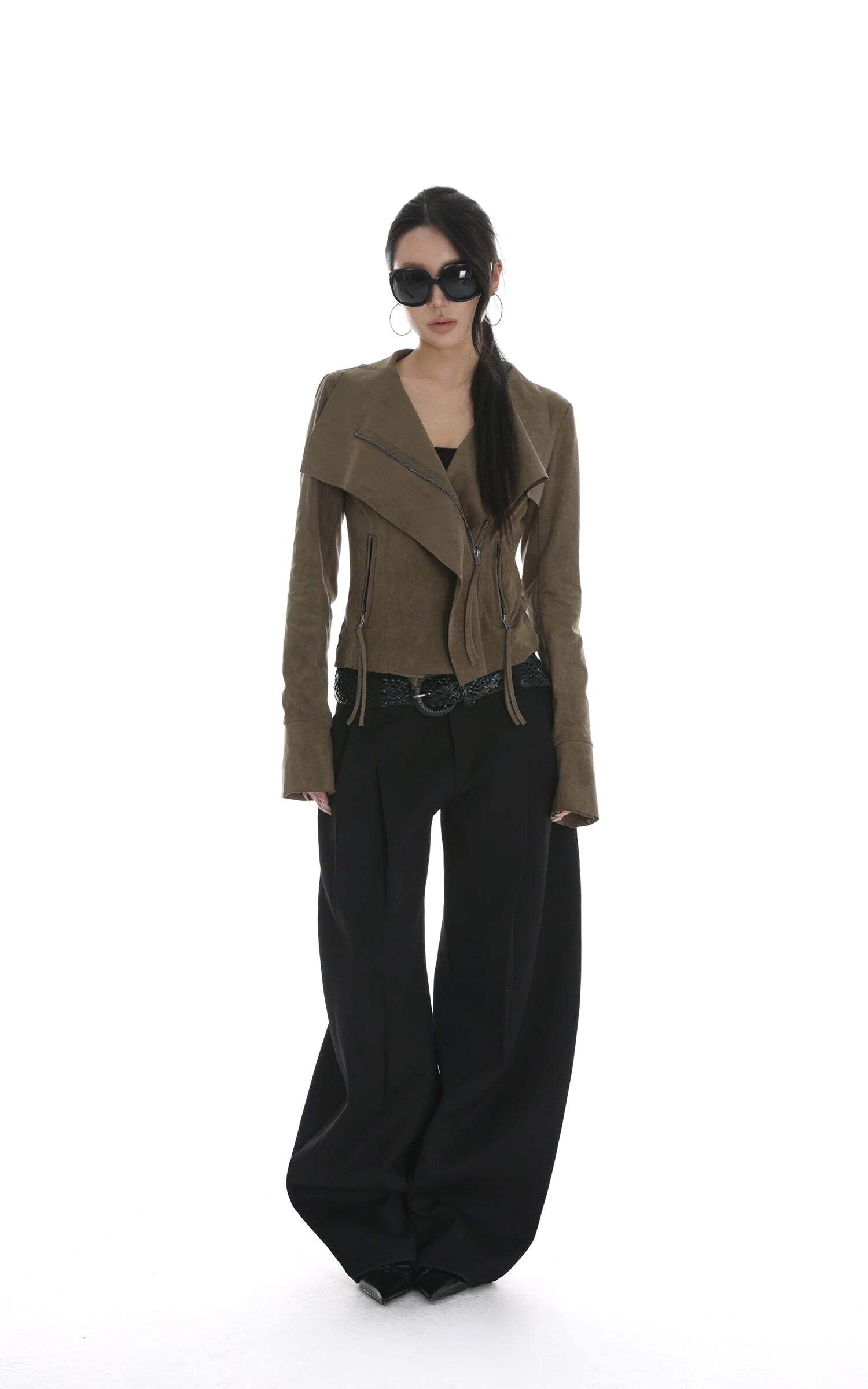 A sharp cropped moto jacket cut from soft suede-touch fabric with an asymmetric front zip. Fitted through the body with structured seams, flared cuffs, and a draped collar that can be styled open or closed. The sleek silhouette pairs effortlessly with oversized trousers or a mini skirt for a bold off-duty look.
