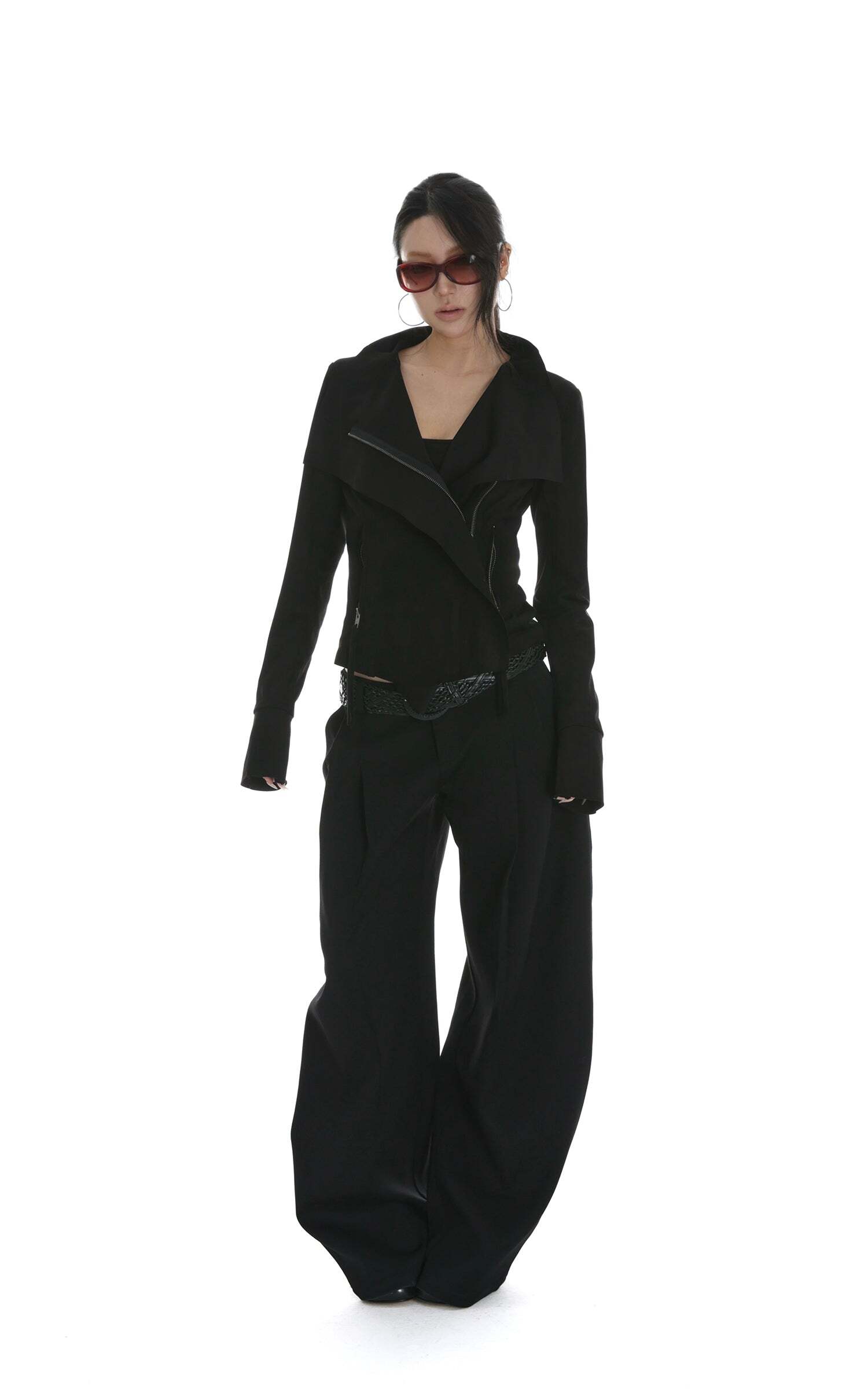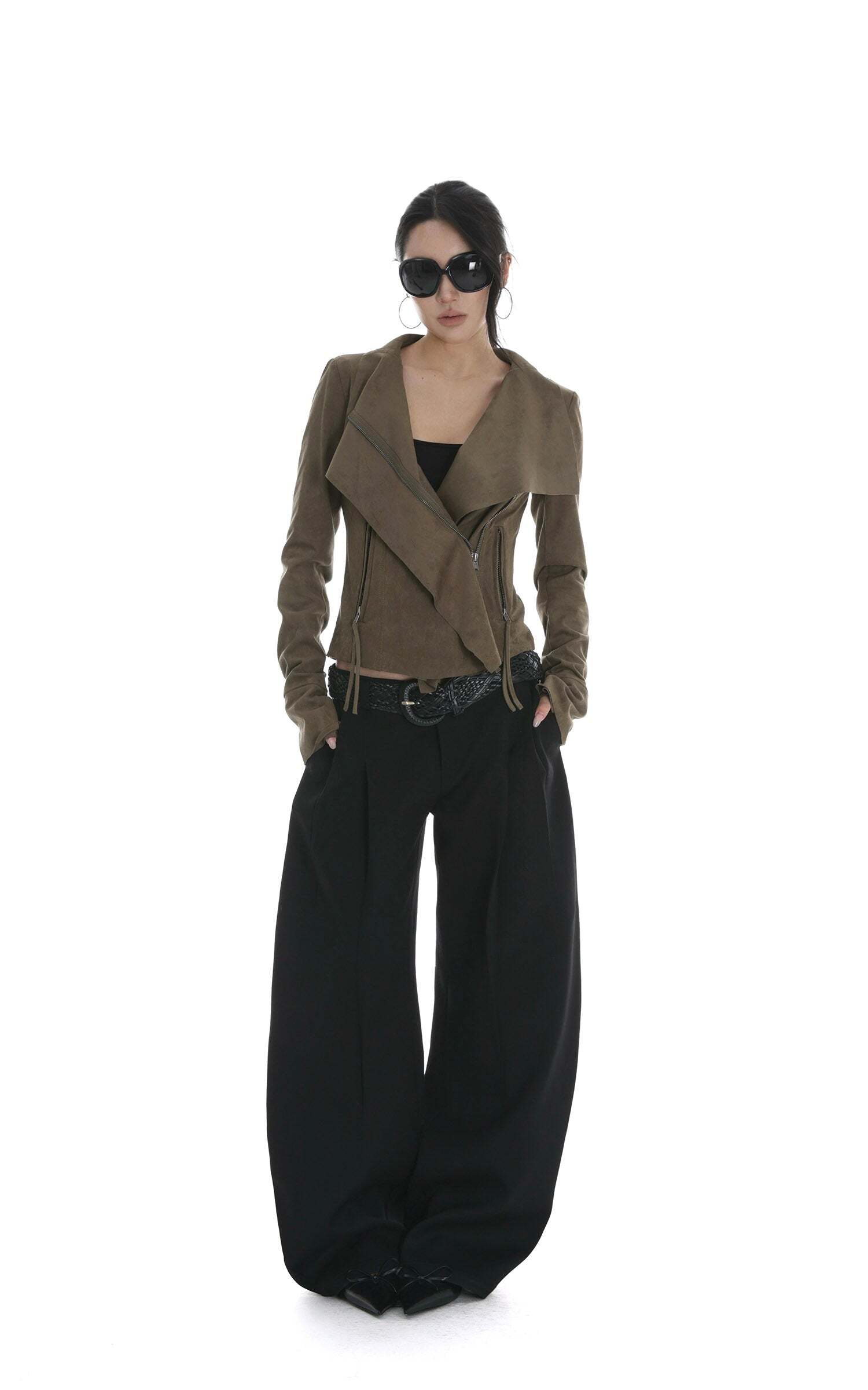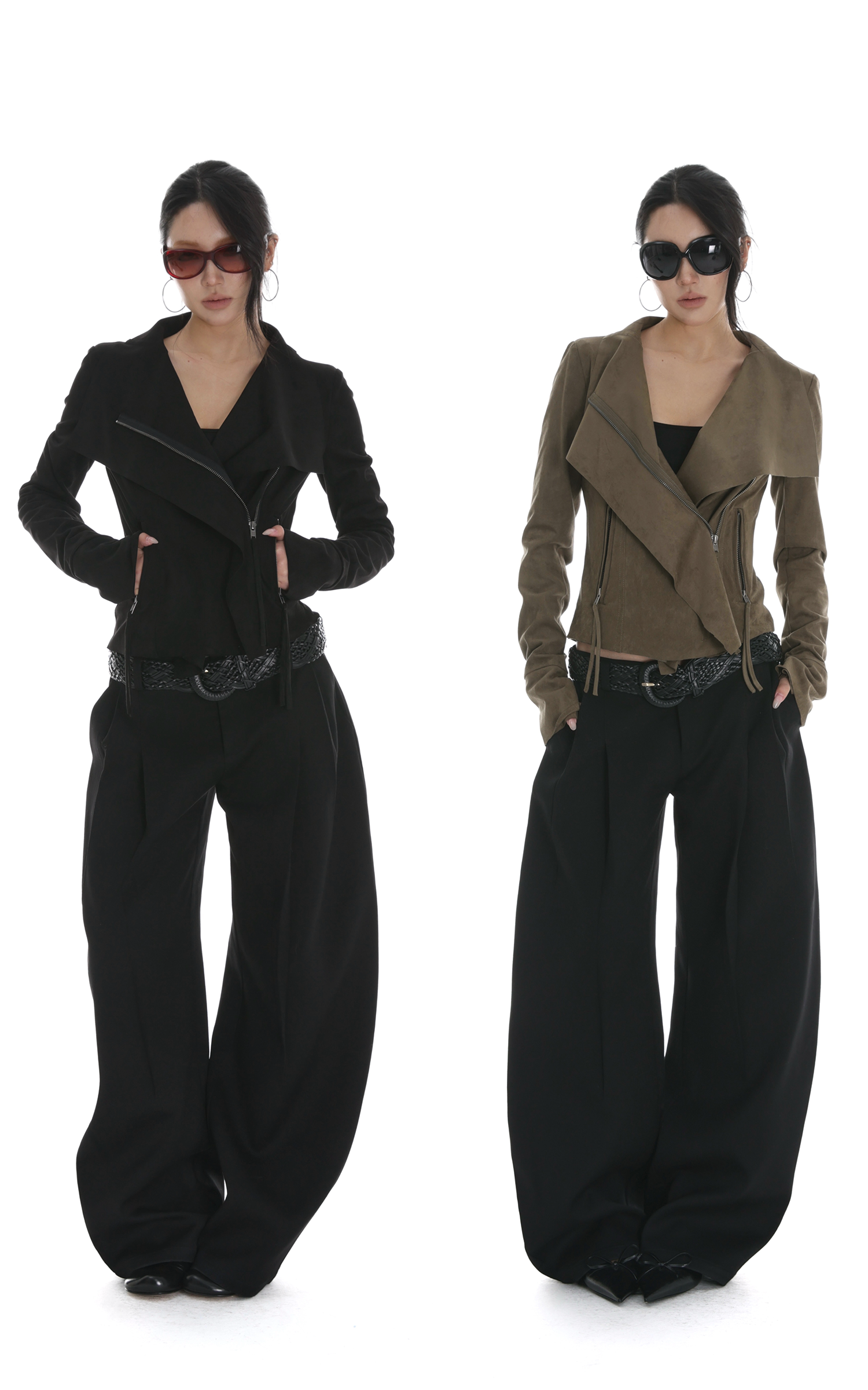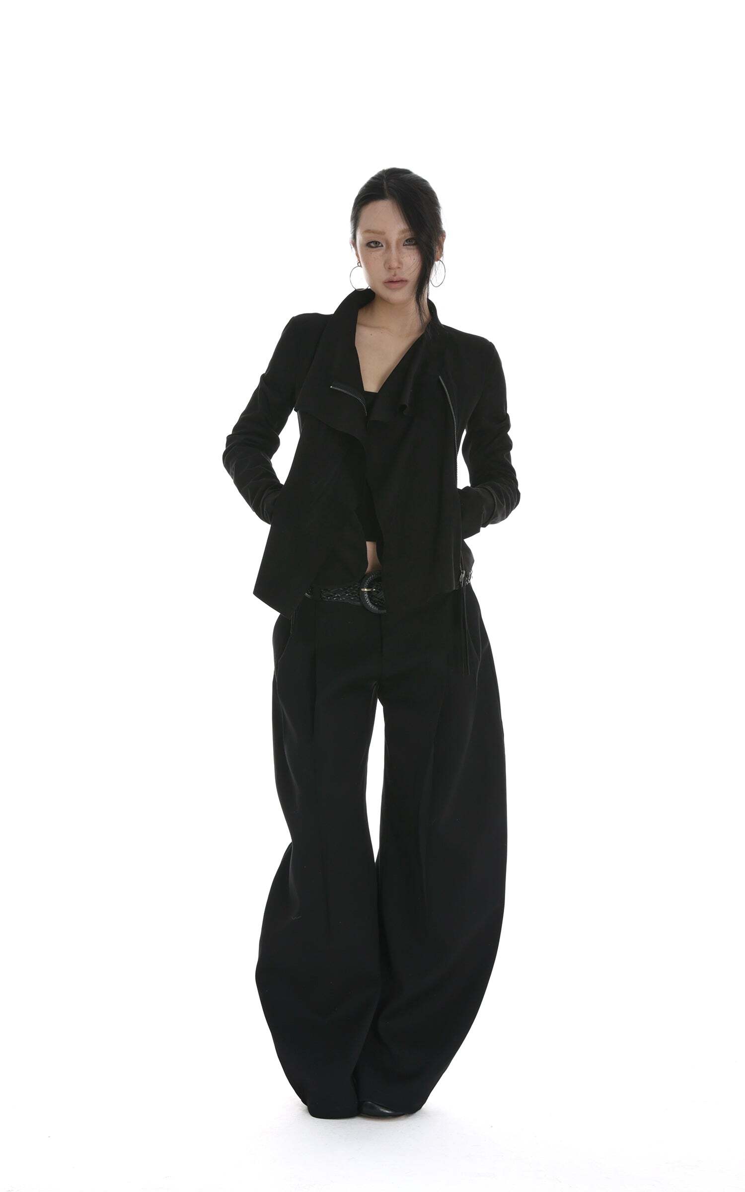 A sharp cropped moto jacket cut from soft suede-touch fabric with an asymmetric front zip. Fitted through the body with structured seams, flared cuffs, and a draped collar that can be styled open or closed. The sleek silhouette pairs effortlessly with oversized trousers or a mini skirt for a bold off-duty look.
