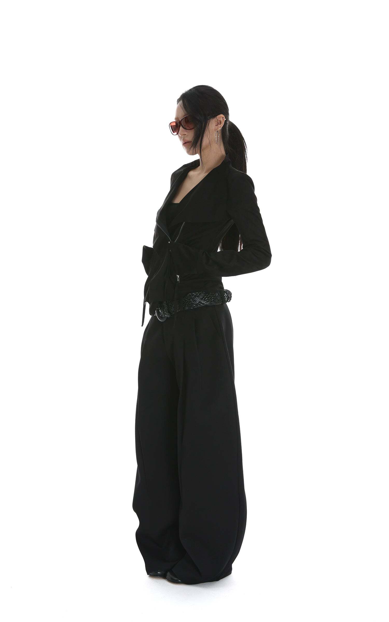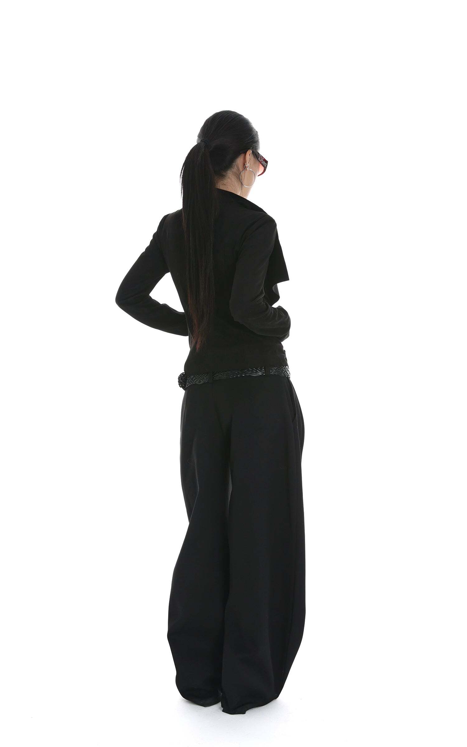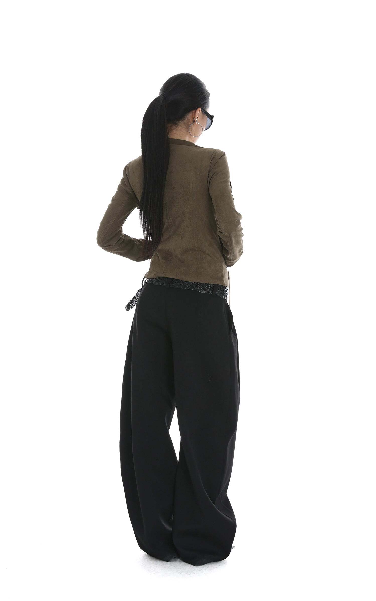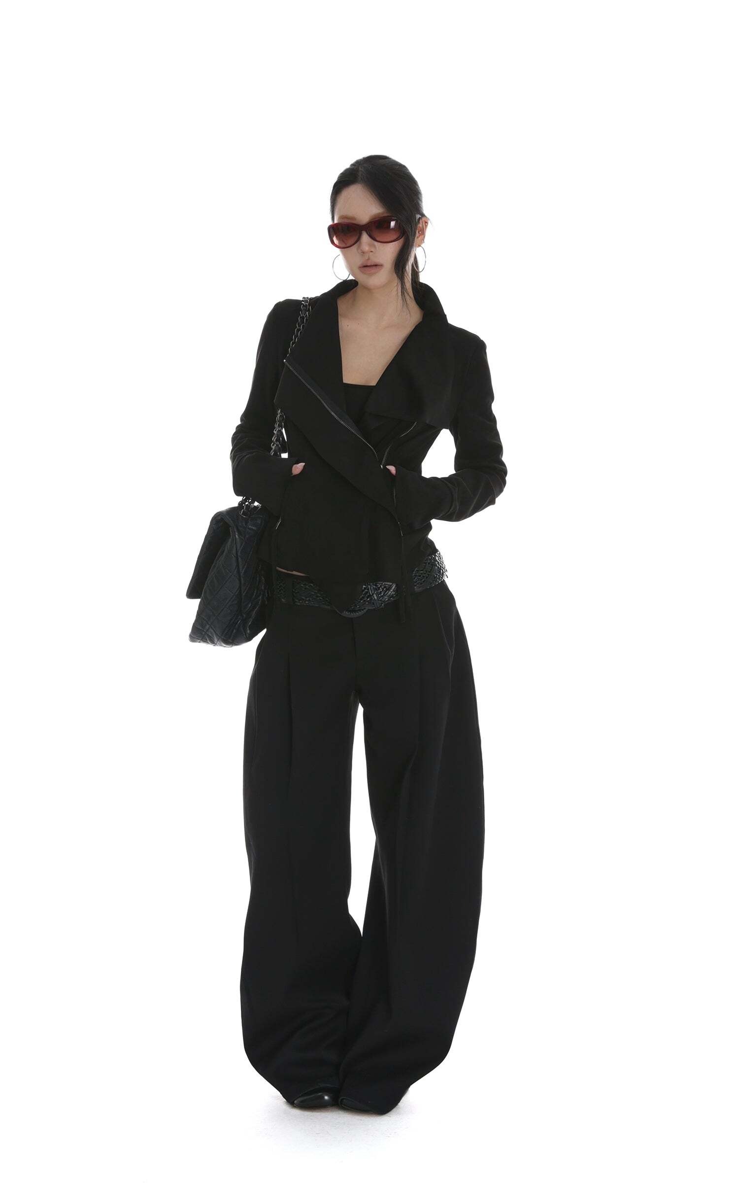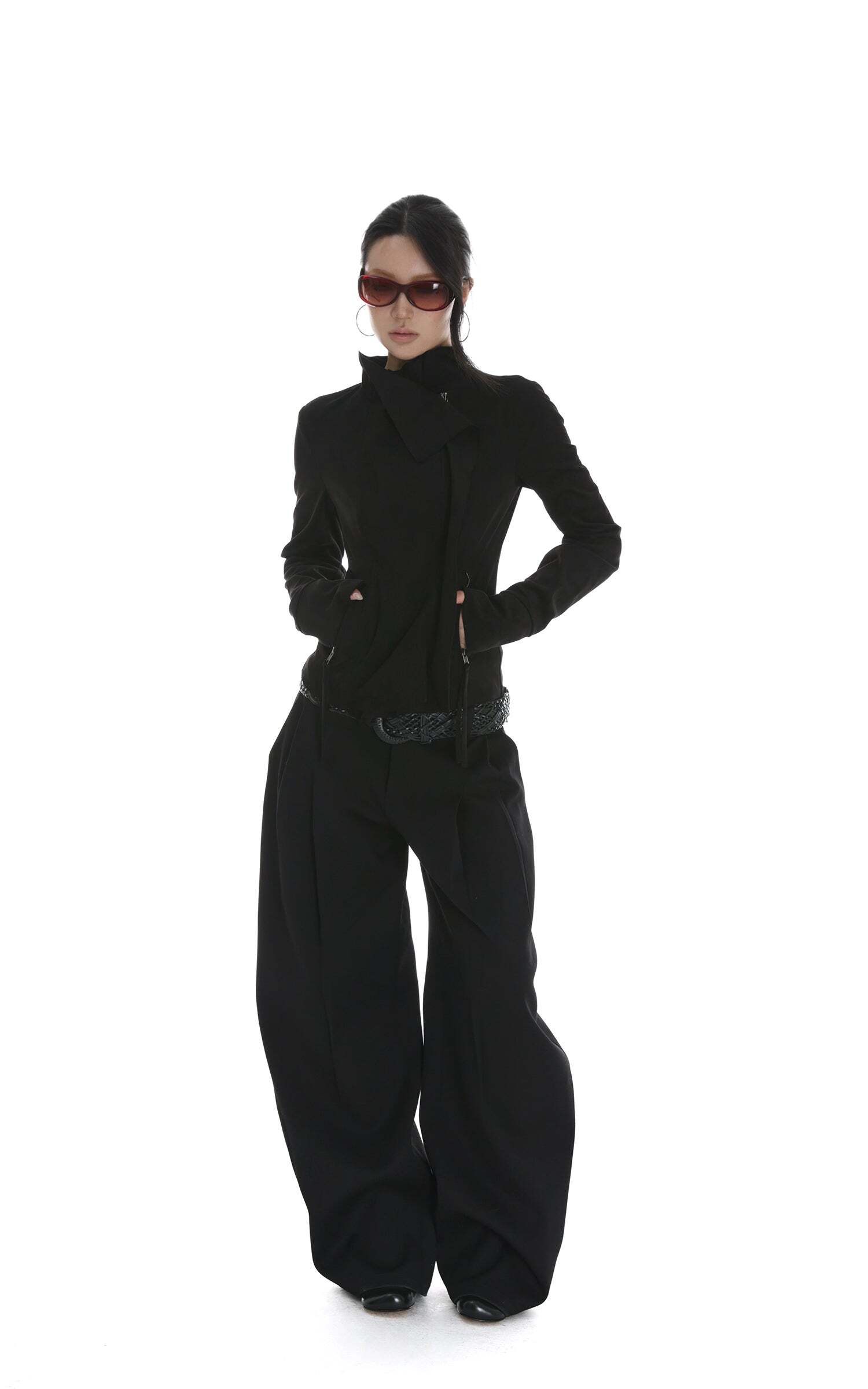 A sharp cropped moto jacket cut from soft suede-touch fabric with an asymmetric front zip. Fitted through the body with structured seams, flared cuffs, and a draped collar that can be styled open or closed. The sleek silhouette pairs effortlessly with oversized trousers or a mini skirt for a bold off-duty look.