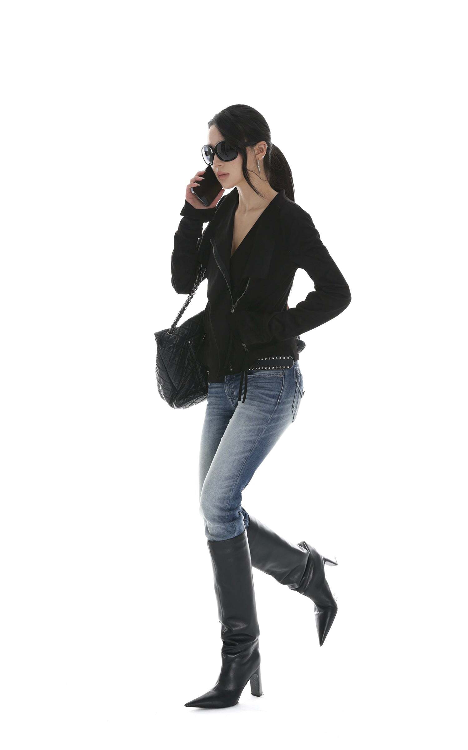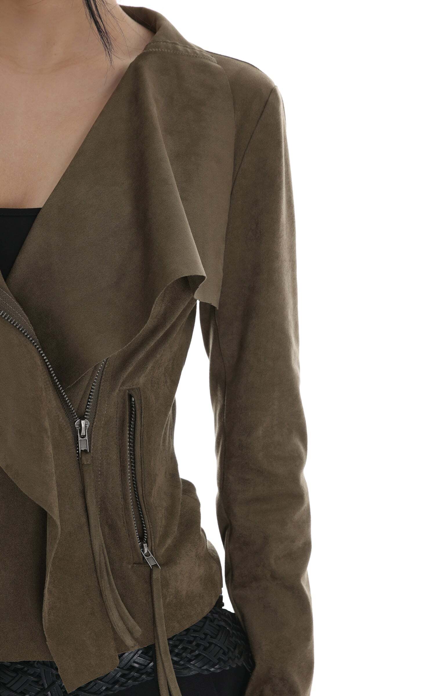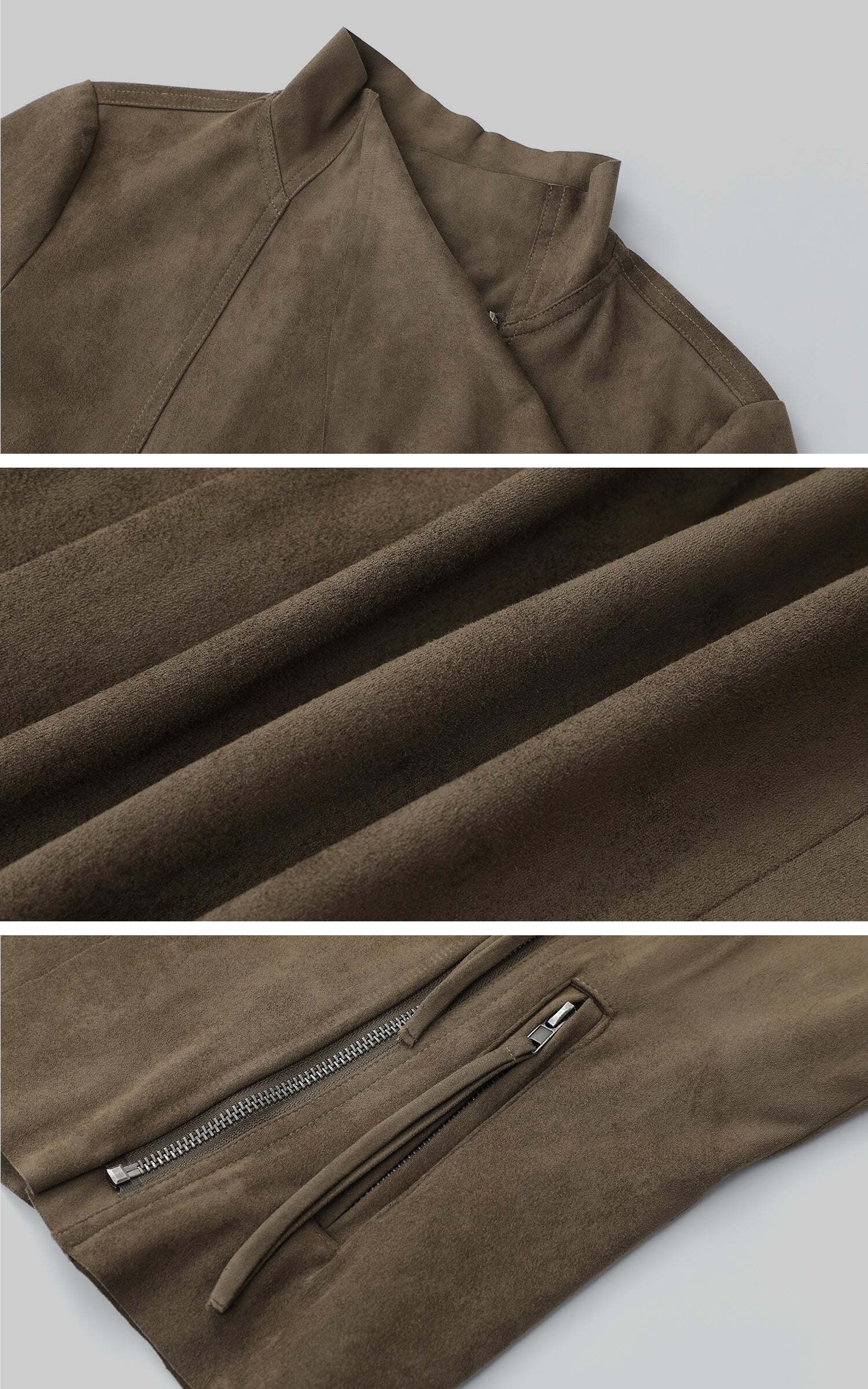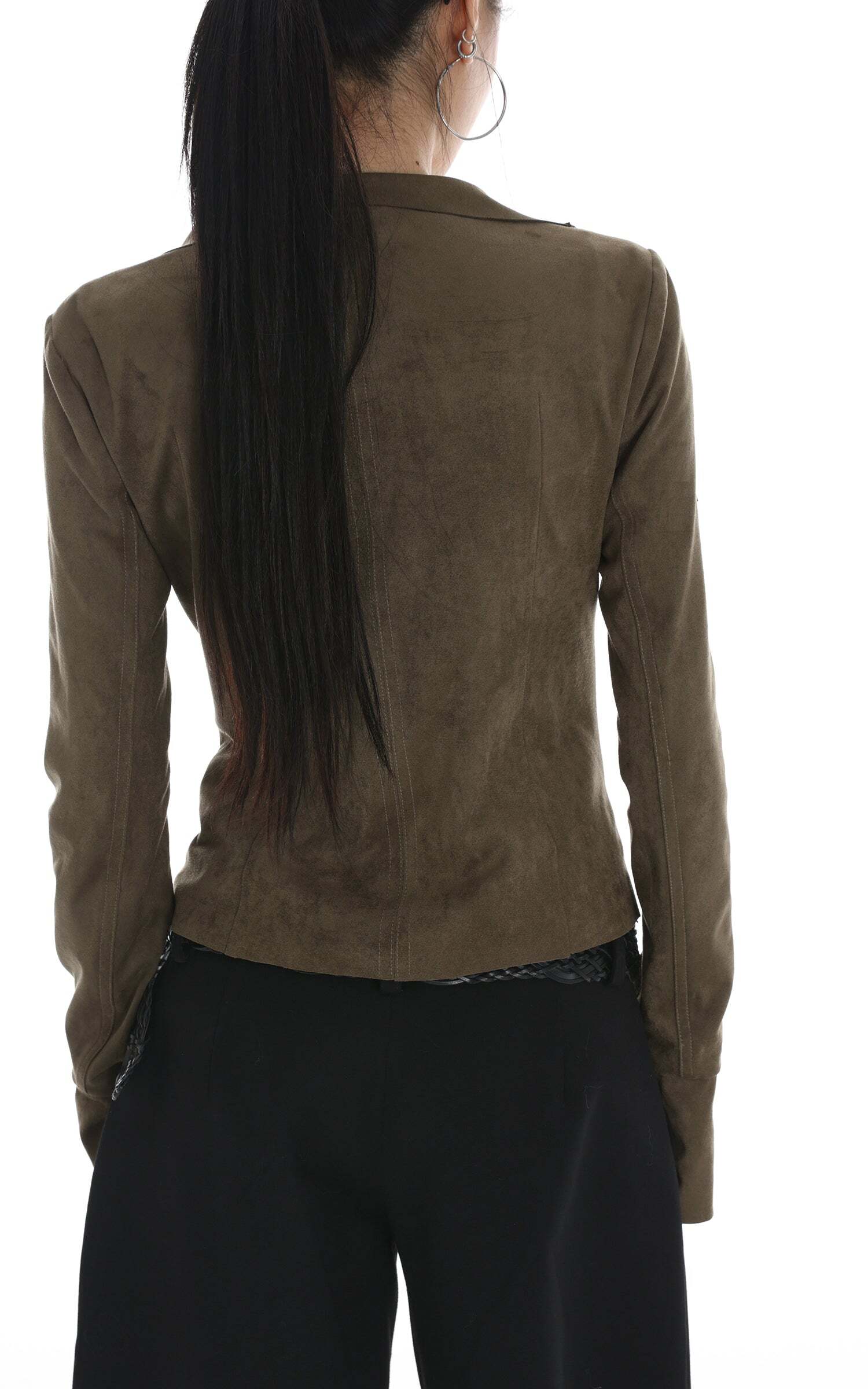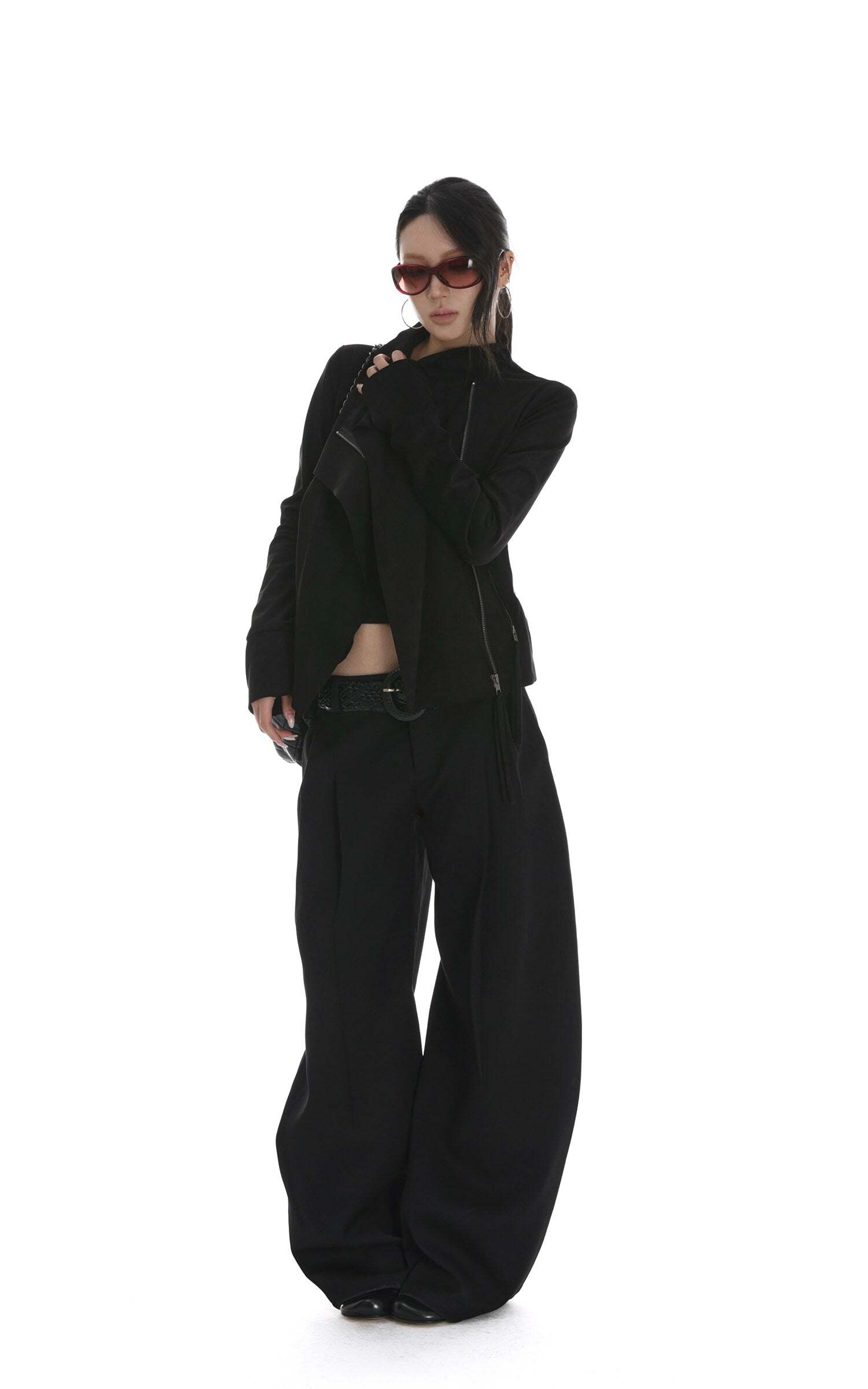 A sharp cropped moto jacket cut from soft suede-touch fabric with an asymmetric front zip. Fitted through the body with structured seams, flared cuffs, and a draped collar that can be styled open or closed. The sleek silhouette pairs effortlessly with oversized trousers or a mini skirt for a bold off-duty look.