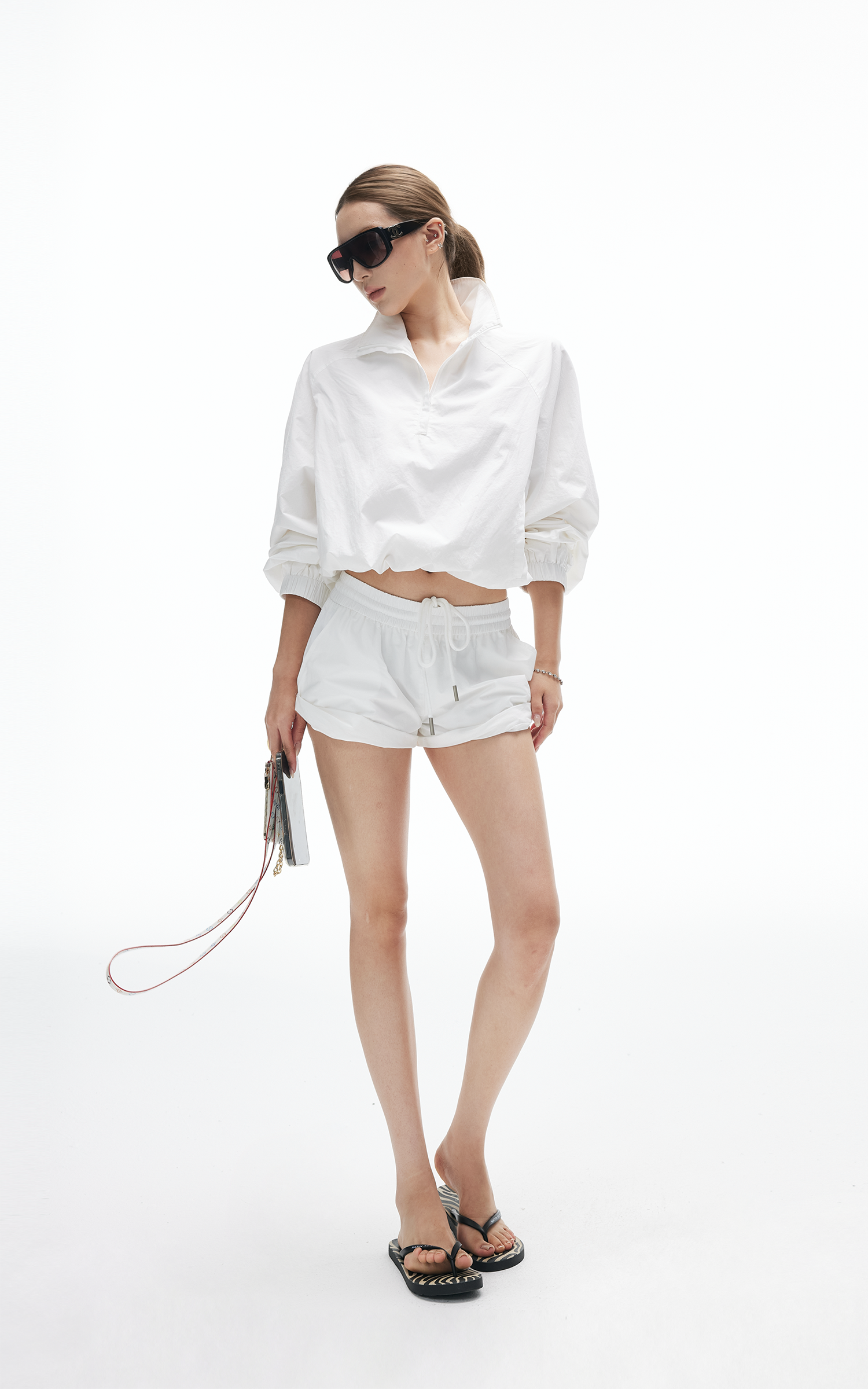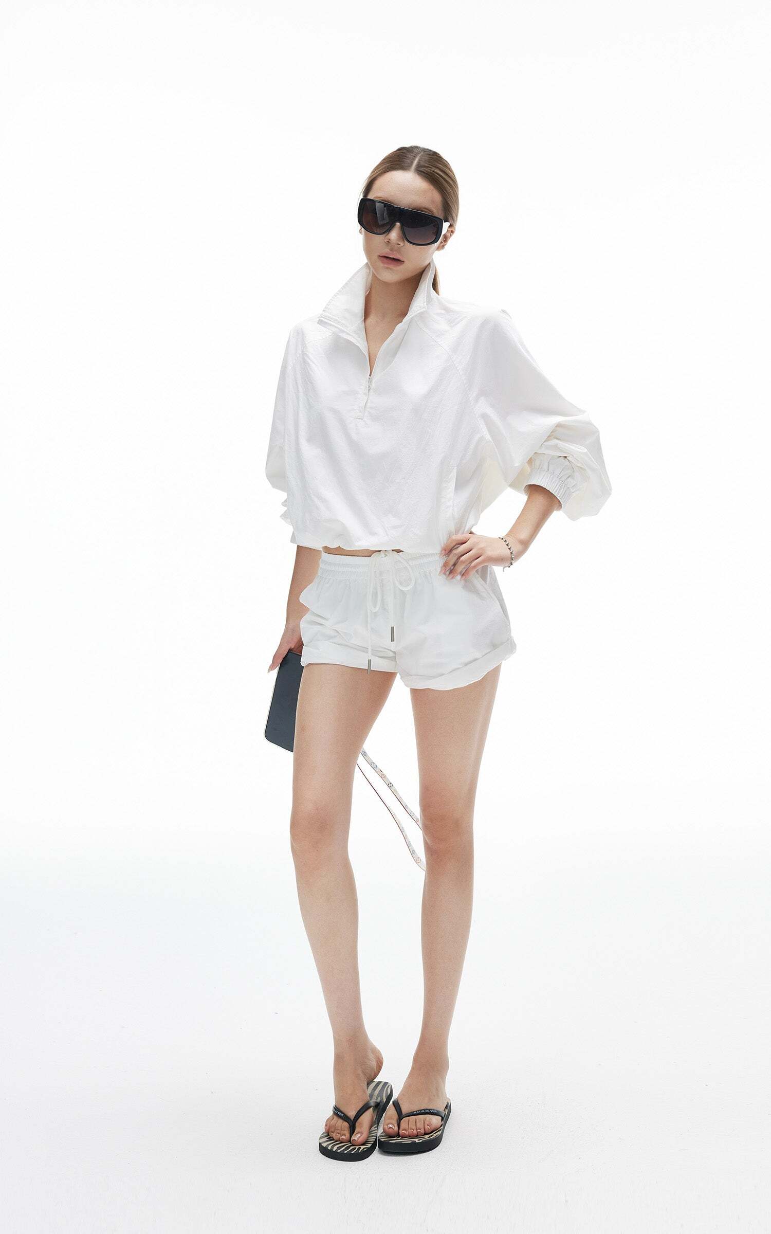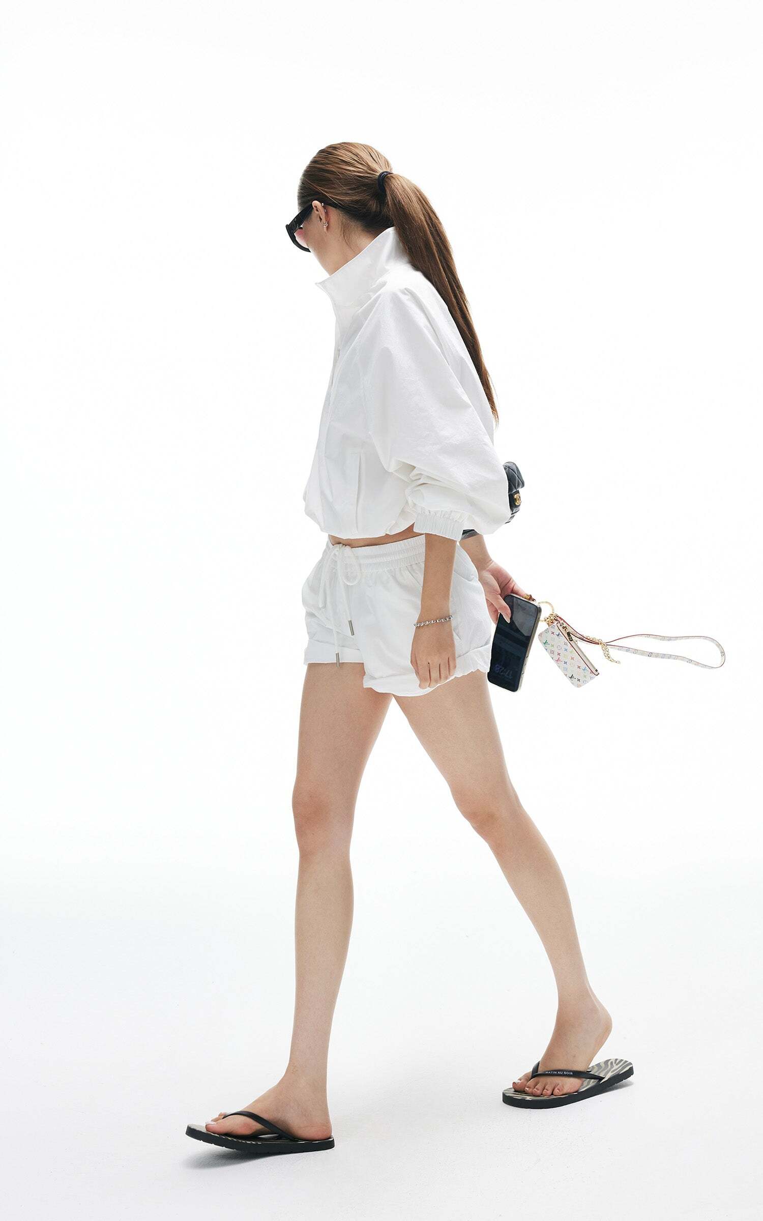 Effortlessly cool, this two-piece set features a cropped zip-up windbreaker and lightweight drawstring shorts. The jacket comes with an easy high collar and elastic cuffs for a relaxed street fit, while the shorts are designed with a flexible waistband and curved hem for comfort. Perfect for casual days, coffee runs, or layering with sneakers and slides, this set delivers sporty vibes with a laid-back edge.