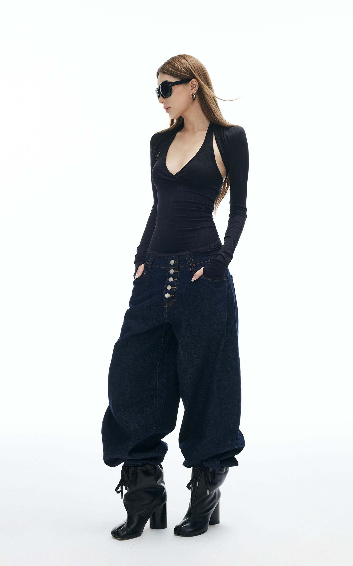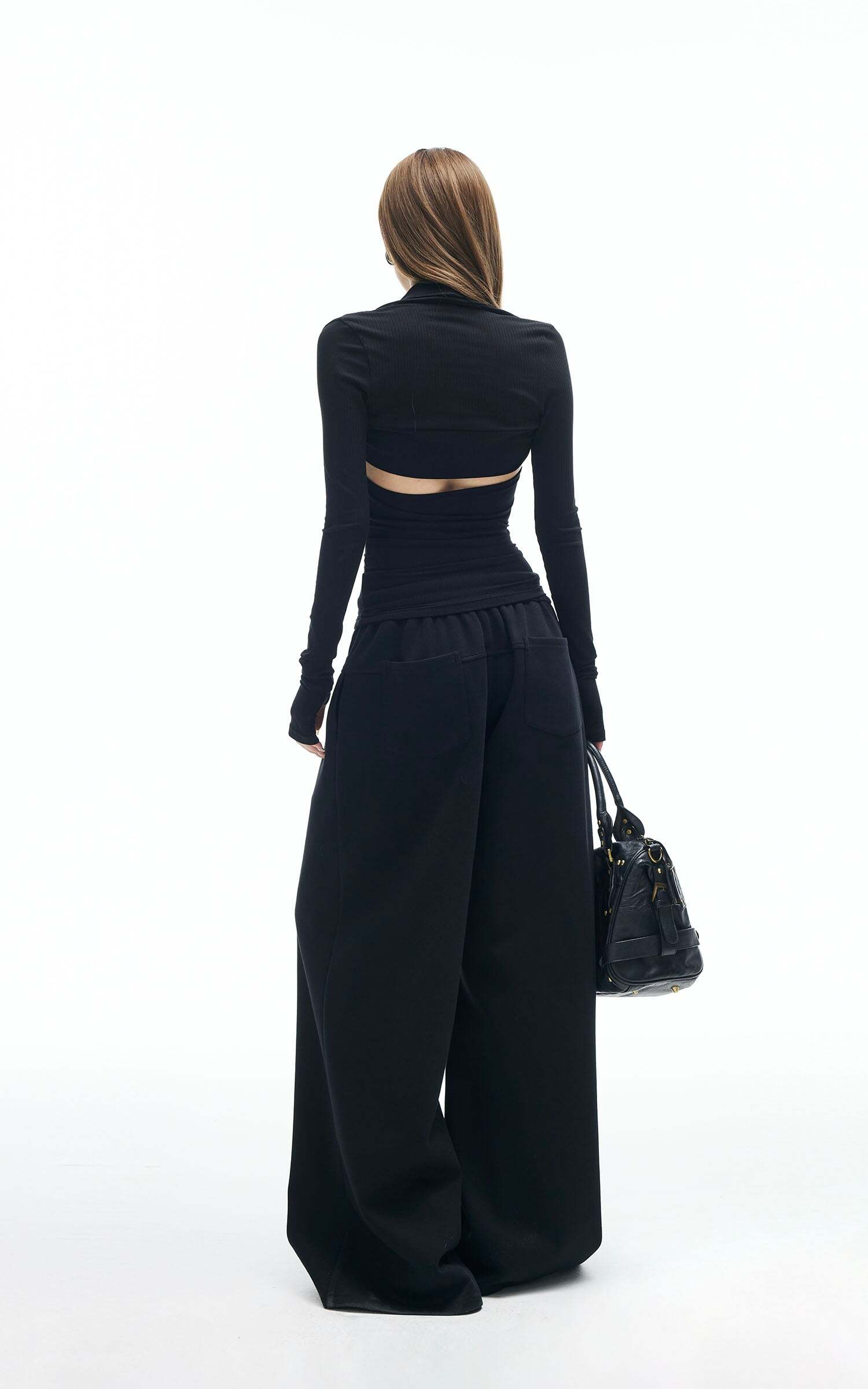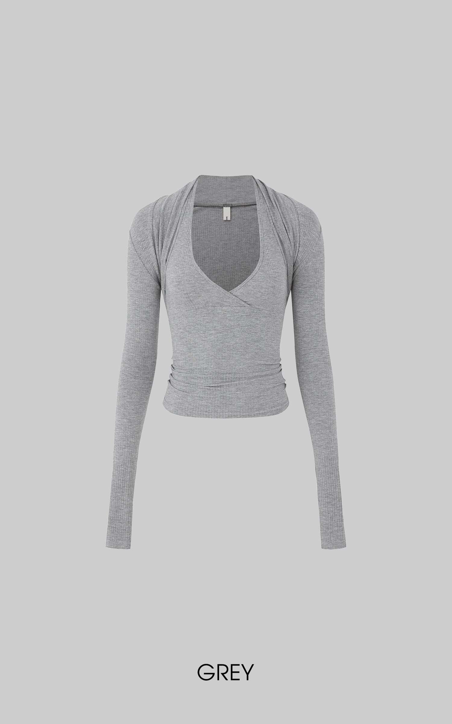 Effortlessly bold yet easy to style, this halter cut-out top with attached sleeves is made from soft ribbed knit that hugs your frame. The plunging neckline and slim fit add an edge, while the detachable shrug-inspired sleeves bring layering vibes. Dress it up with wide-leg denim or keep it lowkey with track pants—the versatile piece transitions from day to night with a playful attitude.