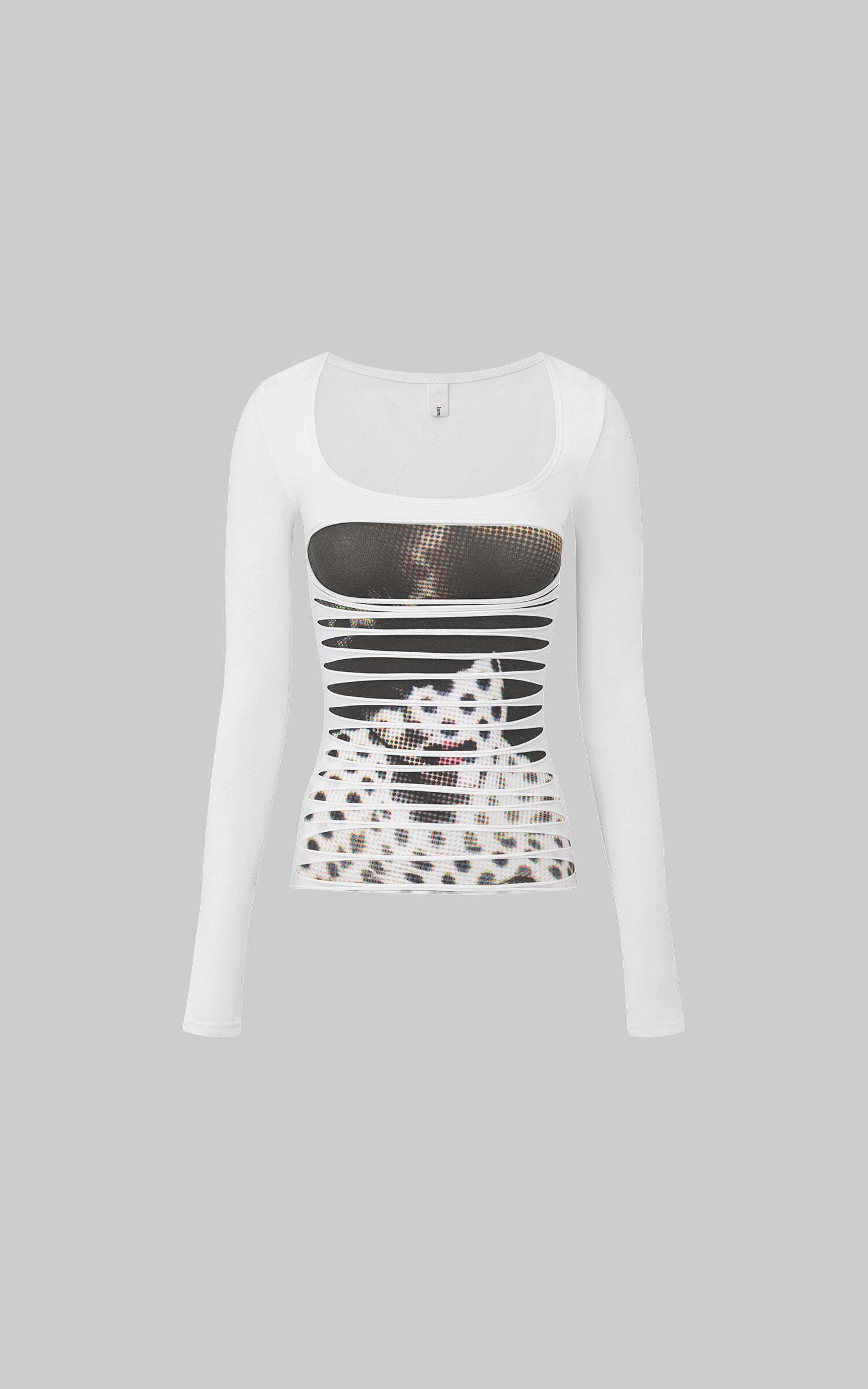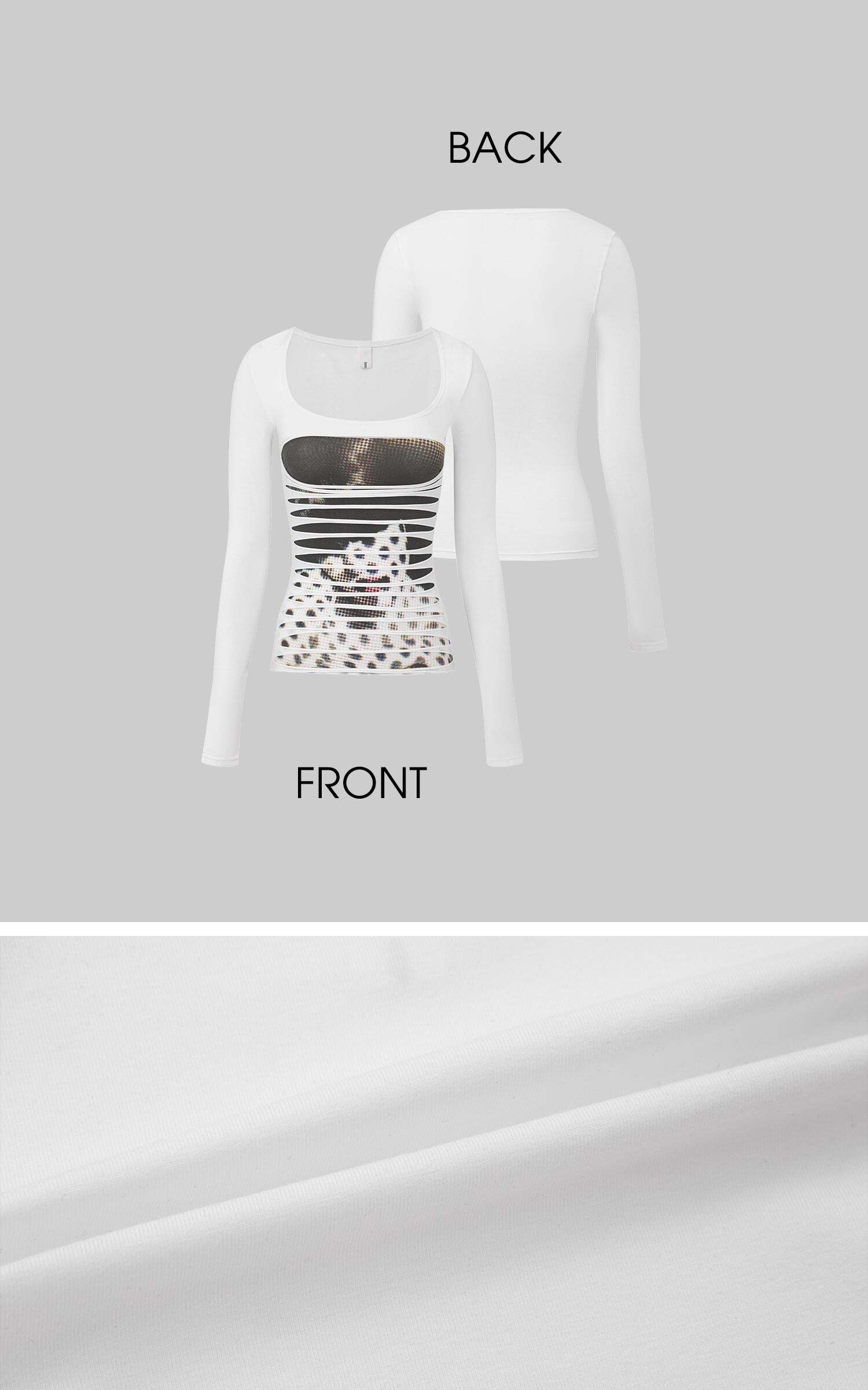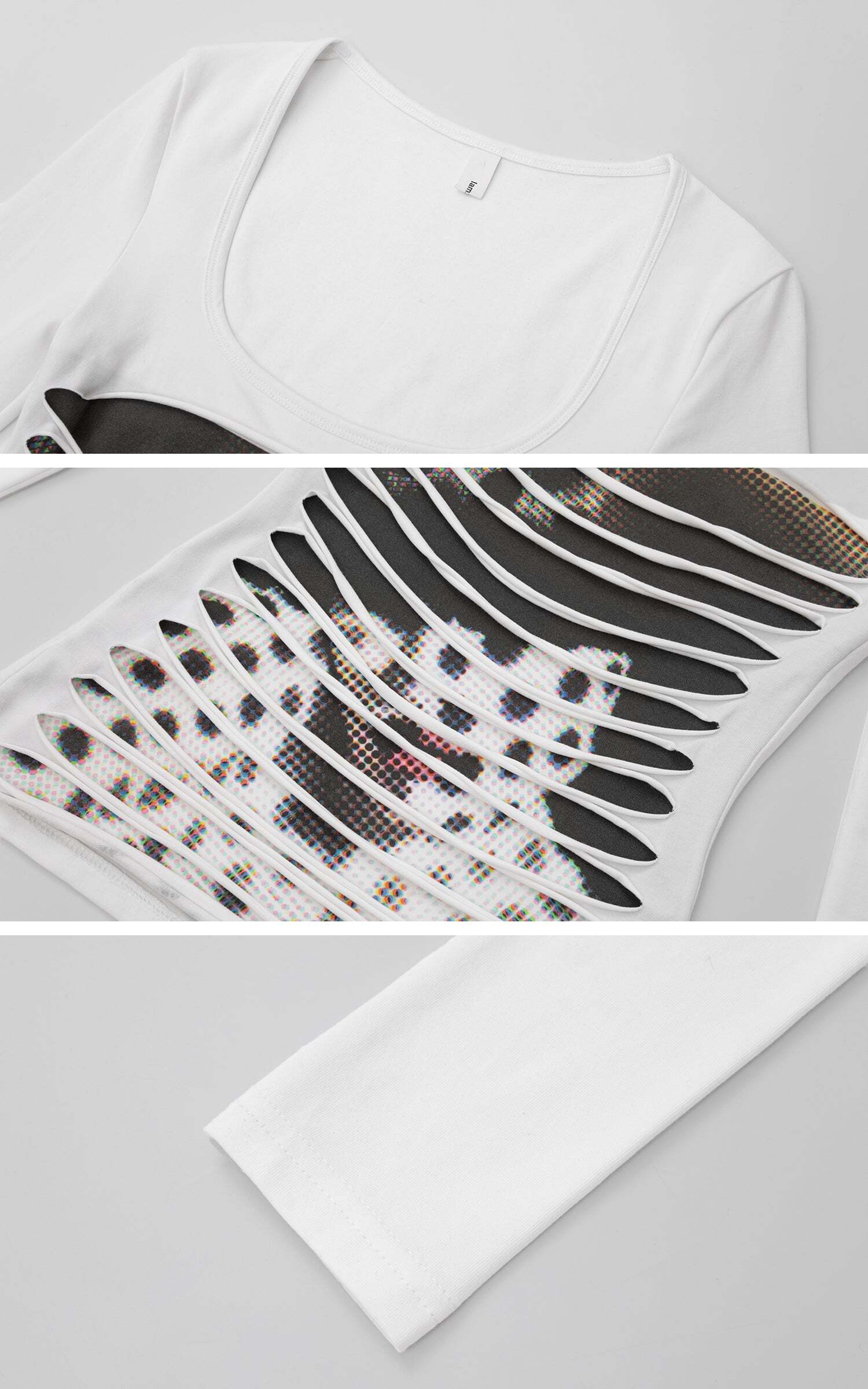 Turn heads with this bold cut-out long sleeve top, crafted in a slim silhouette that highlights the body. The edgy laser-sliced front reveals a playful graphic print underneath, fusing streetwear energy with futuristic vibes. Soft stretch fabric keeps it fitted yet comfortable, perfect for pairing with wide-leg pants, mini skirts, or layered under jackets. A daring piece that pushes everyday styling into statement territory.