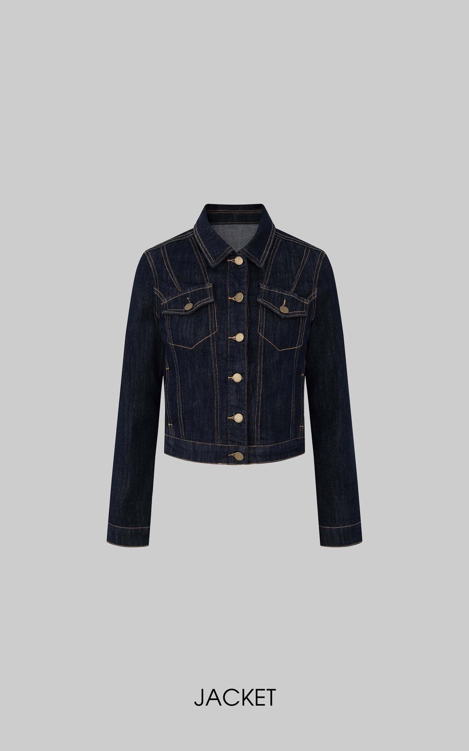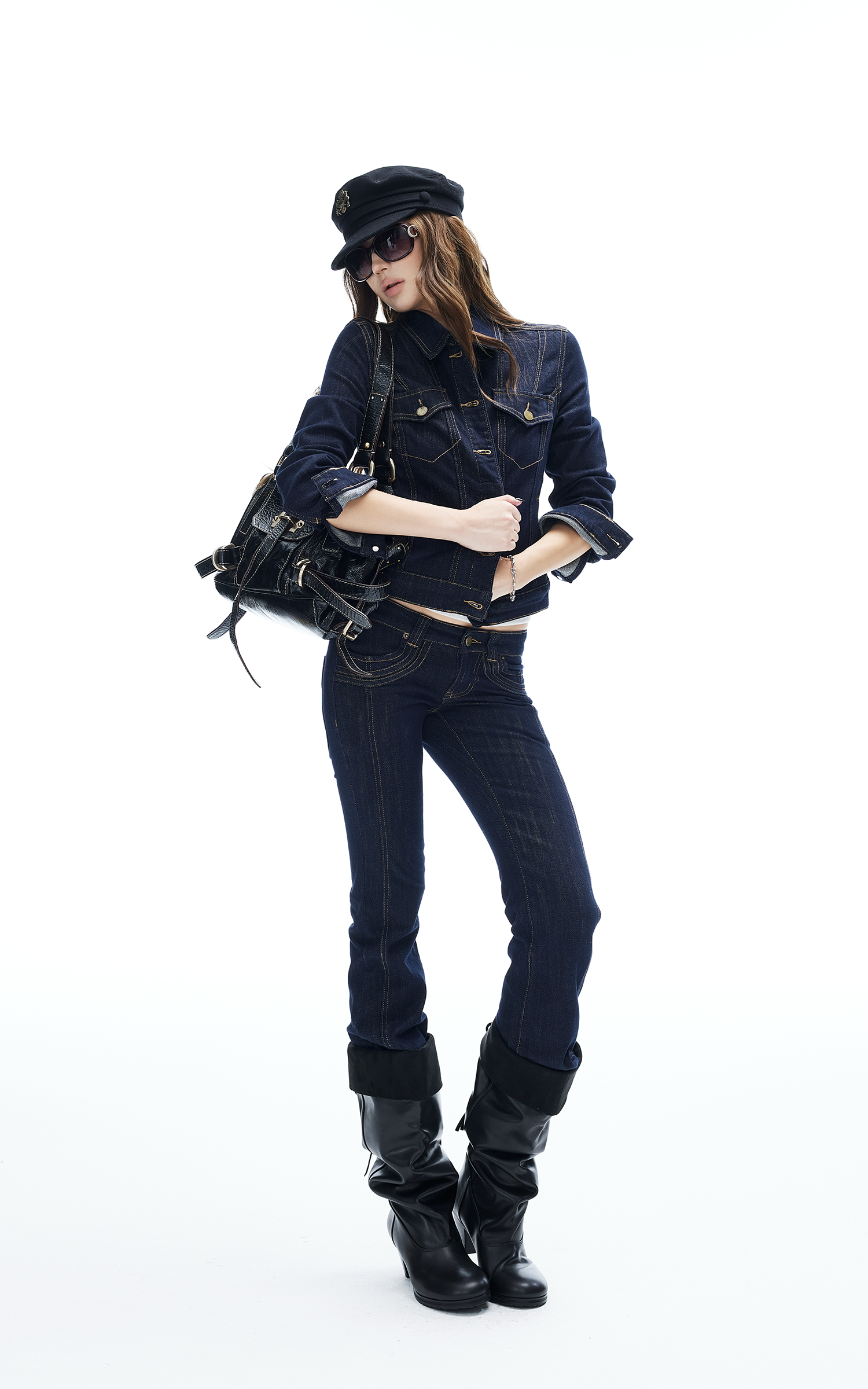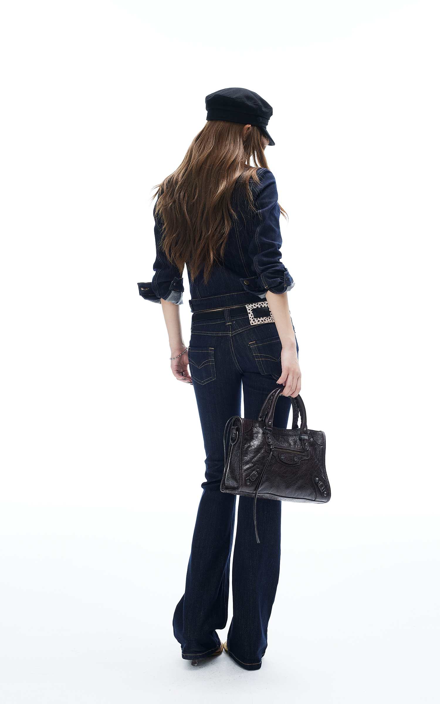 Dark-wash denim with a retro edge—this matching set pairs a cropped jacket with structured seams and gold-tone buttons with flared jeans that hug the hips before falling loose at the hem. A playful patch detail at the back adds attitude, while the tailored fit keeps the look polished. Wear it together for a statement double-denim moment or mix and match with your everyday staples.