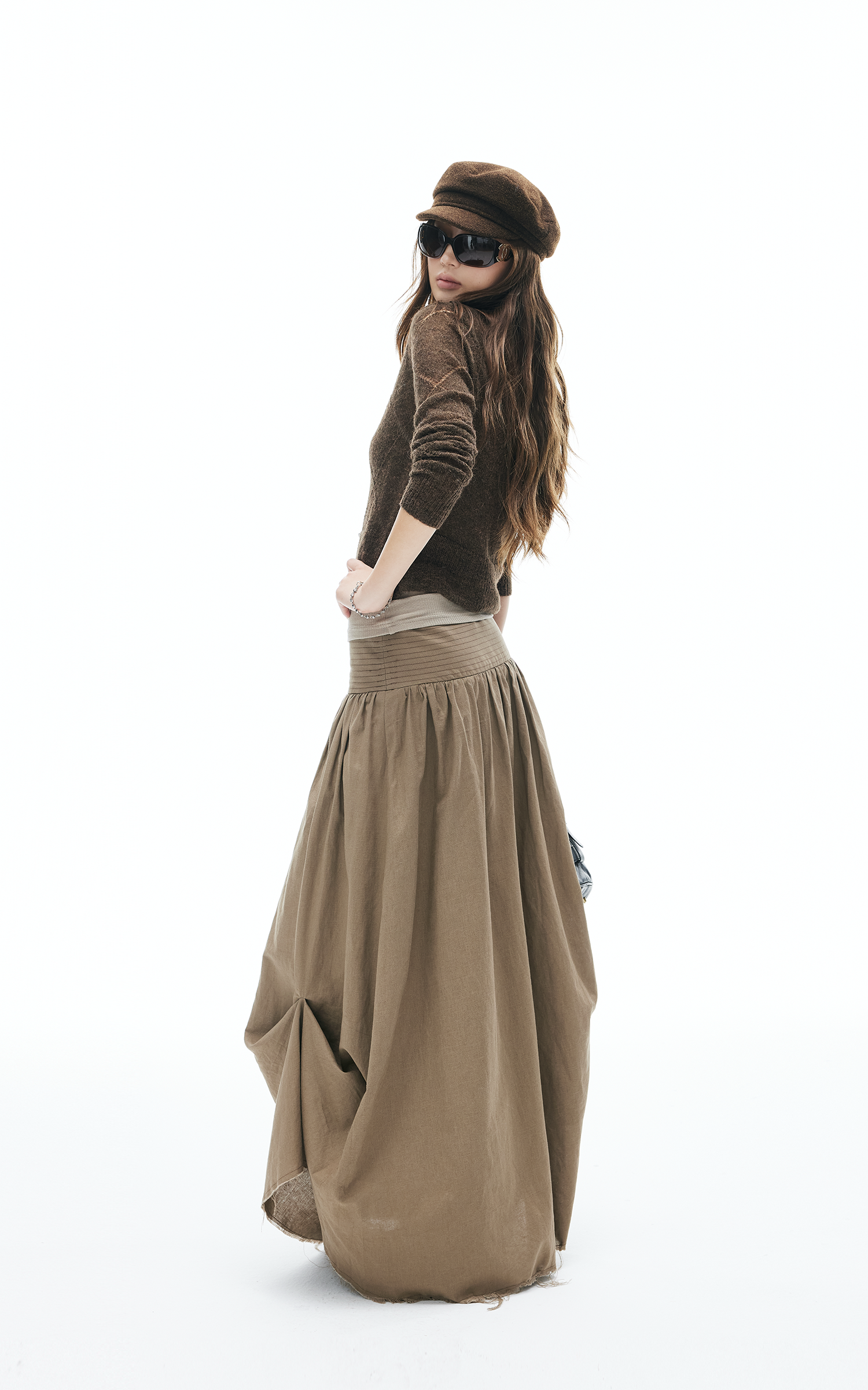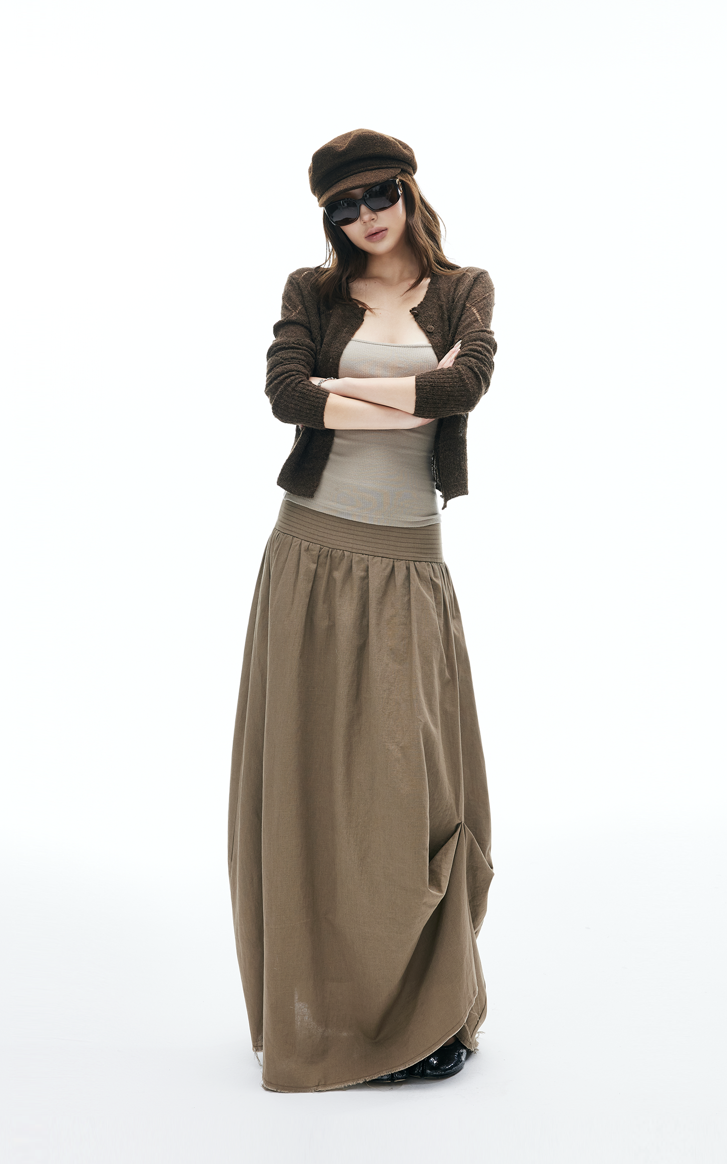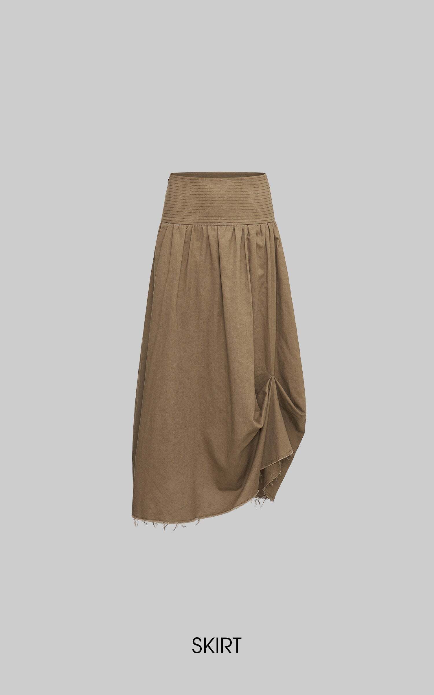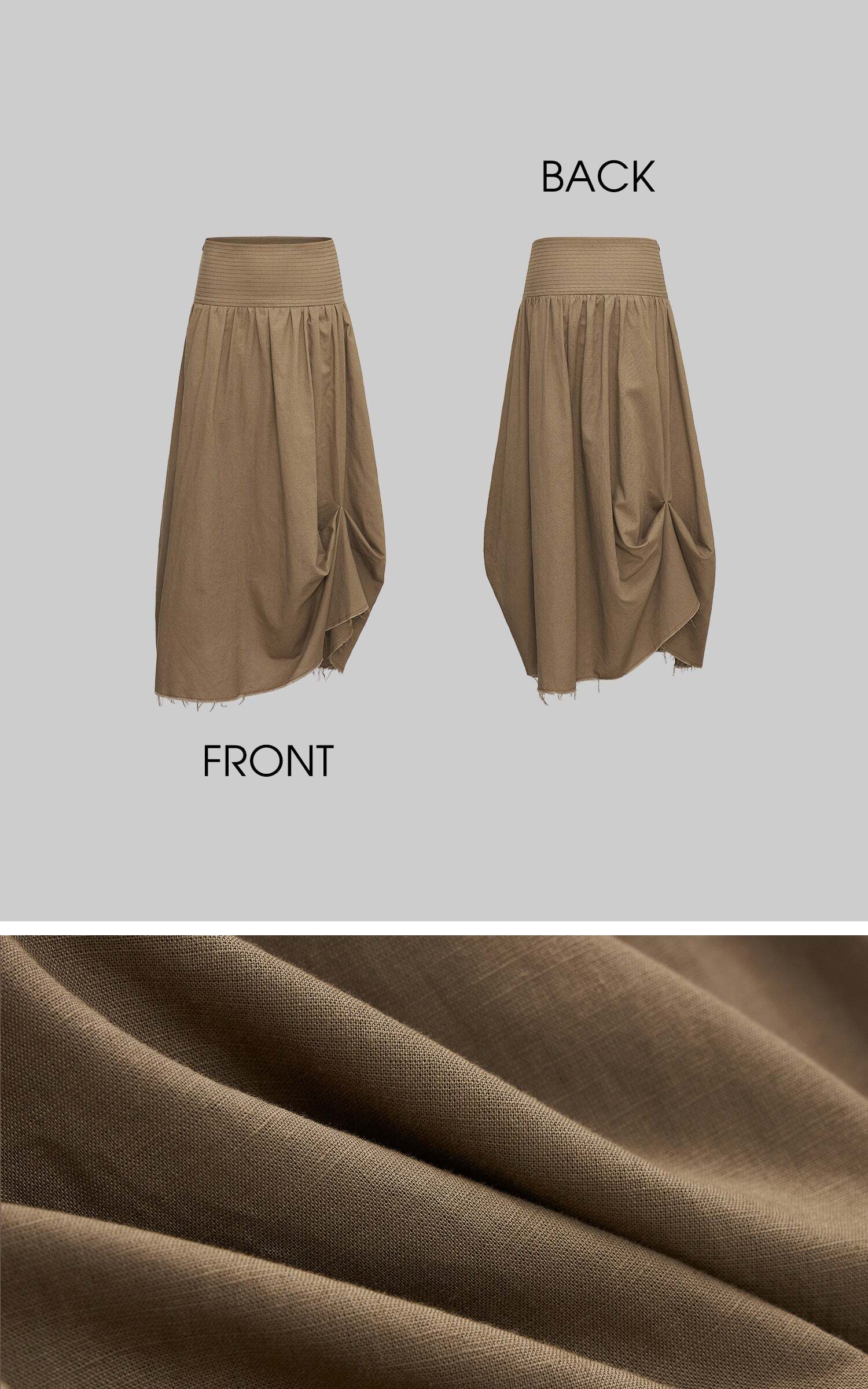 This maxi skirt blends effortless flow with deconstructed details. Designed with a wide ruched waistband, asymmetric draping, and raw-cut hem, it moves with an undone yet polished energy. Lightweight fabric makes it easy to wear from daytime strolls to late-night layering. Pair with knits or tanks for a street-ready look that mixes edge and ease.