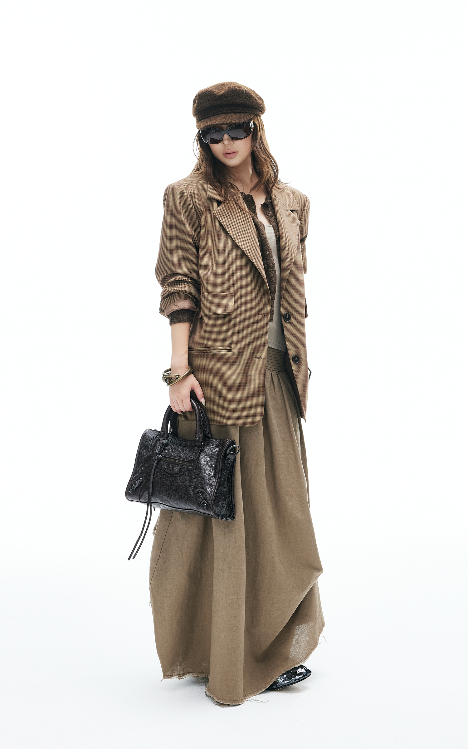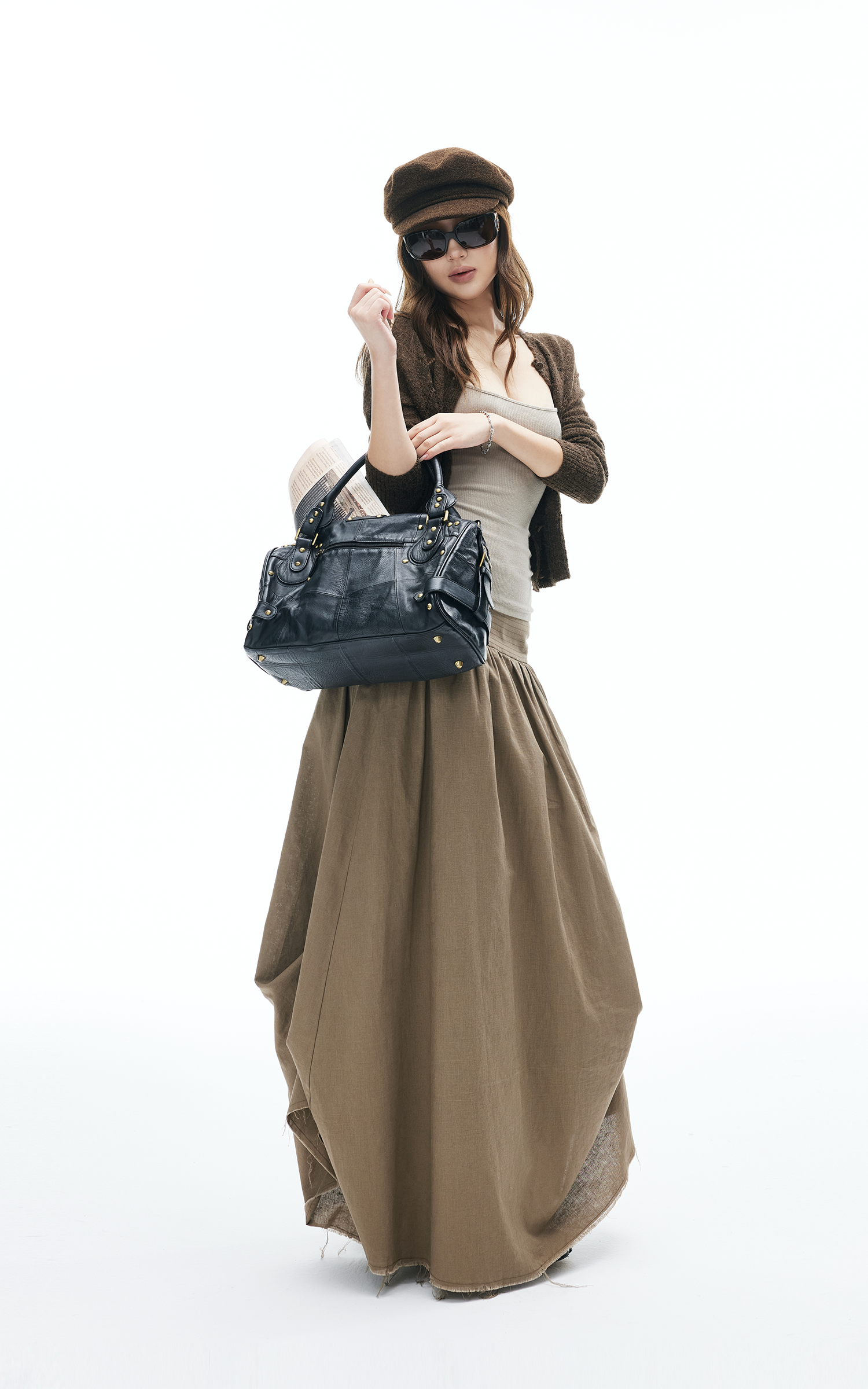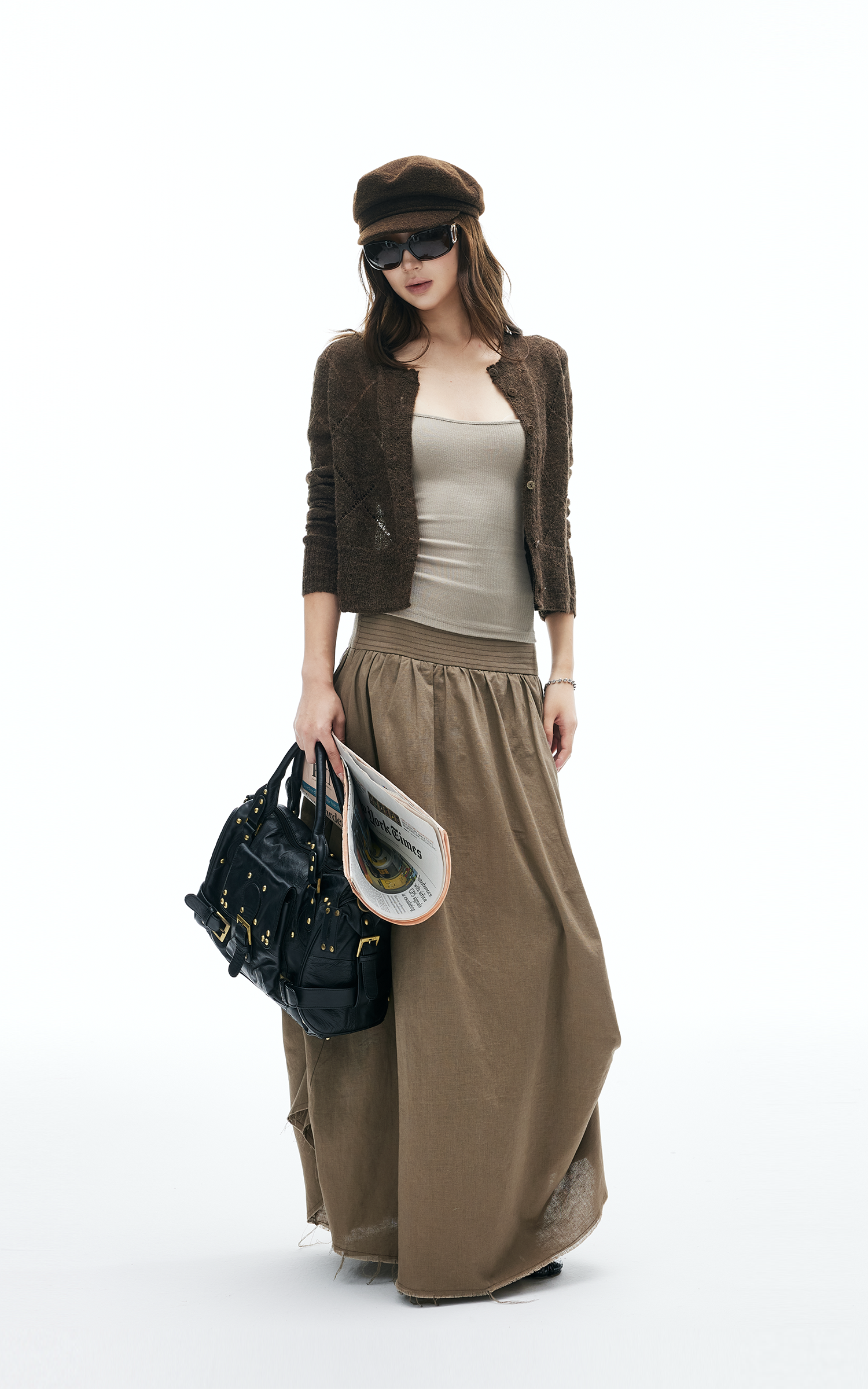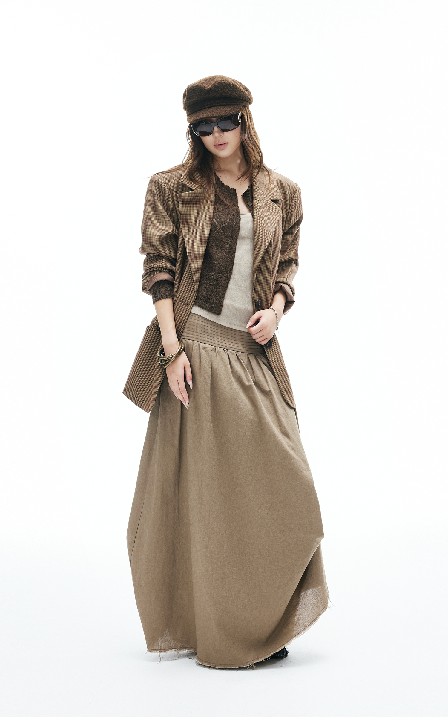 This maxi skirt blends effortless flow with deconstructed details. Designed with a wide ruched waistband, asymmetric draping, and raw-cut hem, it moves with an undone yet polished energy. Lightweight fabric makes it easy to wear from daytime strolls to late-night layering. Pair with knits or tanks for a street-ready look that mixes edge and ease.