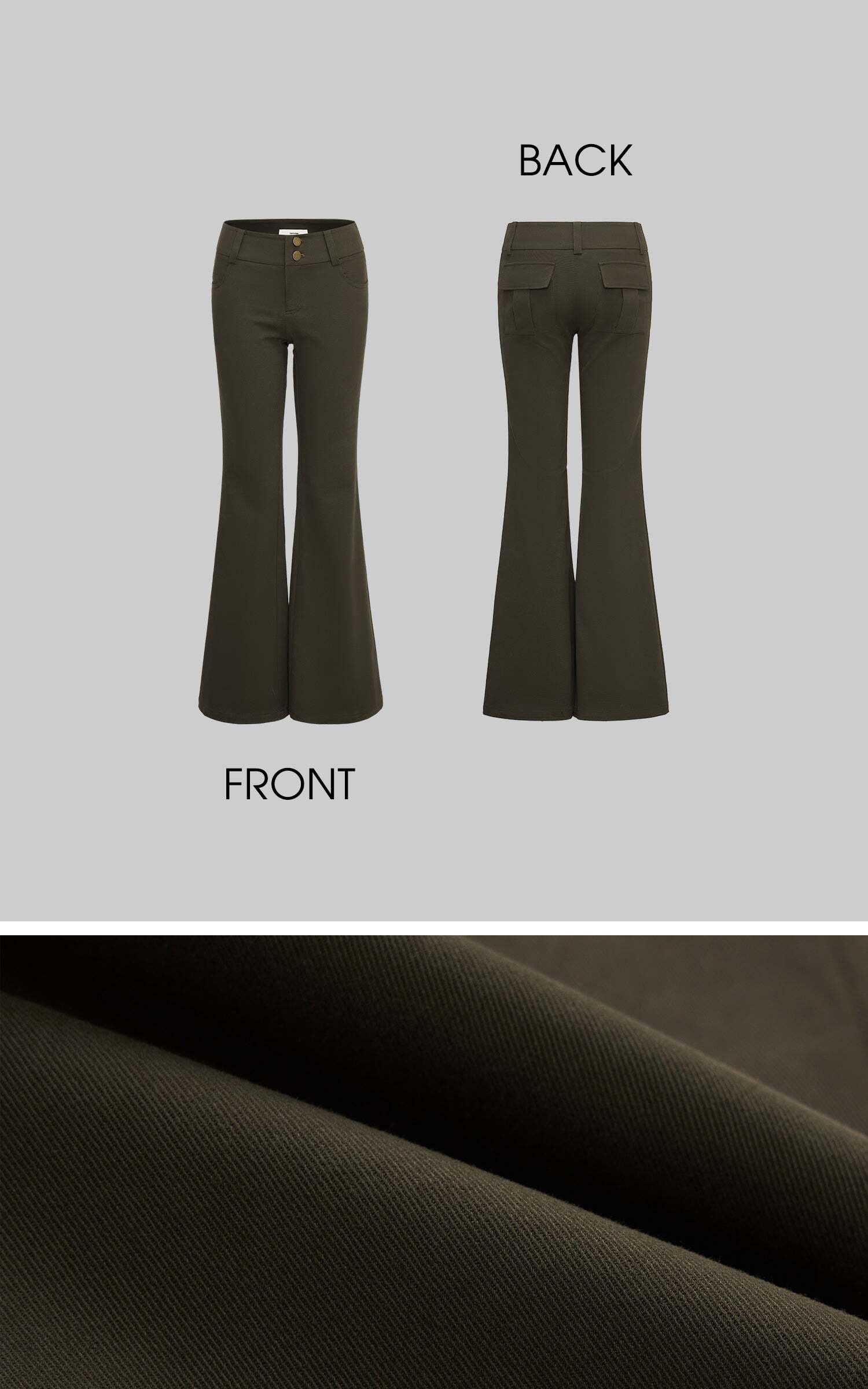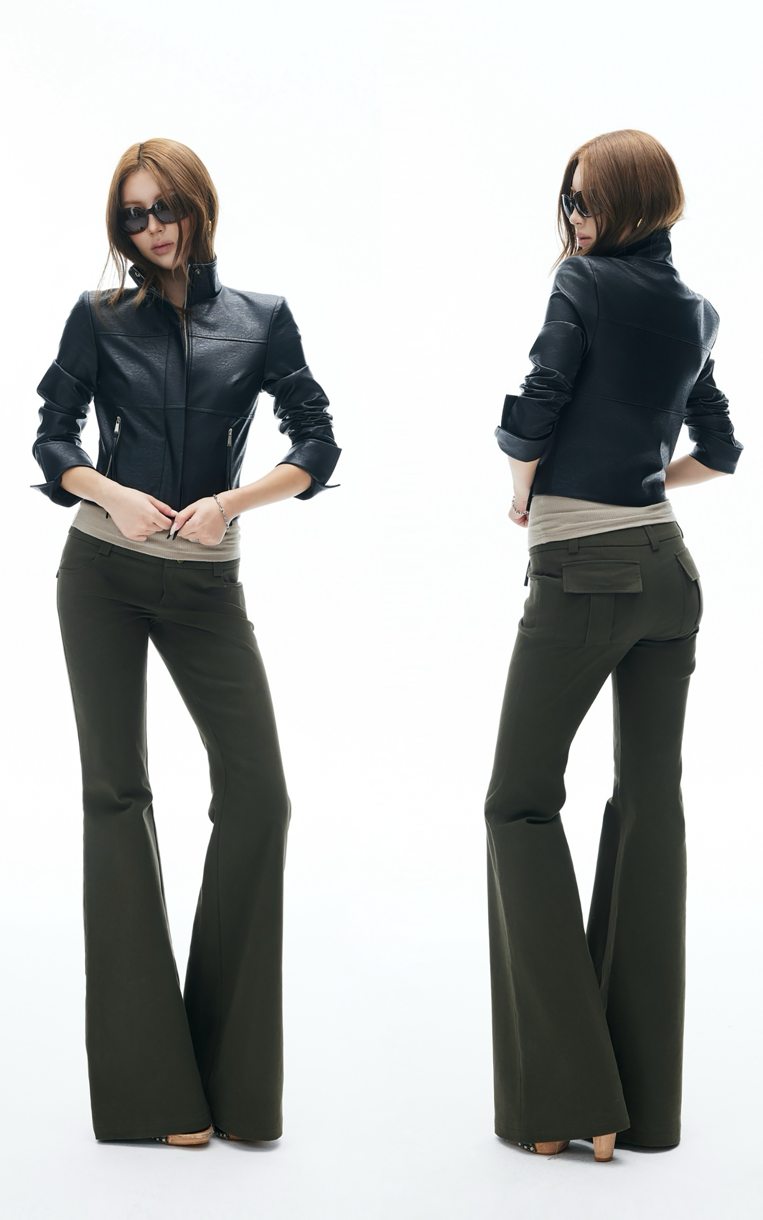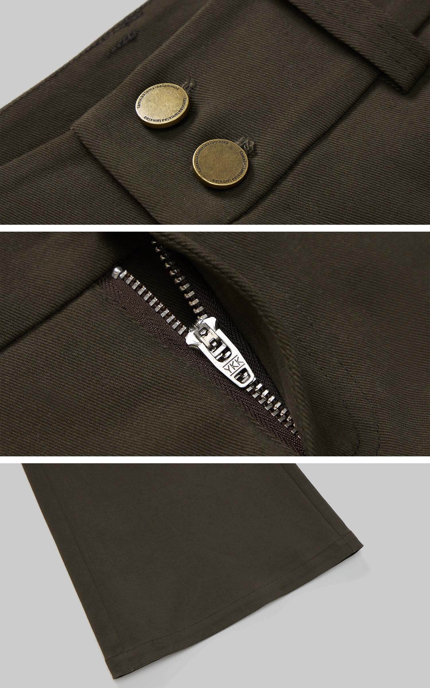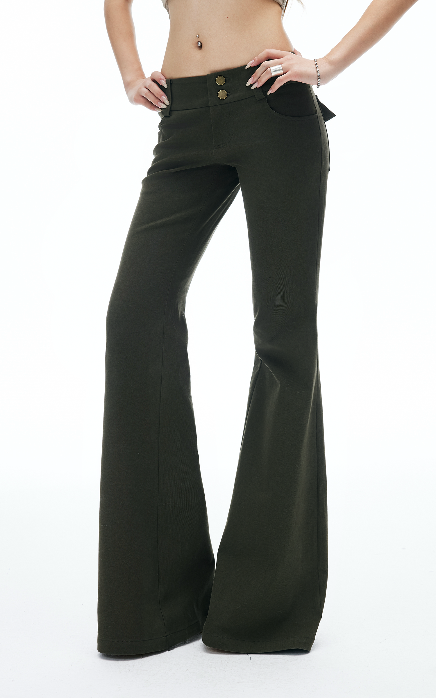 These flared casual pants bring a retro yet sleek vibe with their double-button high waist and streamlined silhouette. Designed in a rich olive green tone, the stretch fabric hugs the hips while the wide flared hem elongates the legs. Finished with classic pocket details and a clean front zip, they’re perfect for pairing with fitted tops, cropped jackets, or oversized knits for an easy street-to-night transition.