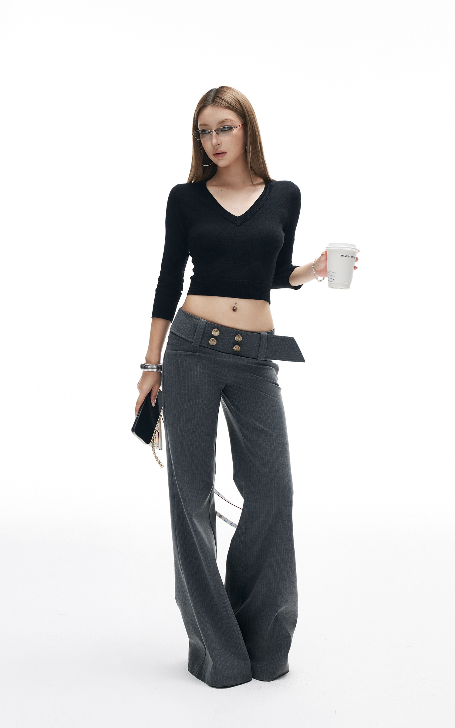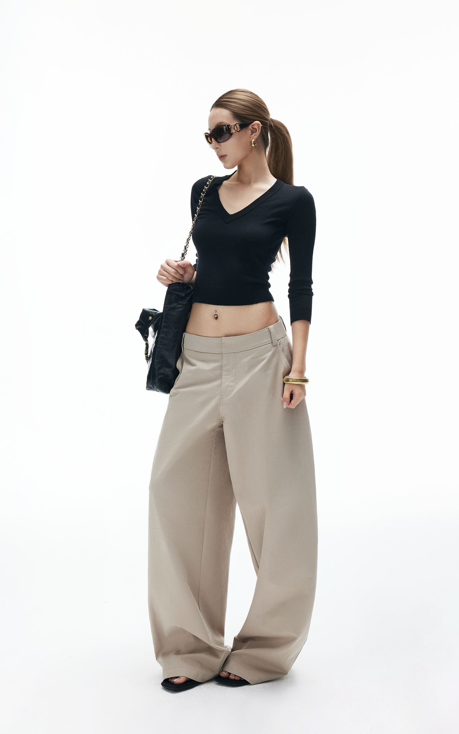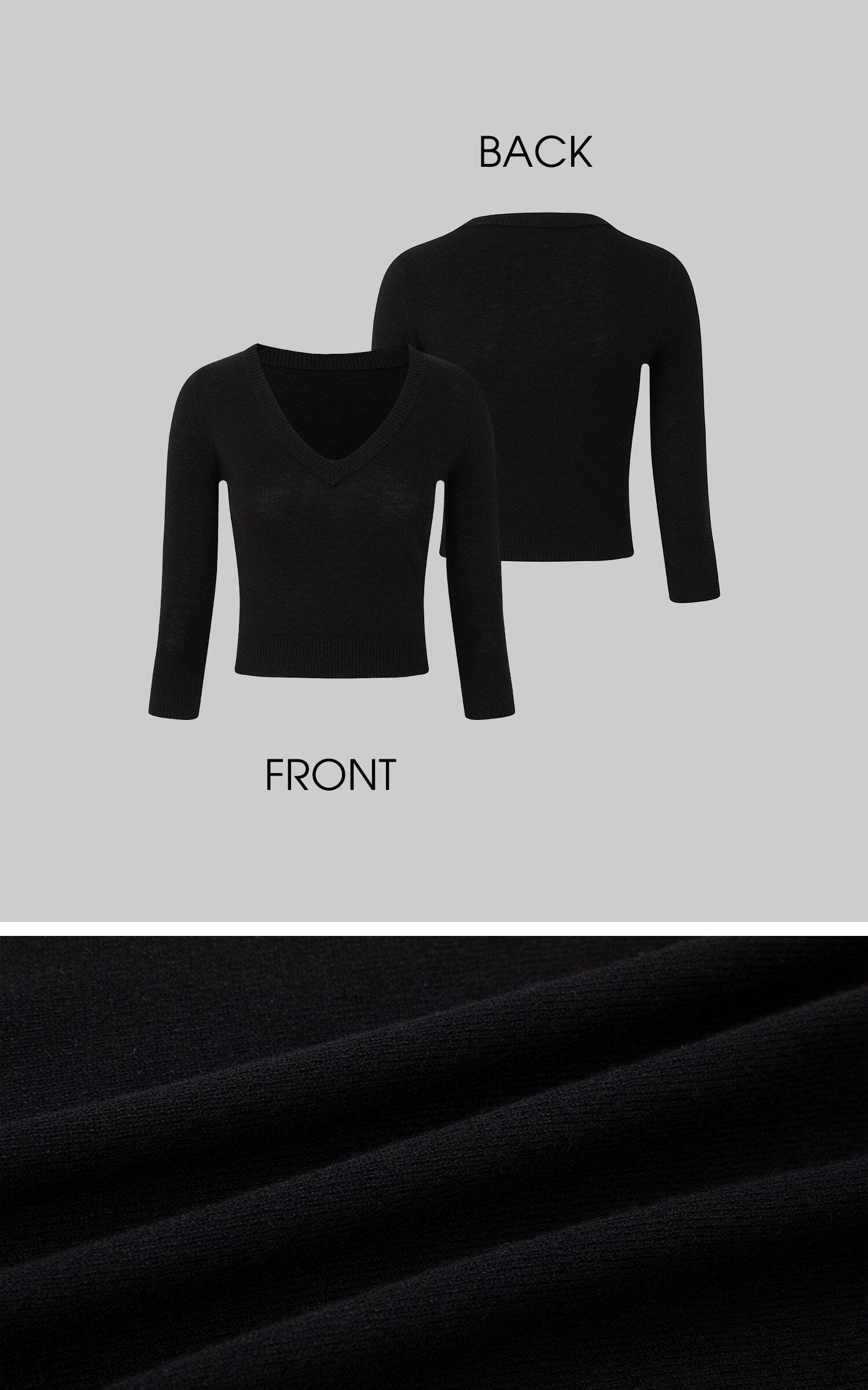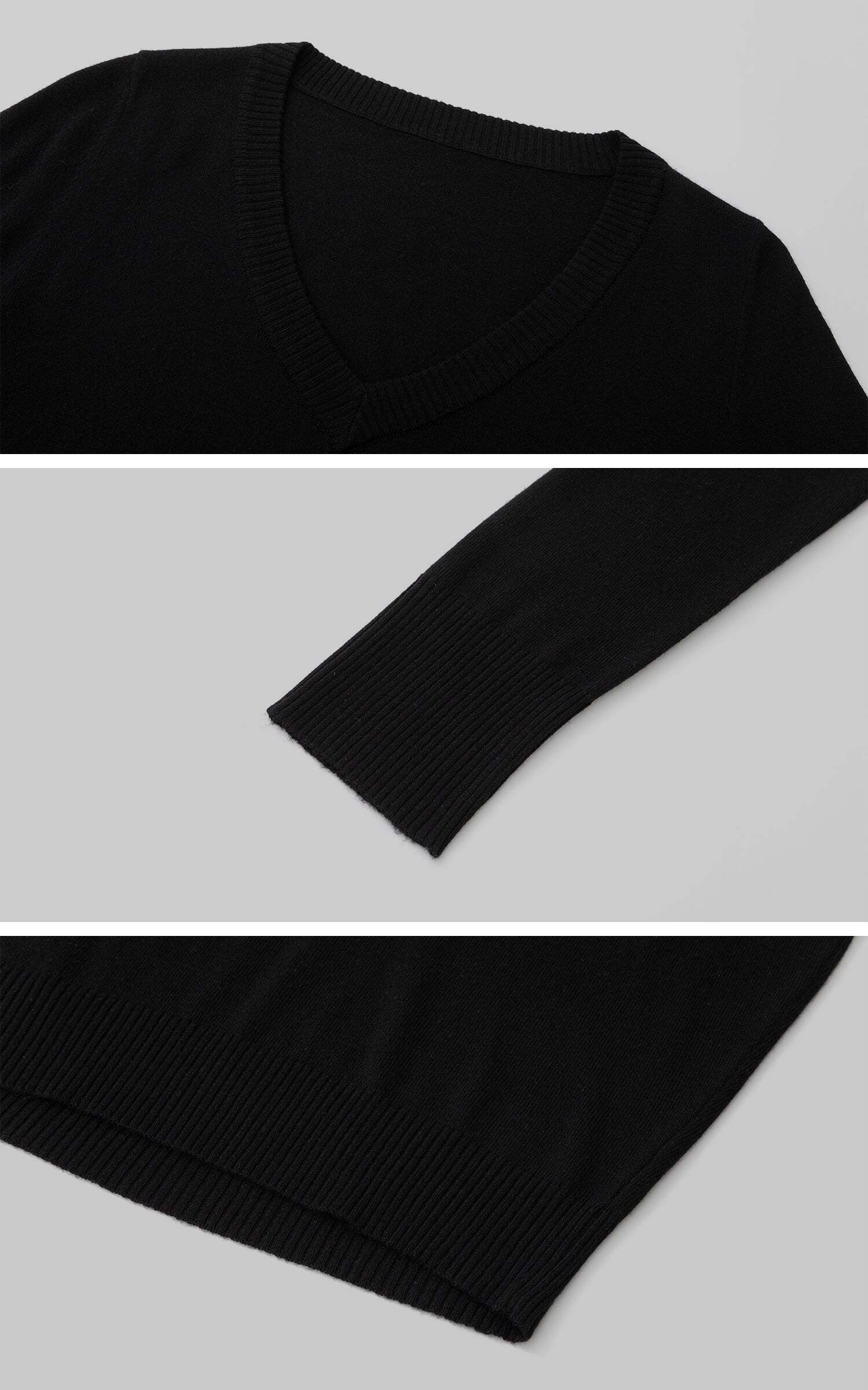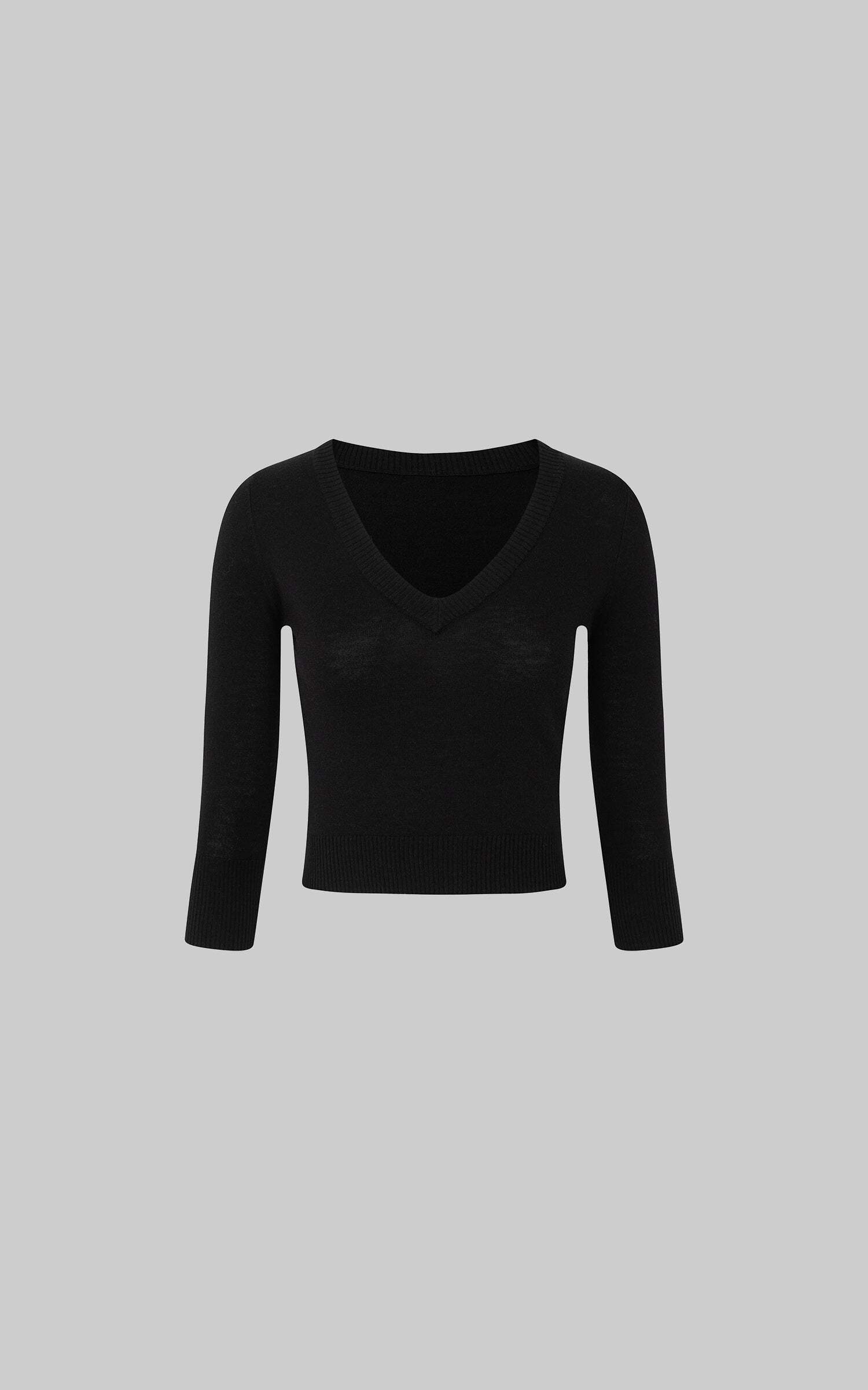 A sleek cropped sweater with a deep V neckline and slim fit silhouette. Ribbed trim adds subtle texture, while the stretch knit fabric hugs the body for everyday comfort. Perfect to pair with wide-leg pants or low-rise trousers for a street-ready look.