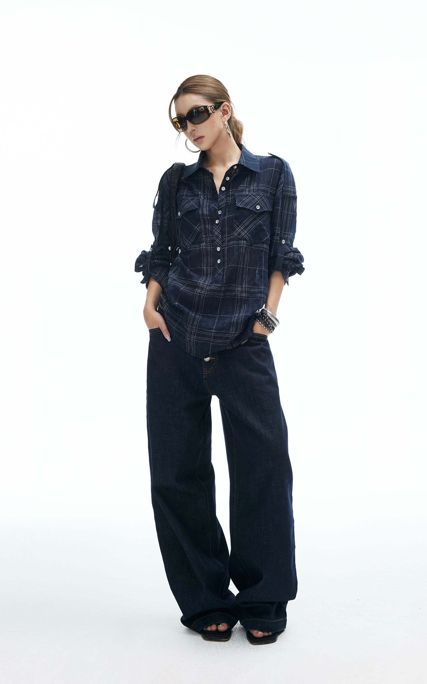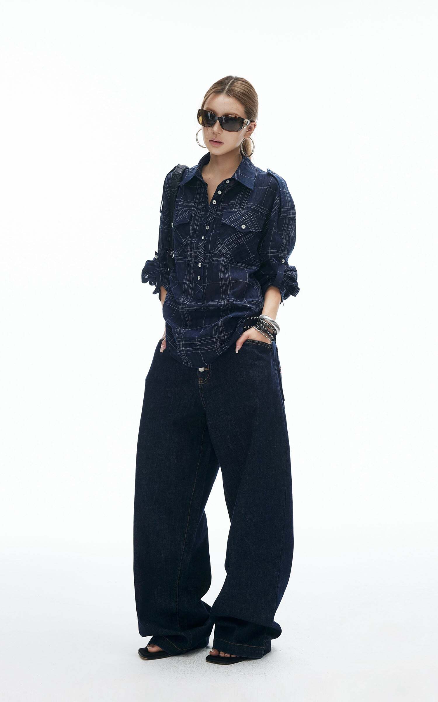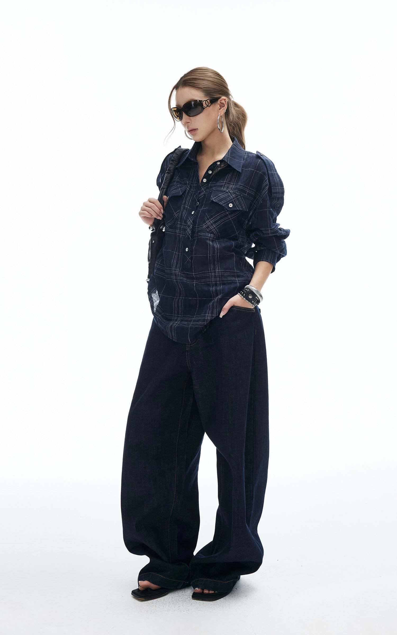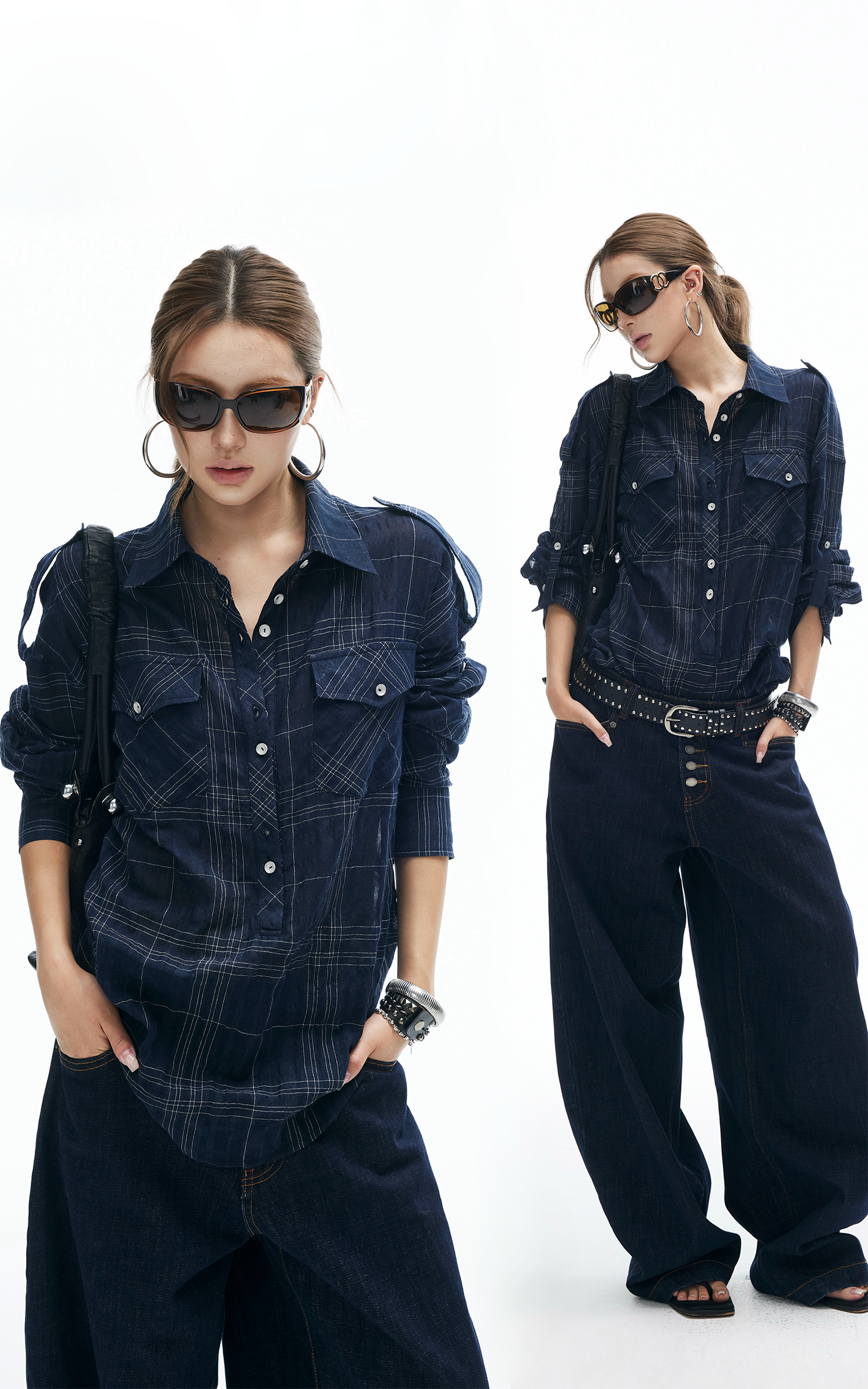 A relaxed plaid shirt reimagined with edge. Featuring a button-down front, dual chest pockets, and adjustable sleeve tabs, this piece is designed for both comfort and attitude. The tie-back detail adds a subtle twist to the oversized silhouette, making it perfect for layering or wearing solo. Style it with wide-leg jeans or mini skirts for an effortlessly cool street look.