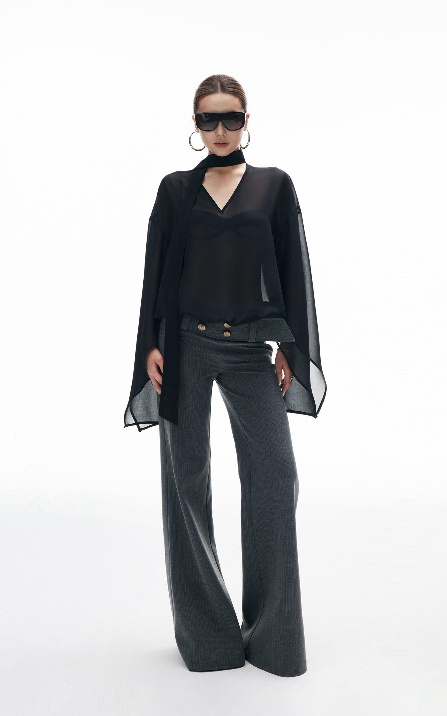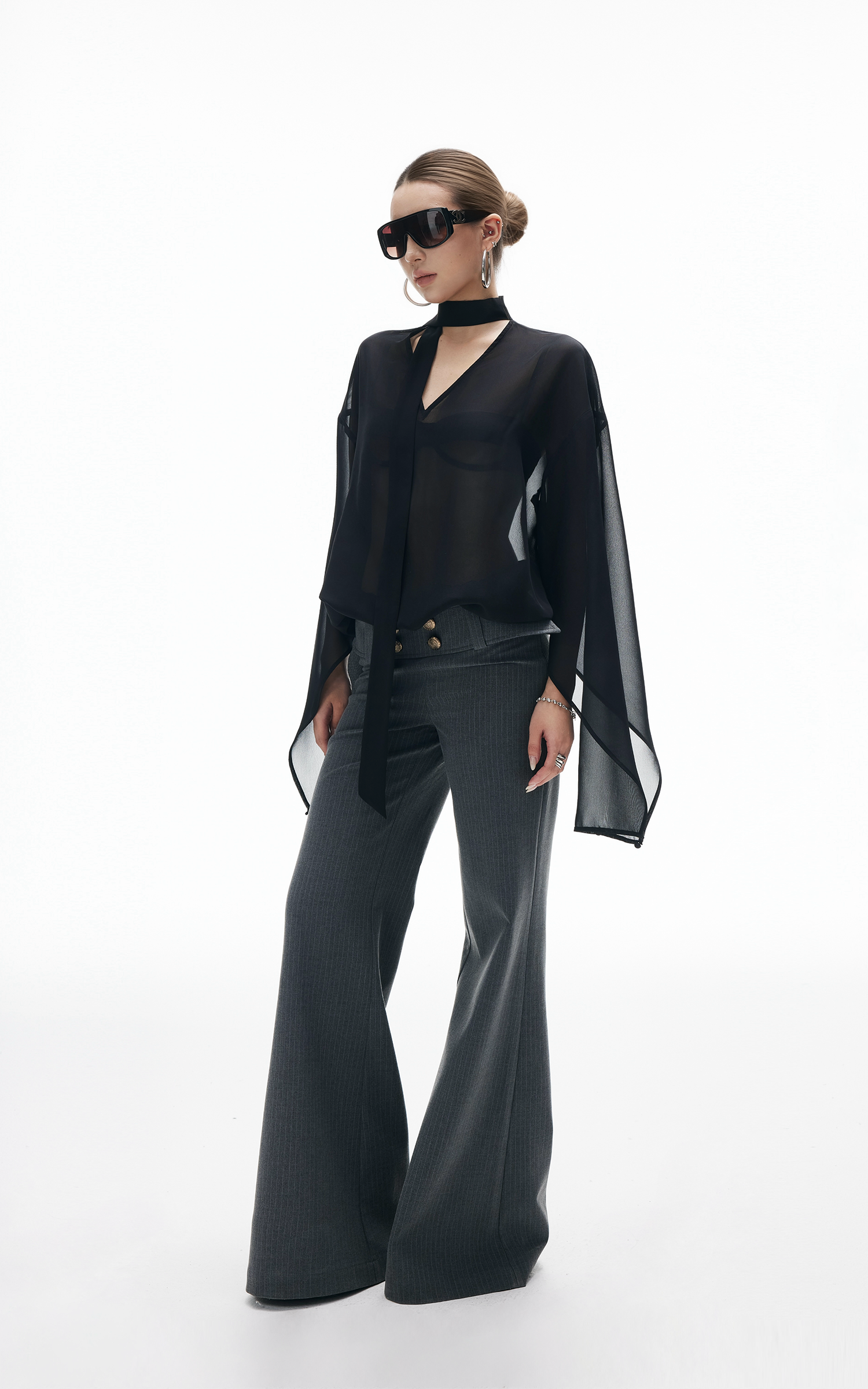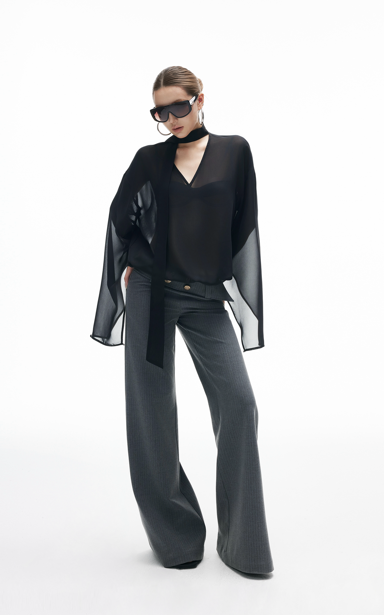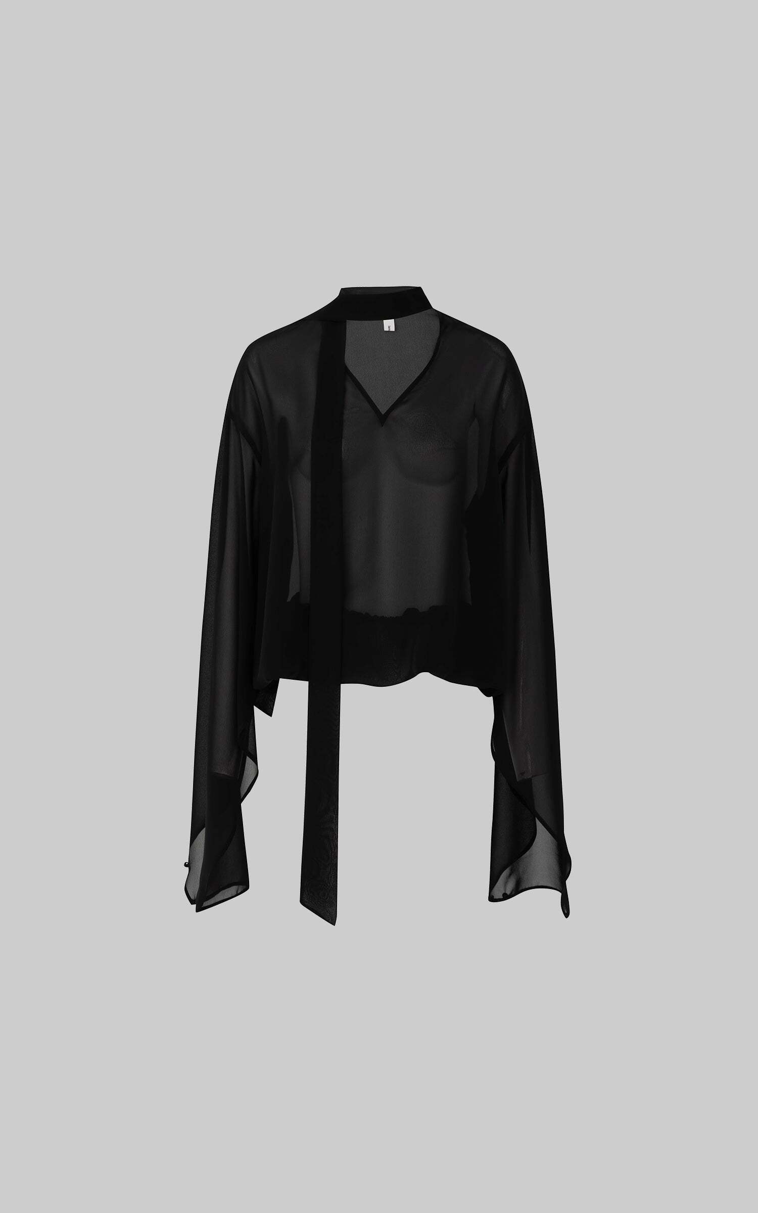 A sheer chiffon top that moves with you, designed for a look that’s both effortless and bold. The deep V neckline is framed with an attached scarf tie, giving it that fluid edge that can be styled loose or wrapped. Draped sleeves fall with airy movement, while the elastic hem keeps the silhouette modern and chic. Perfect to throw on over a bralette, matched with wide-leg trousers or a mini skirt for a statement look that’s subtly seductive yet laid-back.