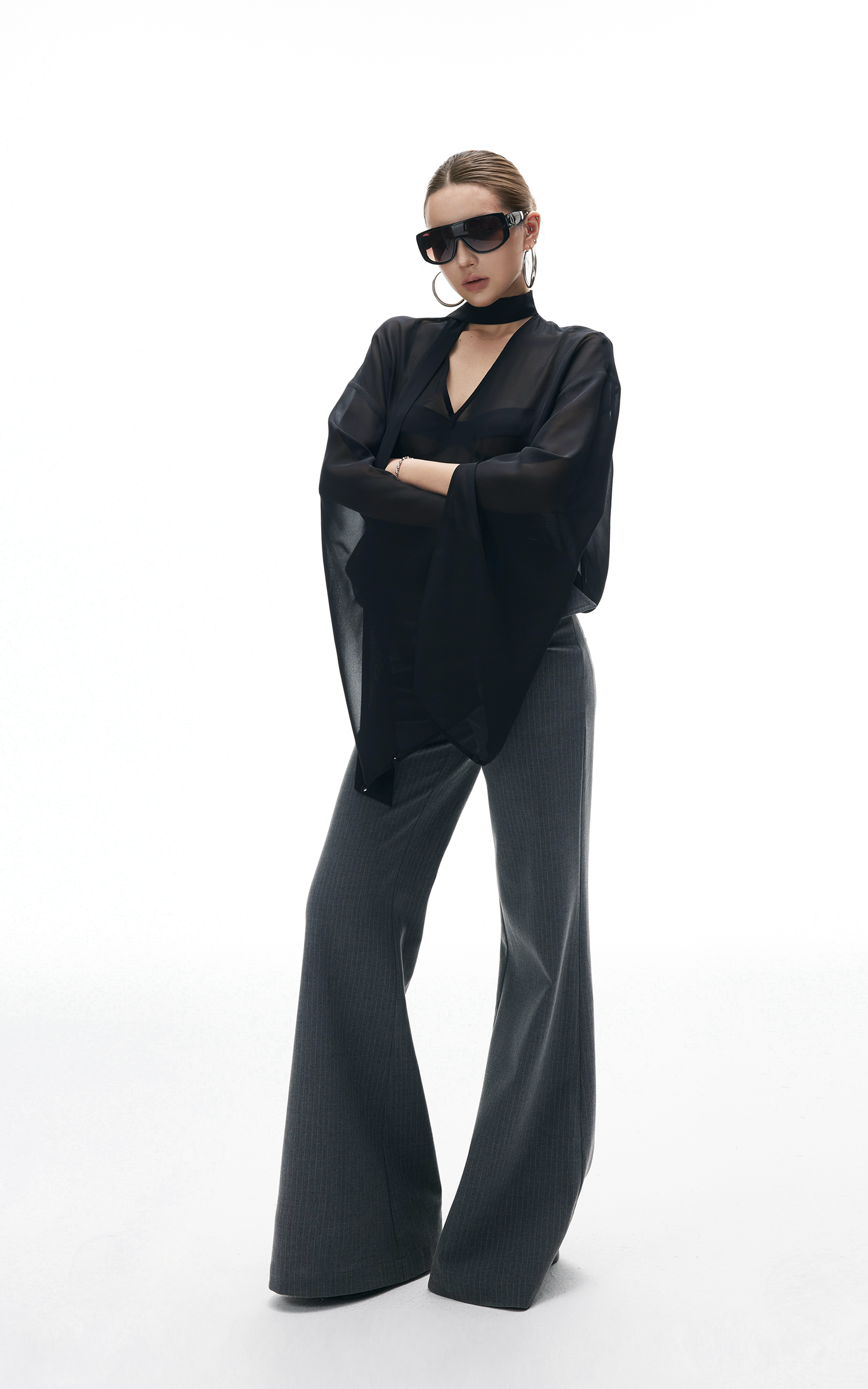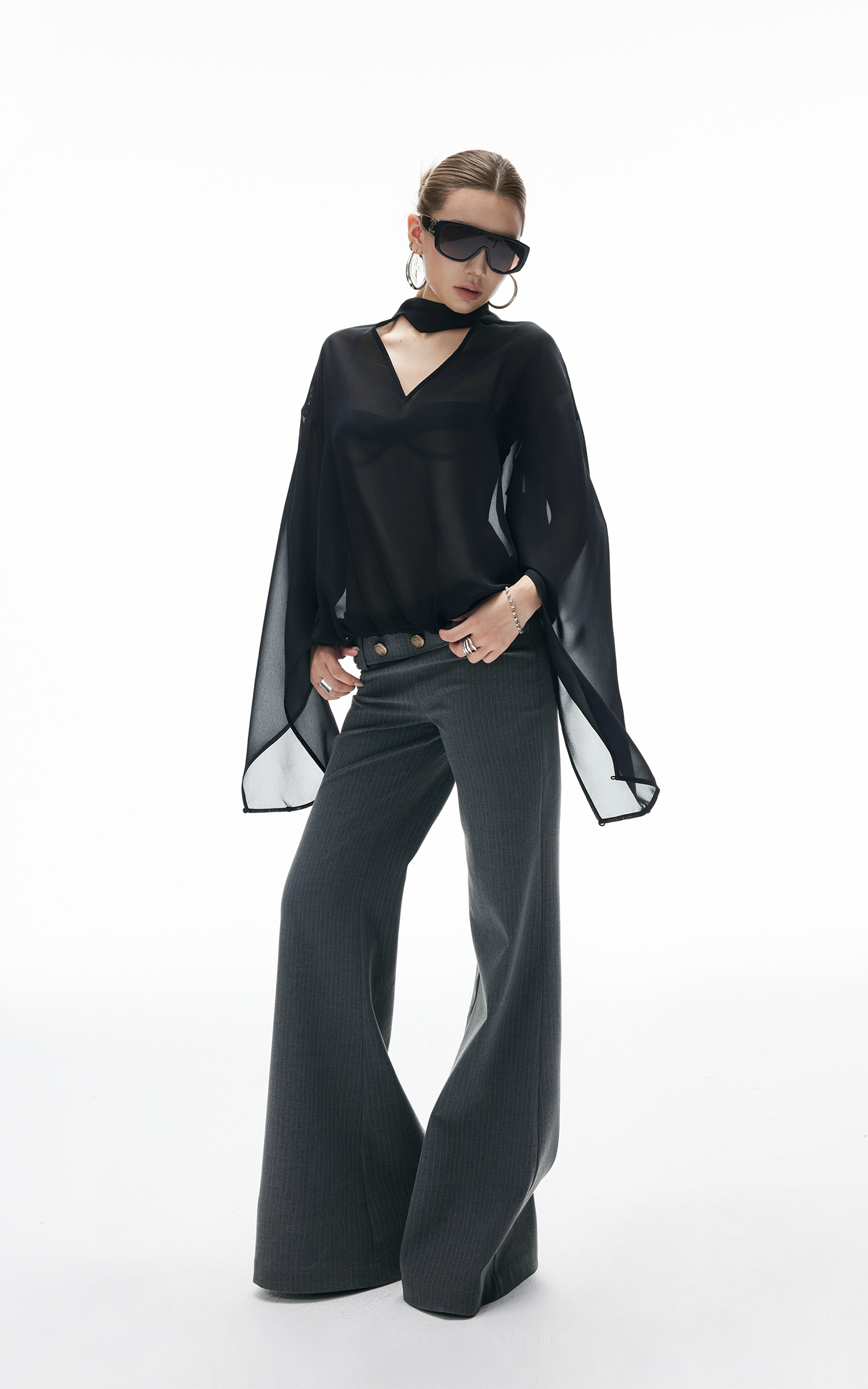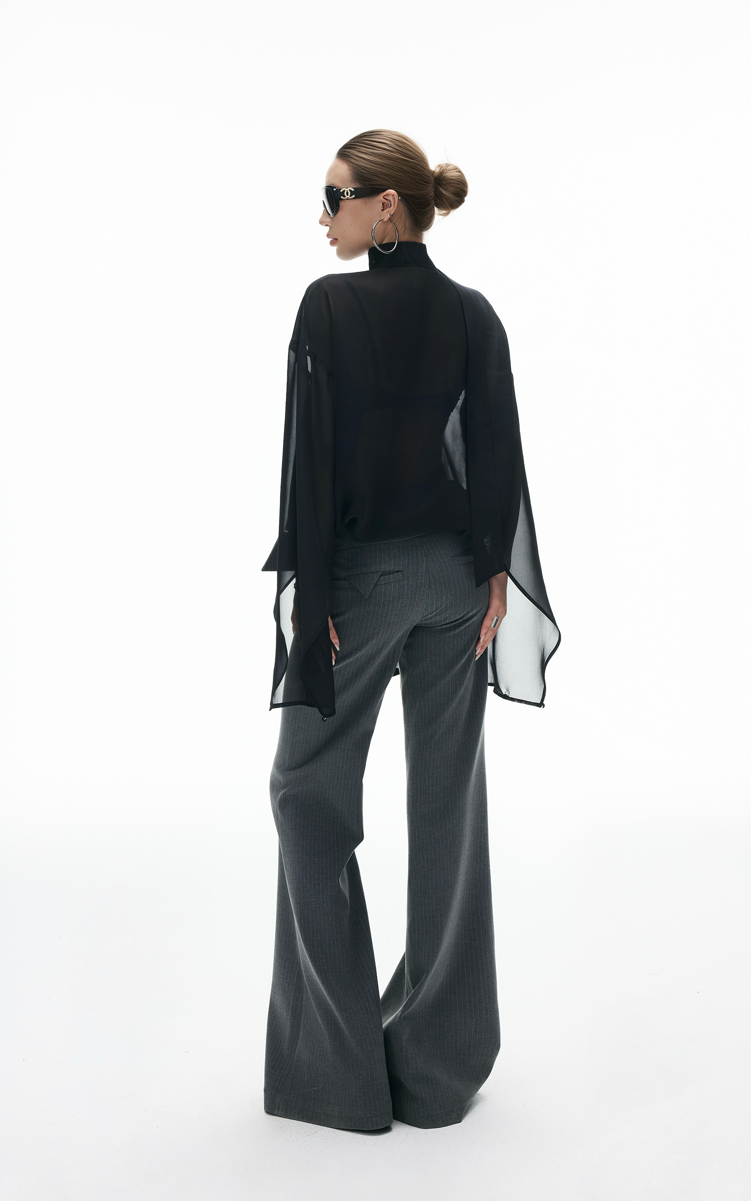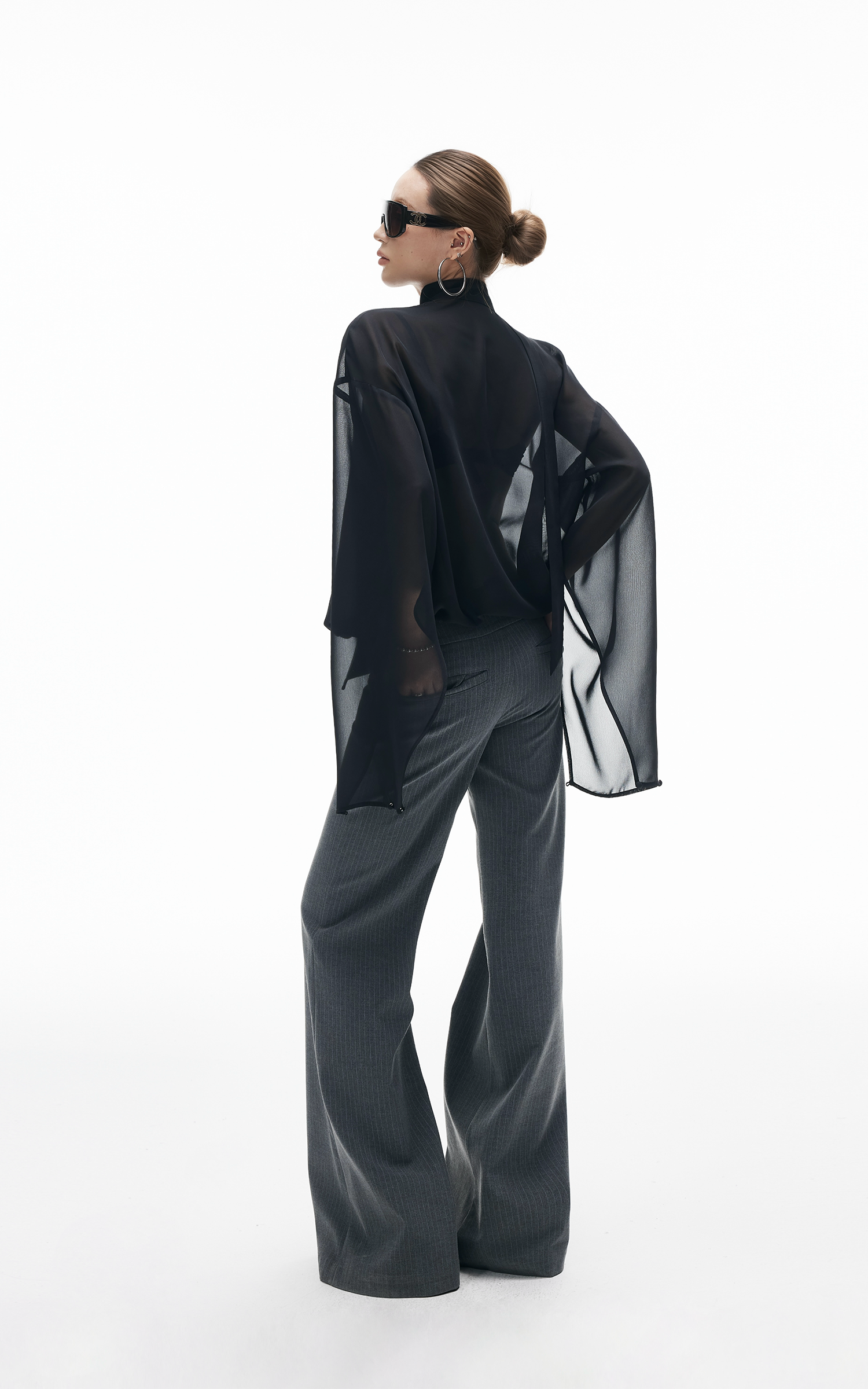 A sheer chiffon top that moves with you, designed for a look that’s both effortless and bold. The deep V neckline is framed with an attached scarf tie, giving it that fluid edge that can be styled loose or wrapped. Draped sleeves fall with airy movement, while the elastic hem keeps the silhouette modern and chic. Perfect to throw on over a bralette, matched with wide-leg trousers or a mini skirt for a statement look that’s subtly seductive yet laid-back.