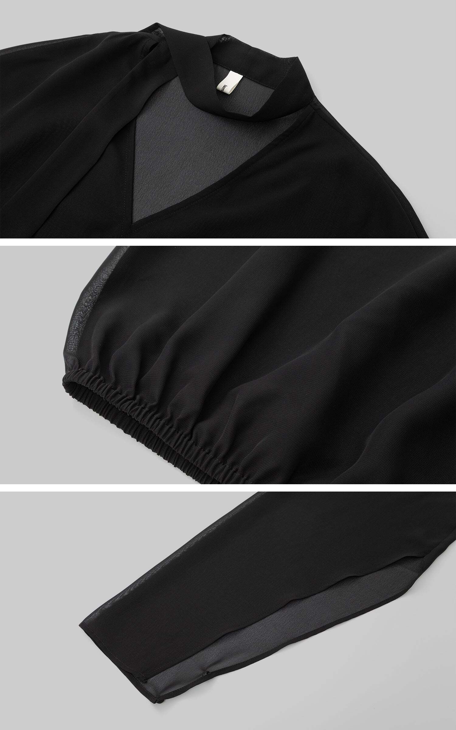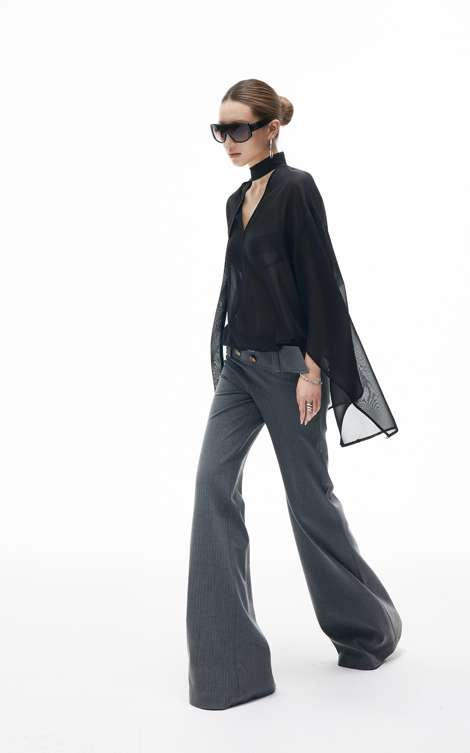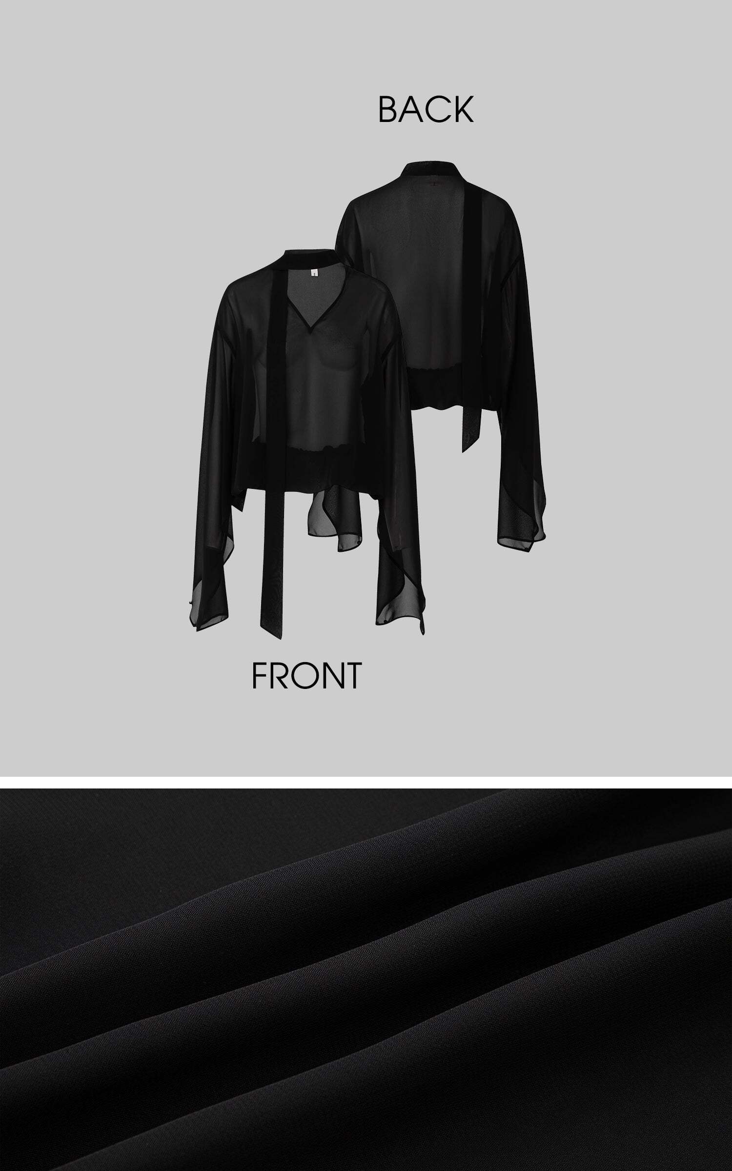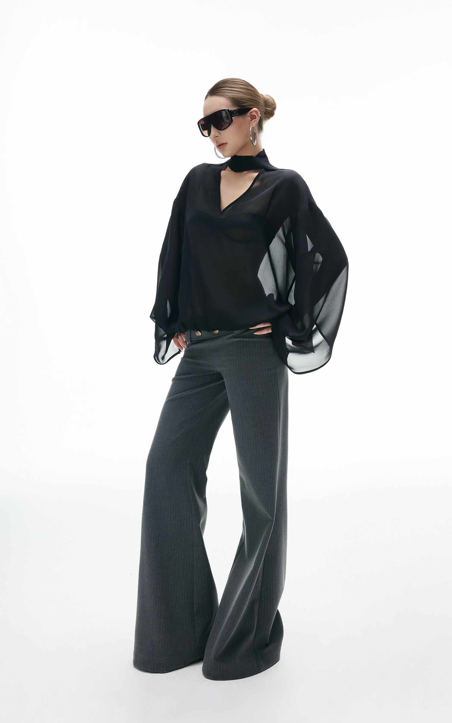 A sheer chiffon top that moves with you, designed for a look that’s both effortless and bold. The deep V neckline is framed with an attached scarf tie, giving it that fluid edge that can be styled loose or wrapped. Draped sleeves fall with airy movement, while the elastic hem keeps the silhouette modern and chic. Perfect to throw on over a bralette, matched with wide-leg trousers or a mini skirt for a statement look that’s subtly seductive yet laid-back.