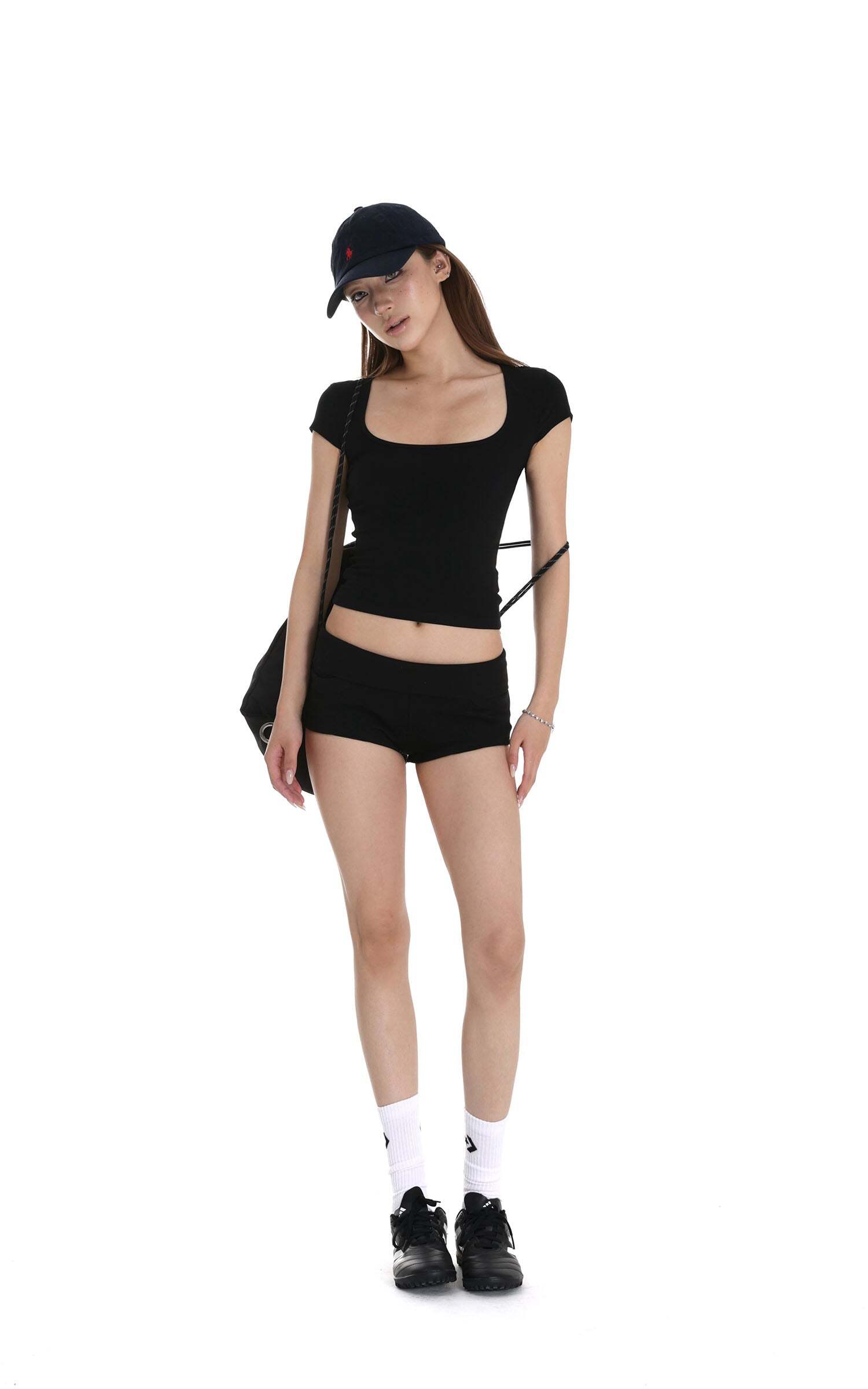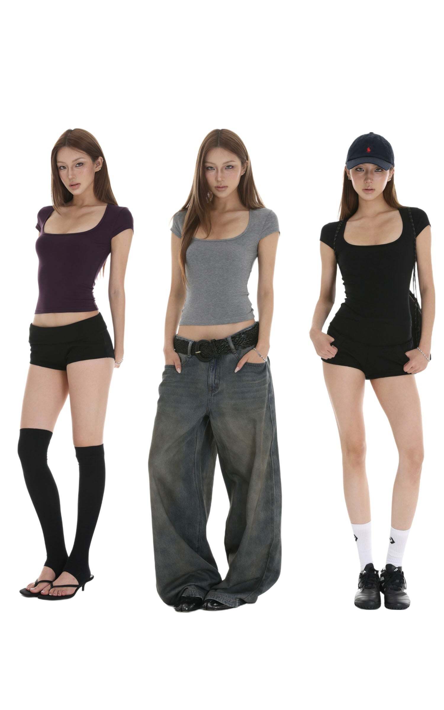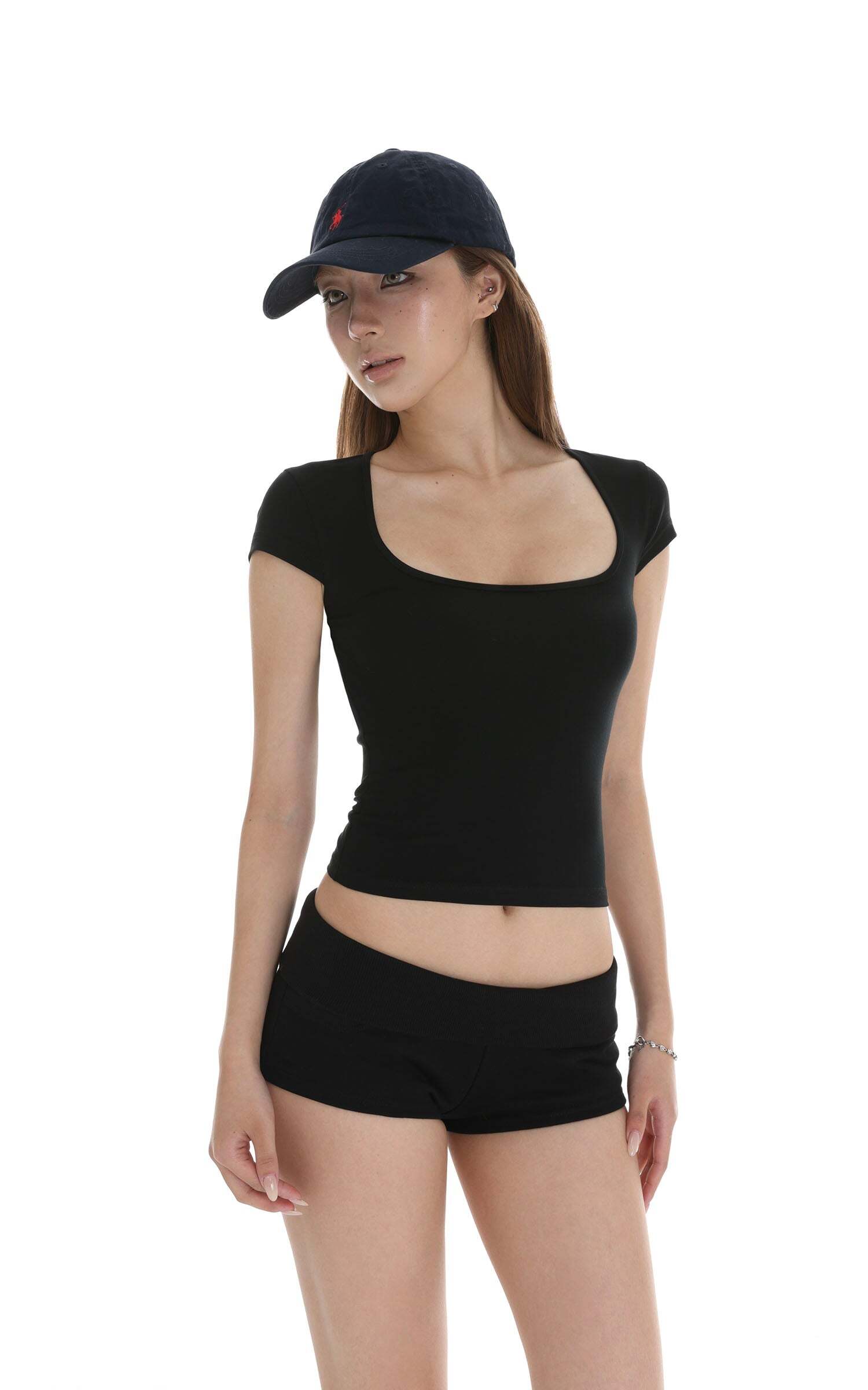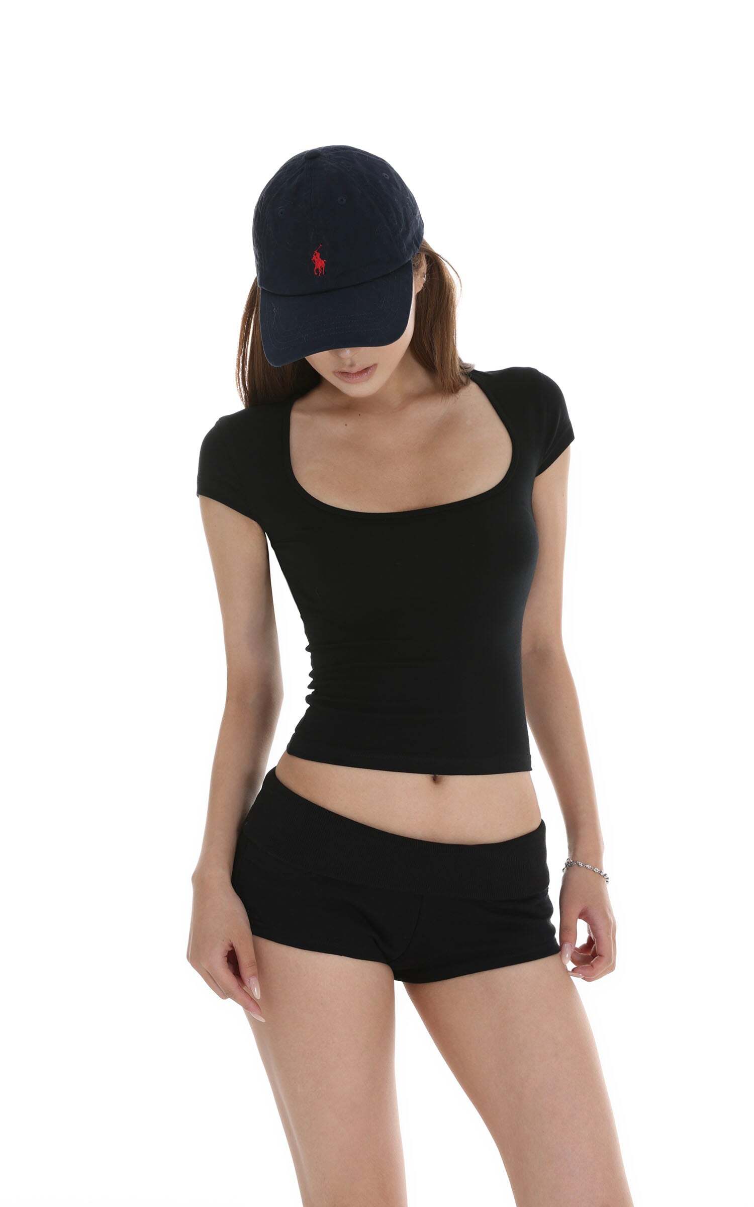 A sleek square-neck T-shirt with a body-hugging fit and cropped cut. Crafted from soft stretch fabric for comfort and shape, it’s the perfect everyday piece with a Y2K twist. Pair it with baggy jeans, pleated skirts, or sporty shorts for versatile styling that goes from casual streetwear to night-out looks.