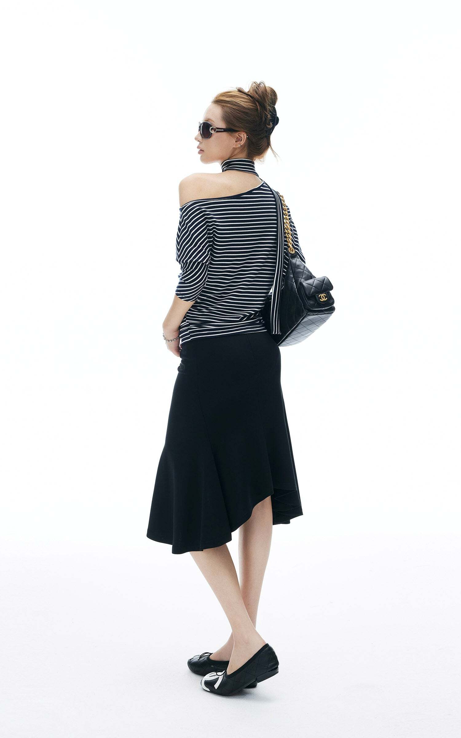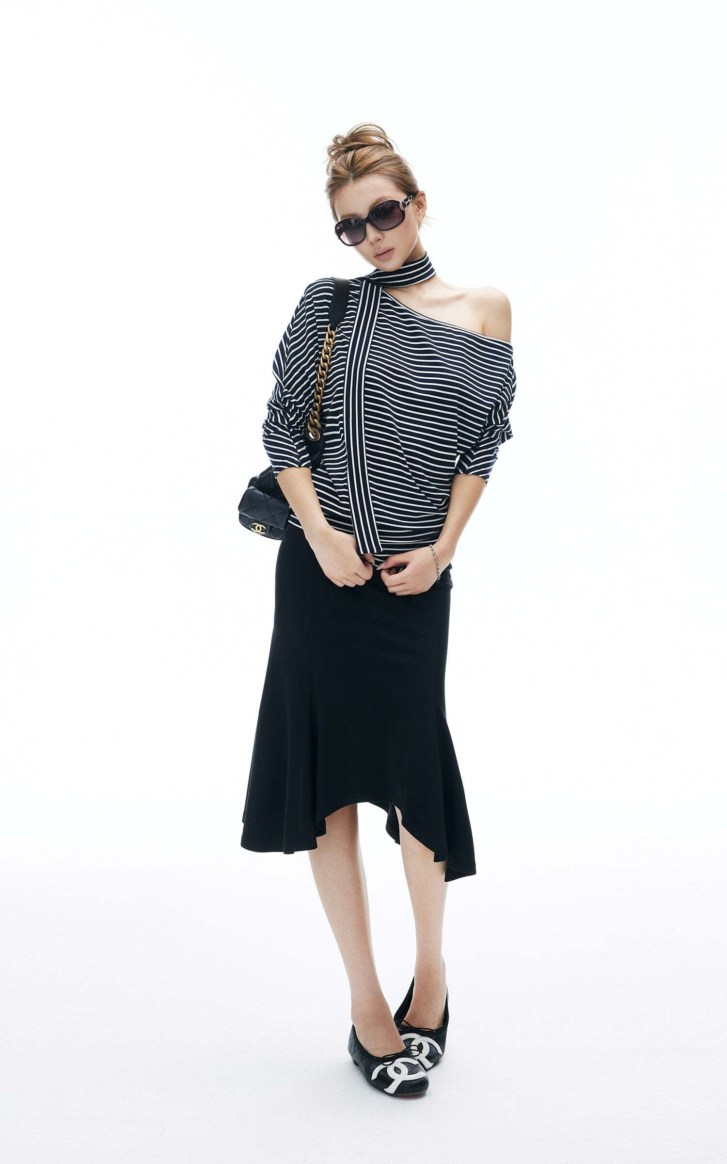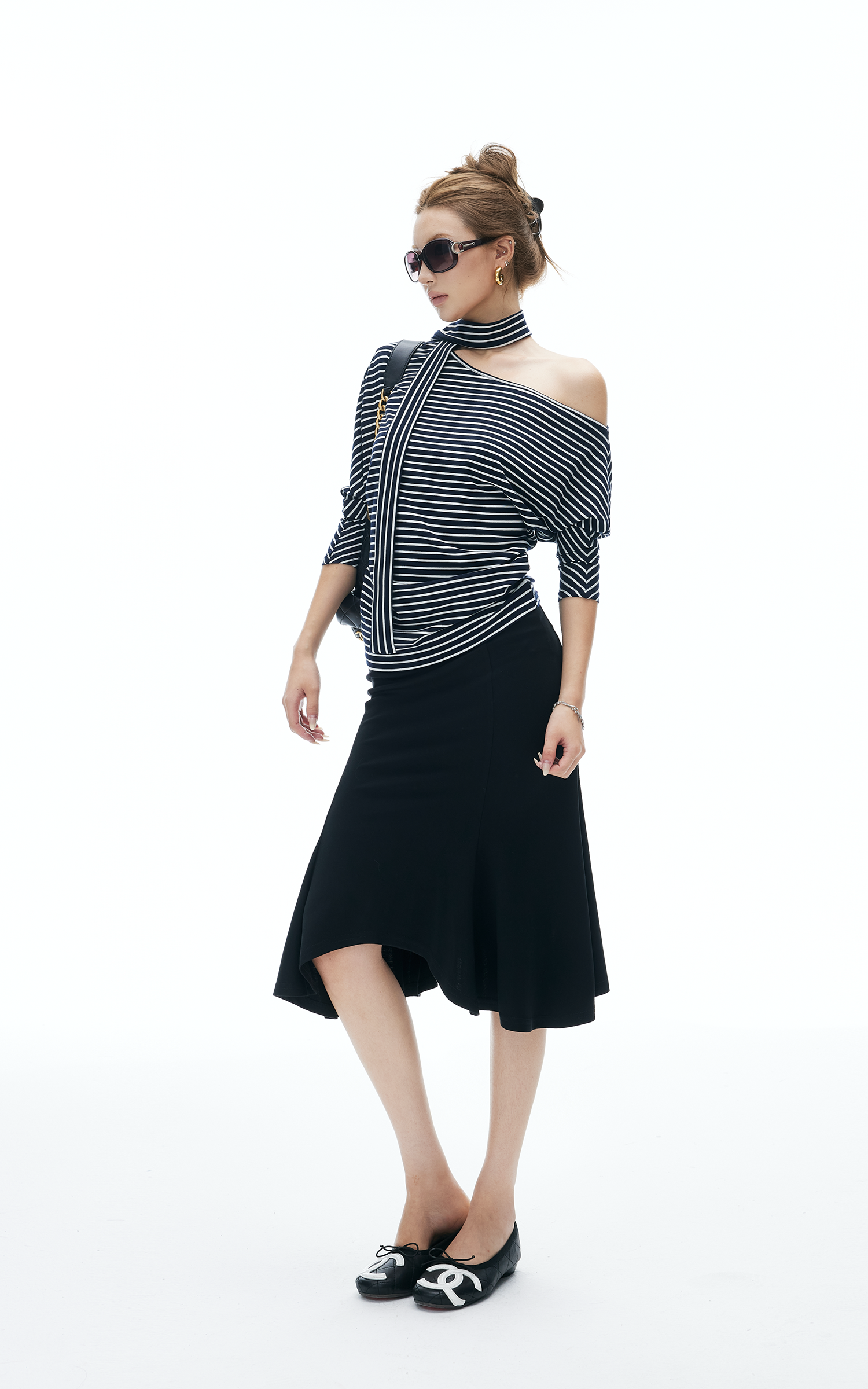 This striped one shoulder T-shirt is a playful twist on a wardrobe classic. Featuring bold horizontal lines with an asymmetric neckline and detachable scarf detail, it’s the ultimate statement top for days when you want to stand out. The relaxed silhouette balances comfort with edge, making it perfect for styling with high-waist skirts, tailored pants, or casual denim. Versatile and bold, it’s a piece that transforms simple outfits into head-turning looks.