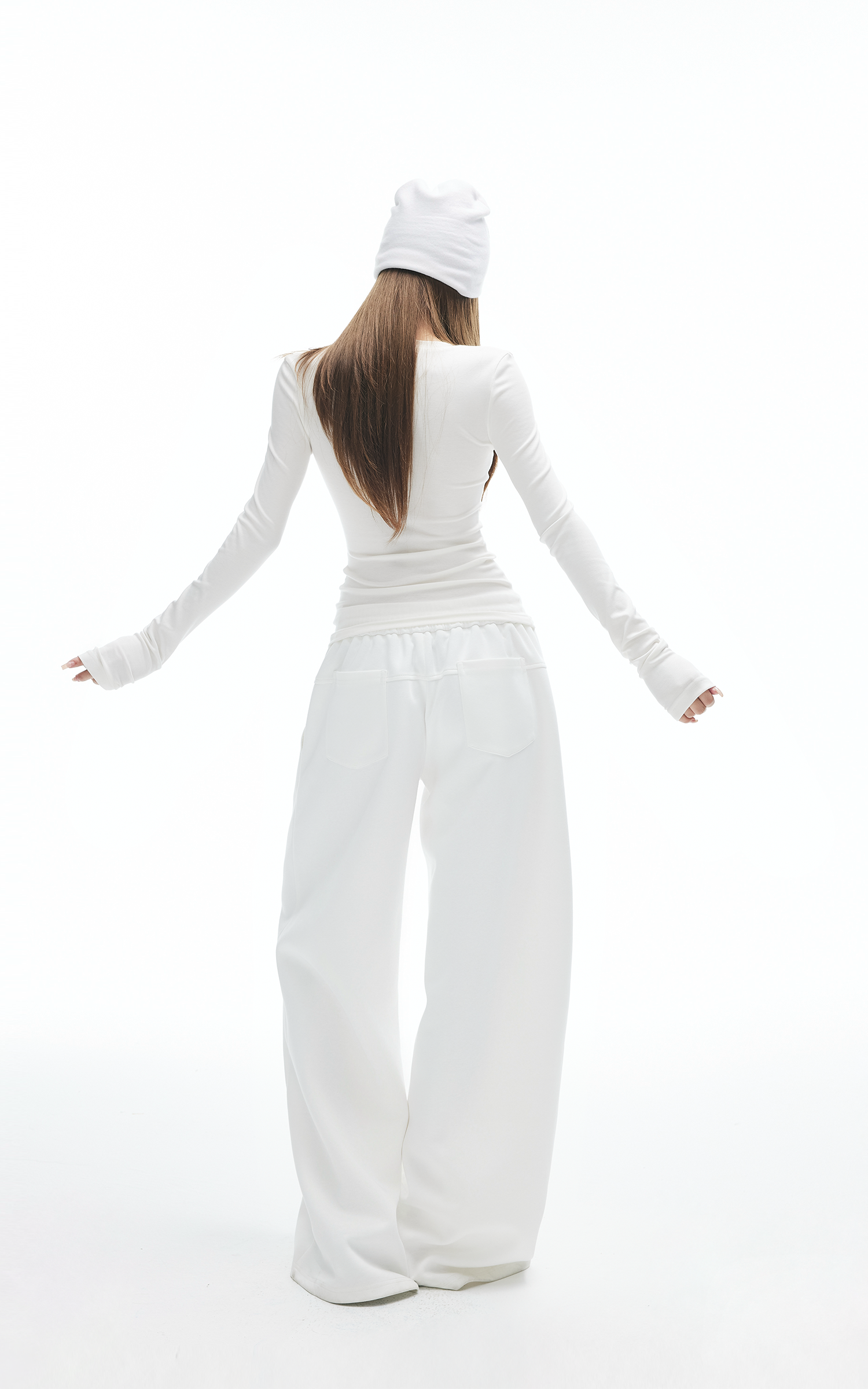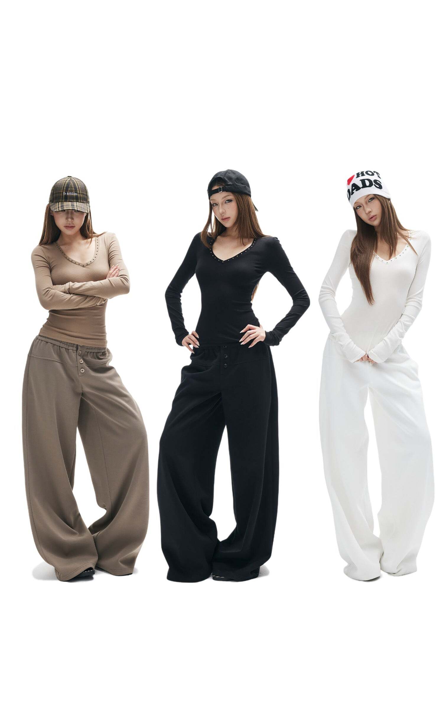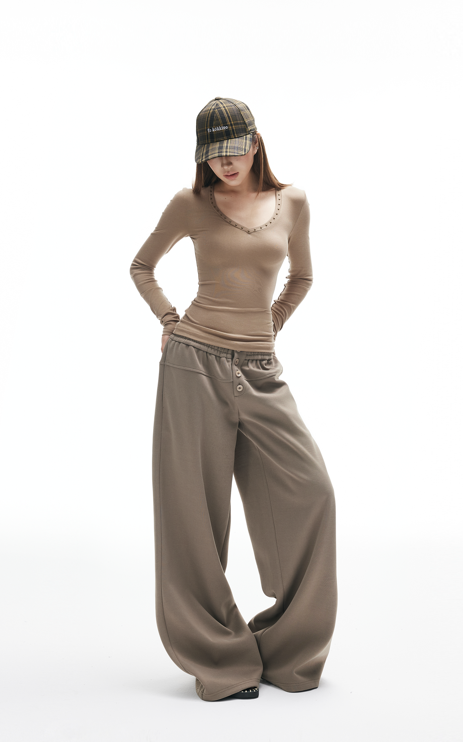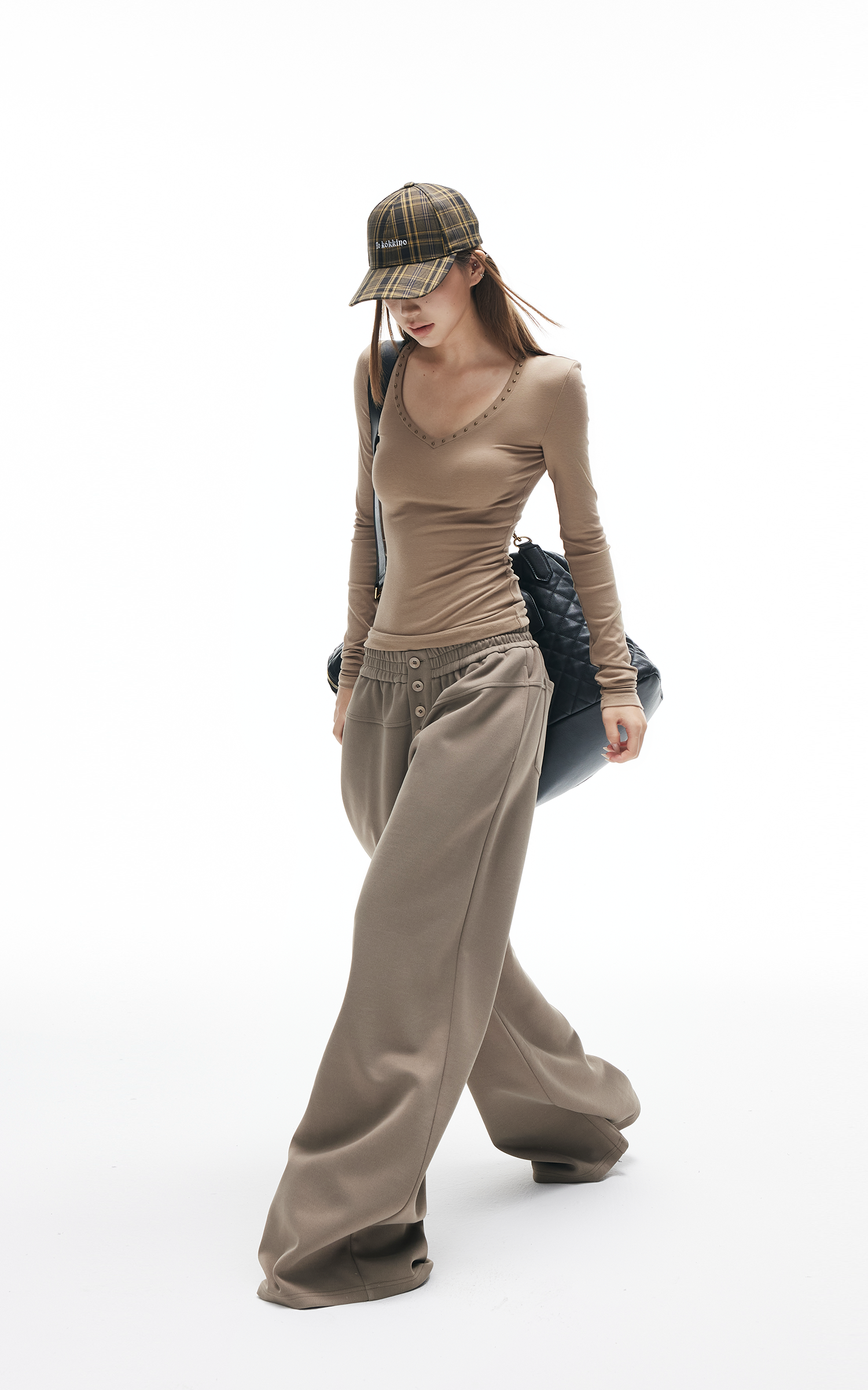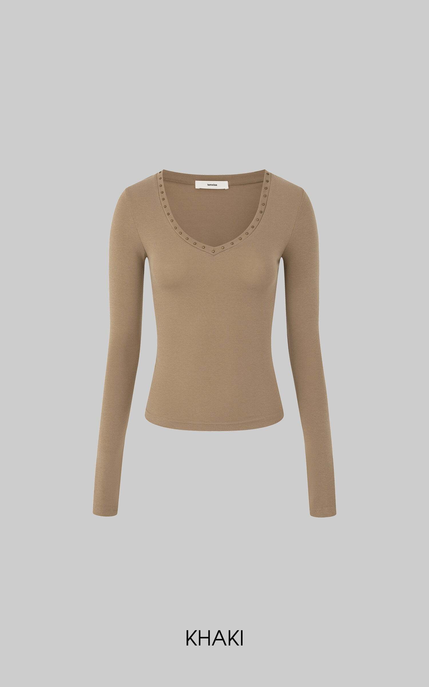 A sleek long sleeve tee with a deep V-neck outlined by metallic stud accents—minimal with a rebellious twist. Crafted from soft stretch fabric, it hugs the body with a flattering slim fit while keeping comfort in check. Easy to layer or wear solo, this top pairs seamlessly with wide-leg trousers or low-rise skirts for a laid-back street look. Available in black, khaki, and white for effortless everyday styling.