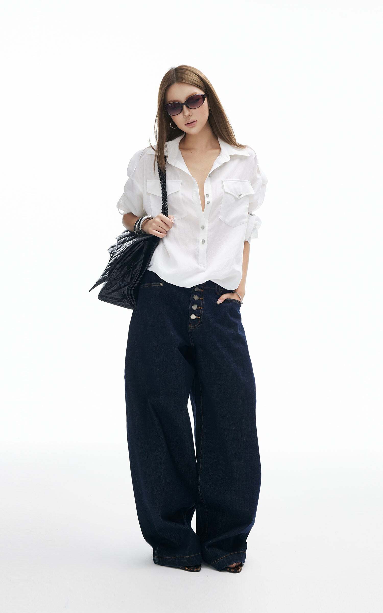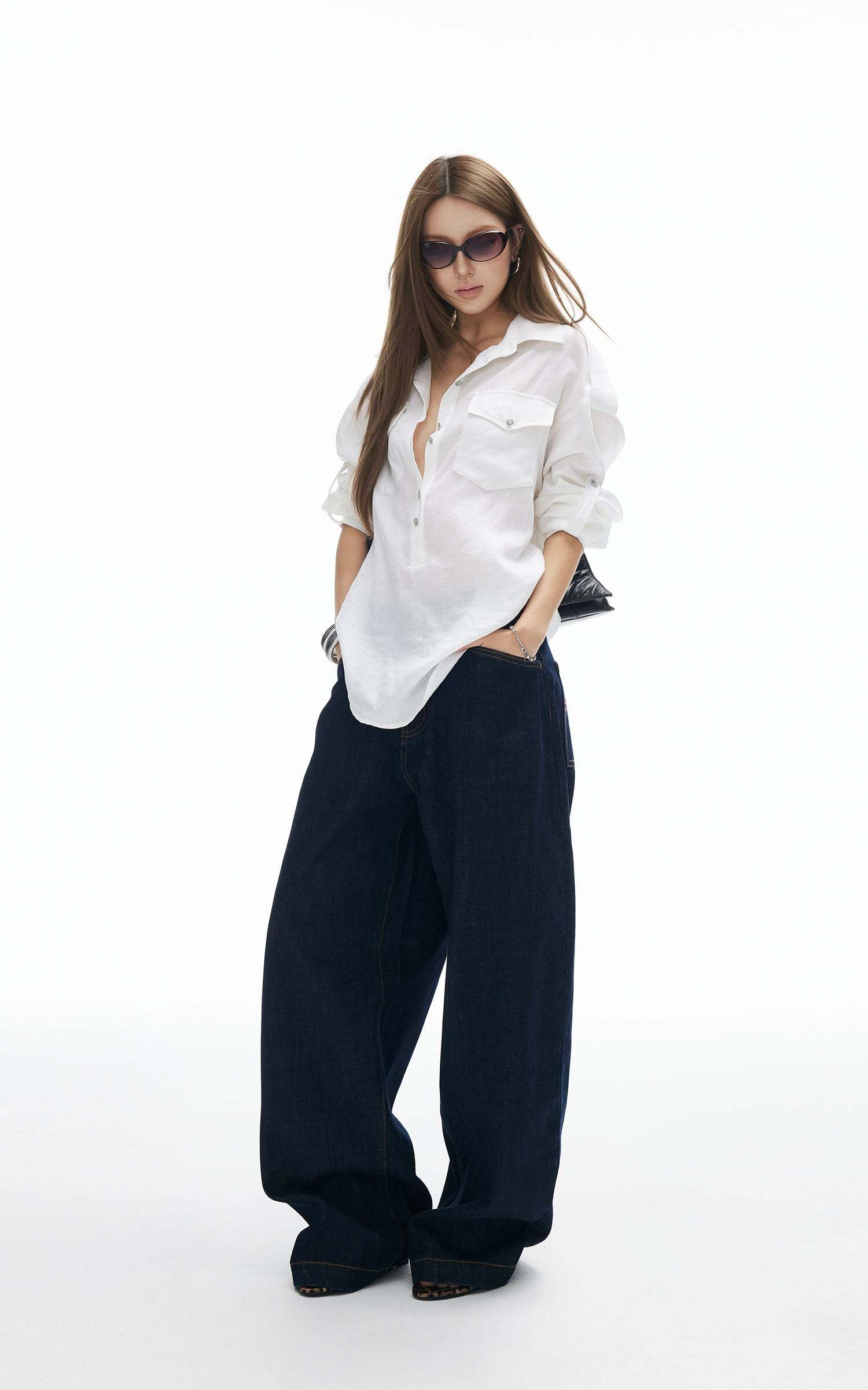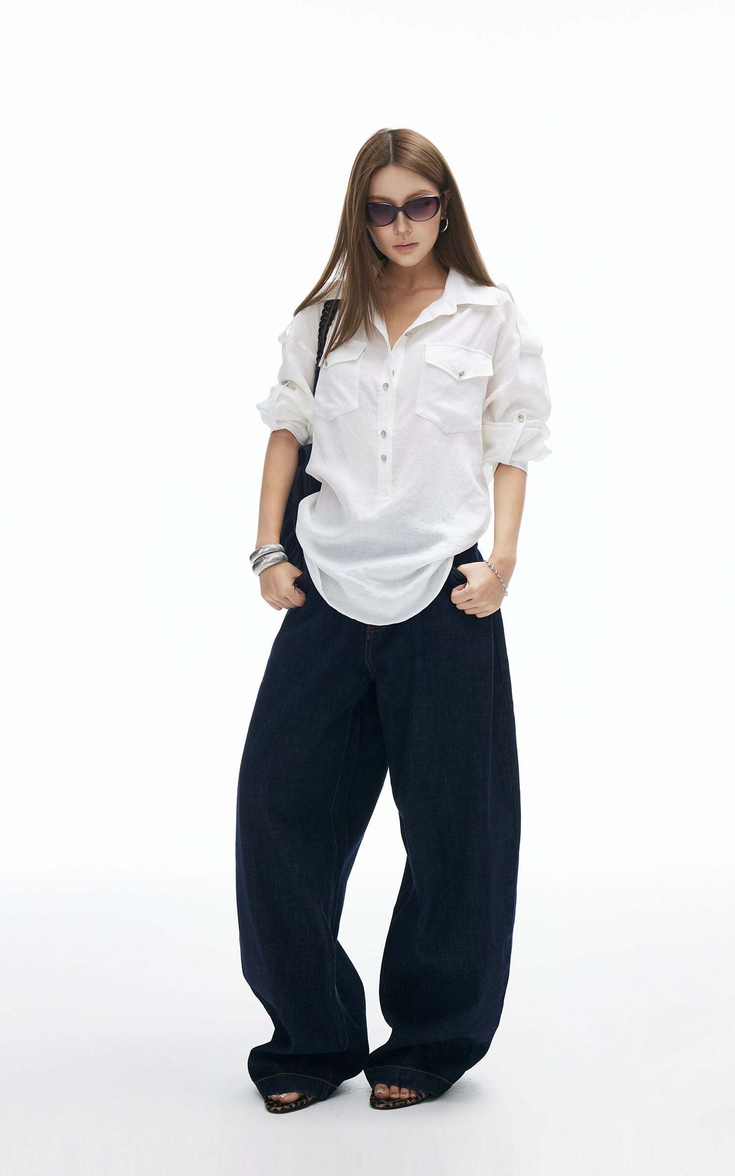 Effortless cool with a utility twist. This oversized shirt features front flap pockets, shoulder tabs, and a button-down design for a structured yet relaxed vibe. The lightweight fabric flows with movement, while the tie-back detail adds a cinched silhouette when desired. Wear it loose over a mini skirt for a street-smart edge, or tighten the back ties for a more refined, fitted look.