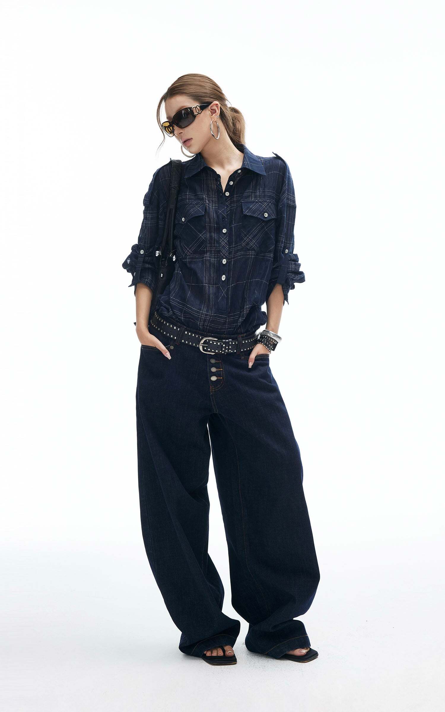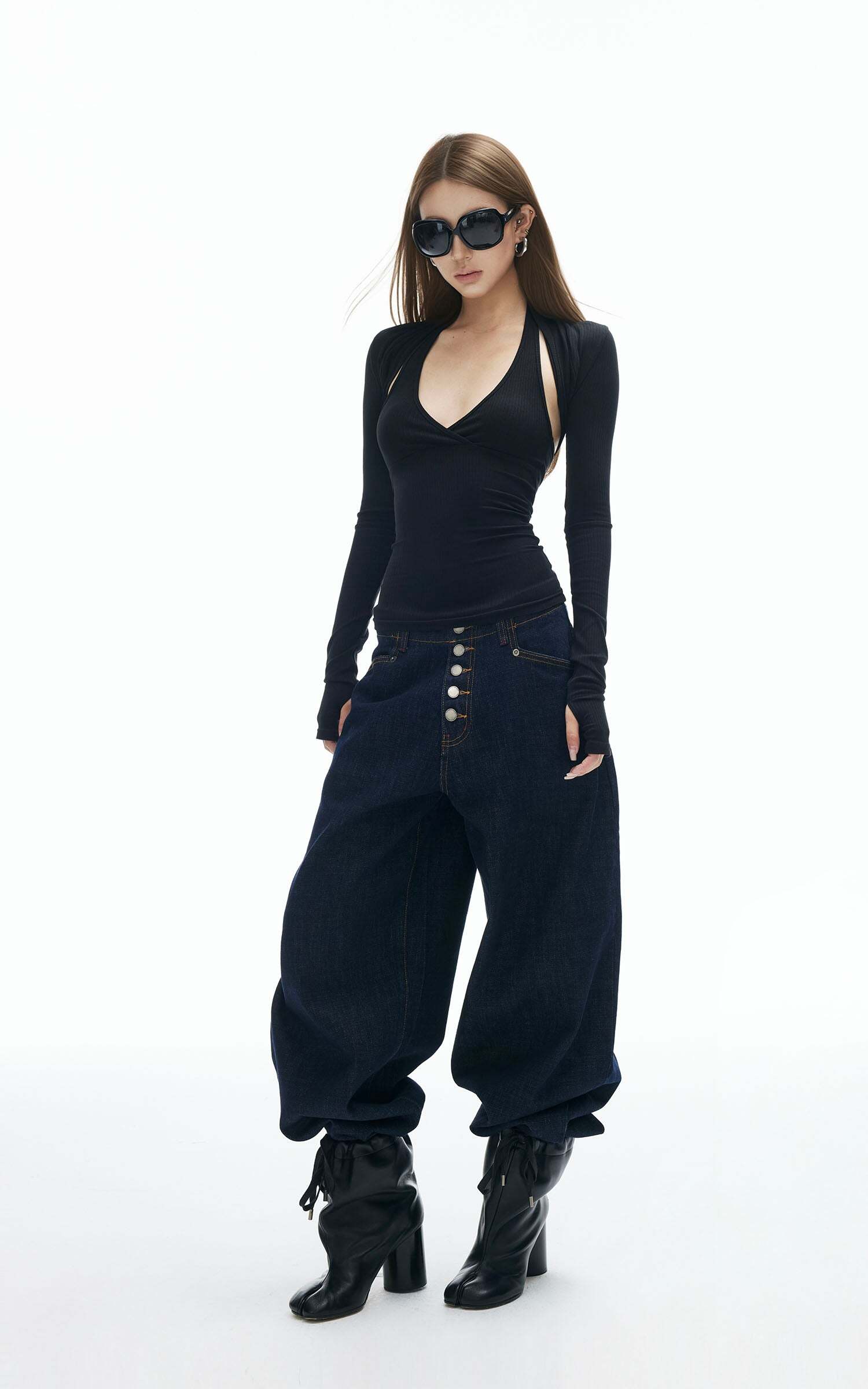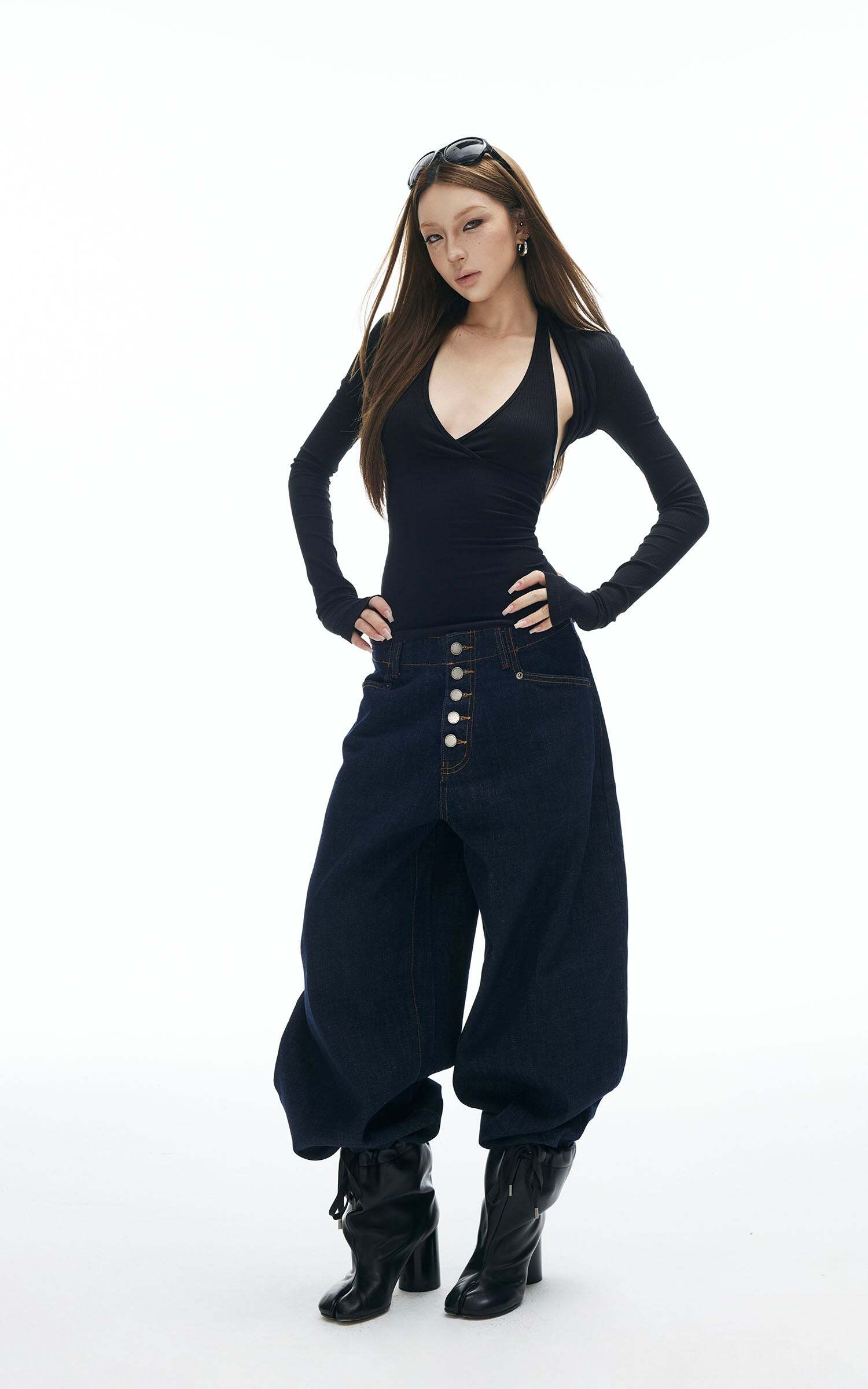 Designed with a bold wide leg silhouette, these dark wash denim jeans deliver effortless street attitude. The high rise fit and statement button fly create a flattering shape while keeping the look cool and relaxed. Featuring oversized back pockets with contrast stitching, they bring an edge that pairs perfectly with crop tops, tanks, or oversized shirts. Made from sturdy denim, these jeans are your go-to for versatile everyday styling, whether you’re dressing up with heels or keeping it casual with sneakers.