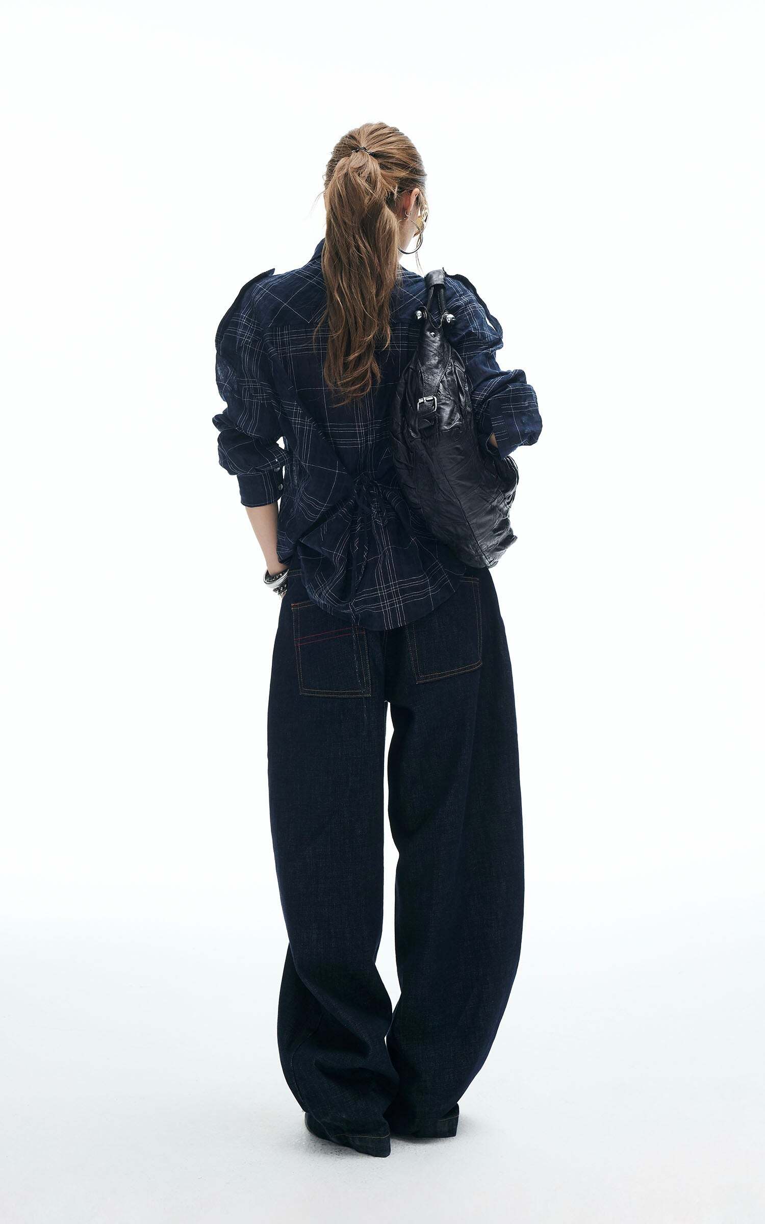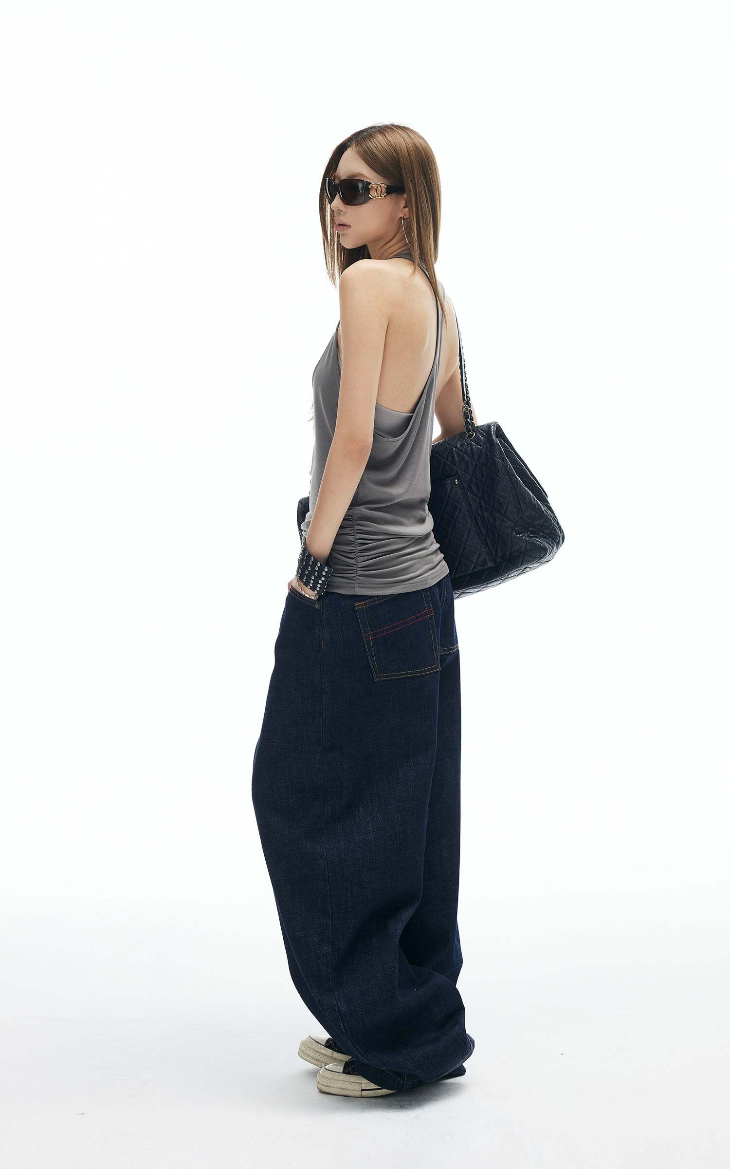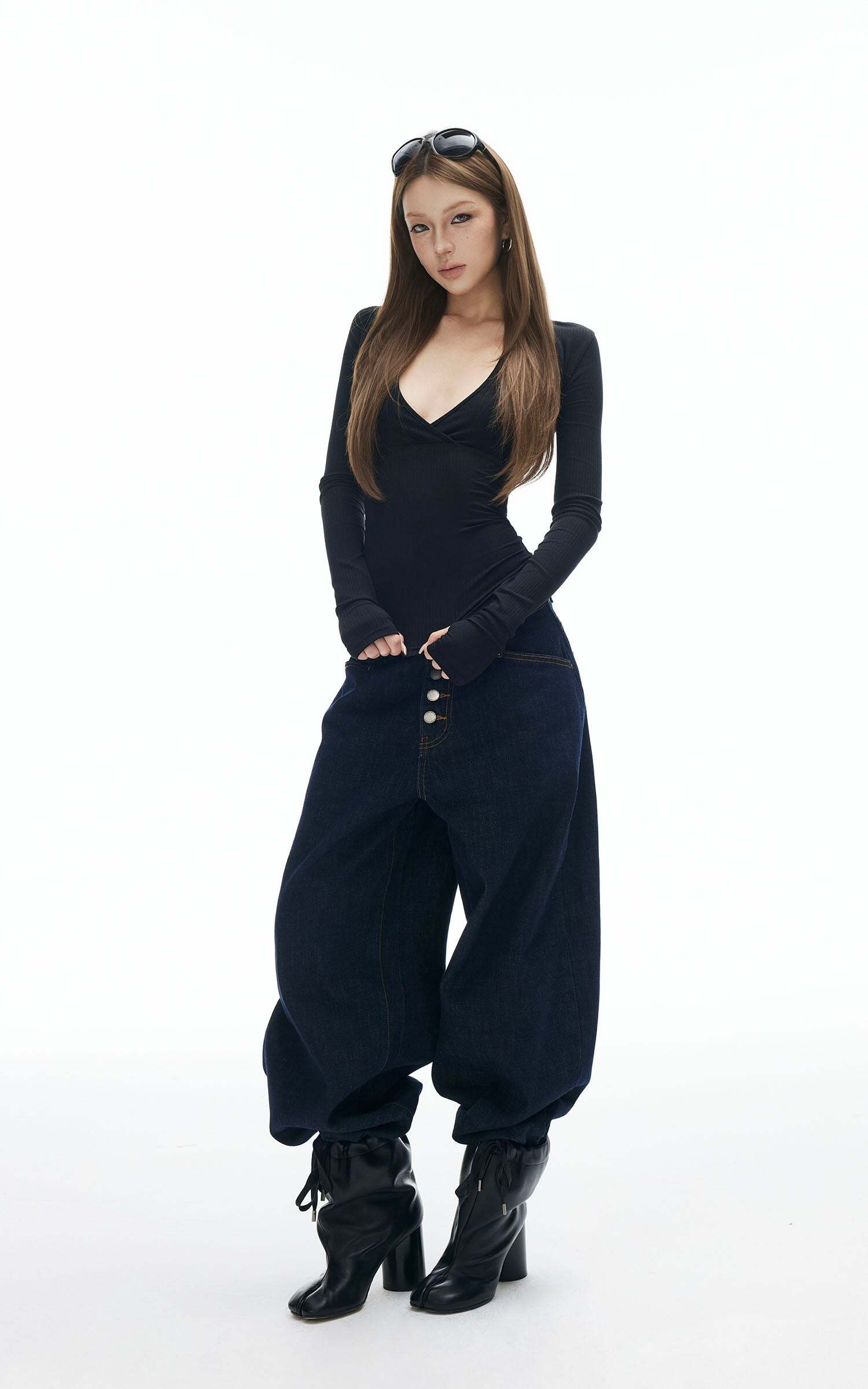 Designed with a bold wide leg silhouette, these dark wash denim jeans deliver effortless street attitude. The high rise fit and statement button fly create a flattering shape while keeping the look cool and relaxed. Featuring oversized back pockets with contrast stitching, they bring an edge that pairs perfectly with crop tops, tanks, or oversized shirts. Made from sturdy denim, these jeans are your go-to for versatile everyday styling, whether you’re dressing up with heels or keeping it casual with sneakers.