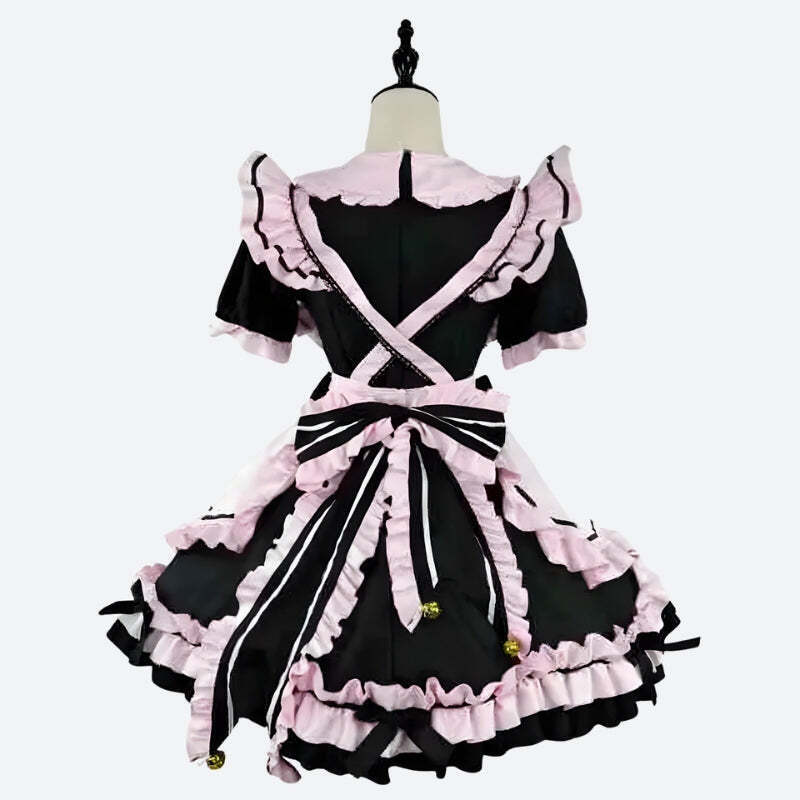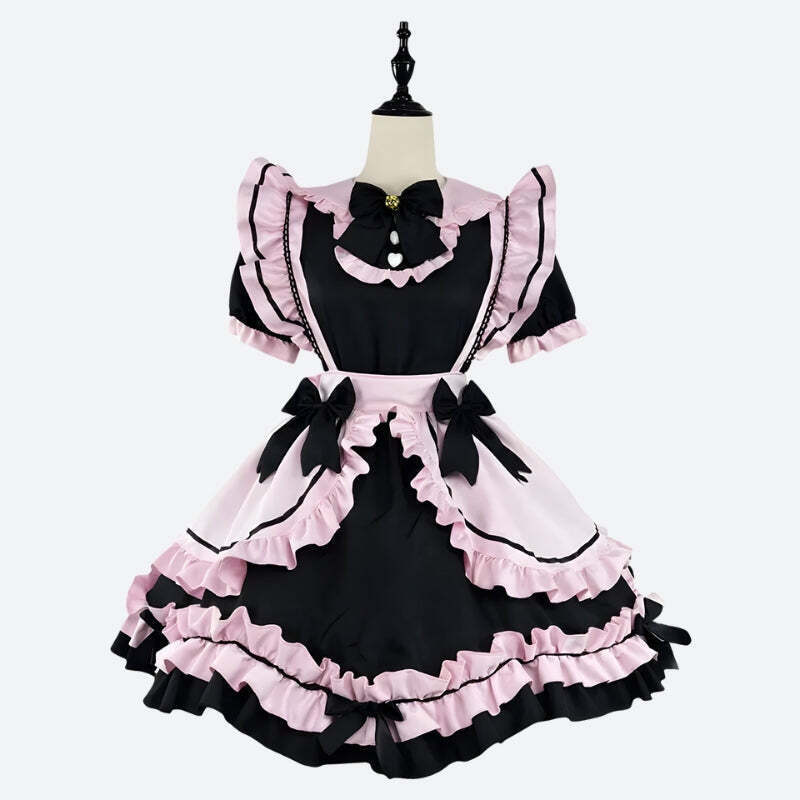 The Kawaii Anime Mini Dress brings playful charm with its pastel pink and black colors. Large bows at the waist and collar add elegance, making it perfect for themed parties or adding a fun anime-inspired twist to your wardrobe.