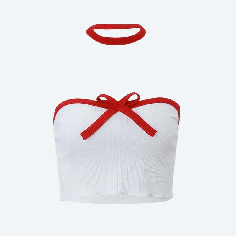 The soft girl essential with a spicy twist. This knitted strapless crop top comes in a creamy ribbed fabric, trimmed with bold red edges and tied off with a cute front bow. The matching choker adds that flirty finishing touch, giving major 2000s vibes. Perfect for date nights, selfies, and everything in between.