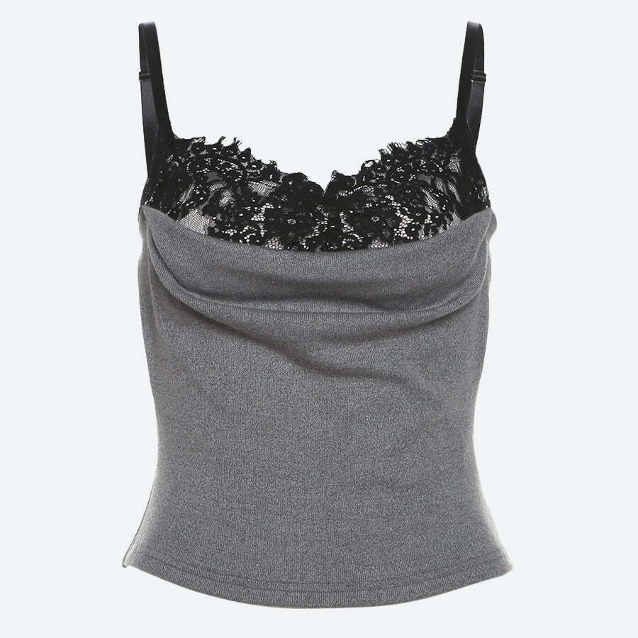 Layered to slay. This sexy-chic cami features a built-in lace bra overlay that adds instant baddie energy to any look. The soft heather gray body contrasts with delicate black lace for that perfect “lingerie-as-outerwear” vibe.
