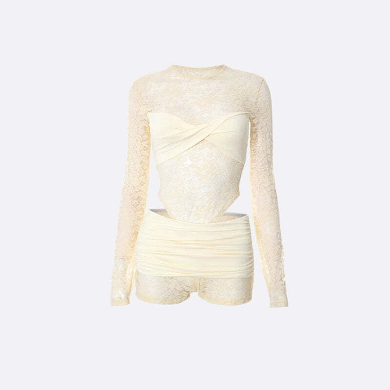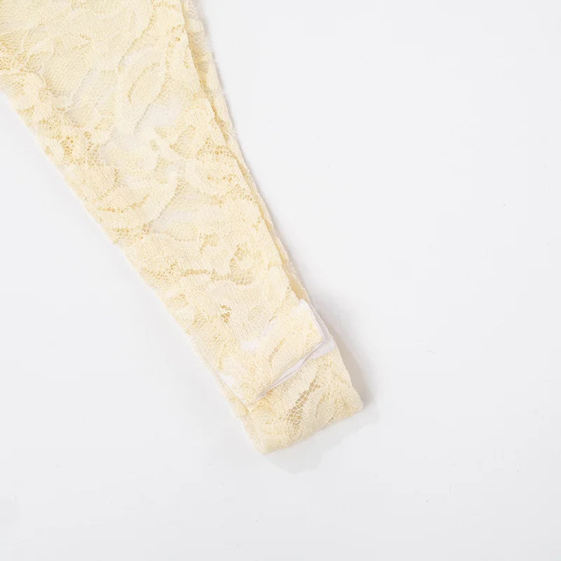 Soft pastel yellow meets sheer lace in this two-piece set. Includes a long-sleeve see-through top and matching bodysuit with ruched waist detail. Stretchy and lightweight for breathable wear. A stylish blend of texture and form for casual or dressed-up looks.