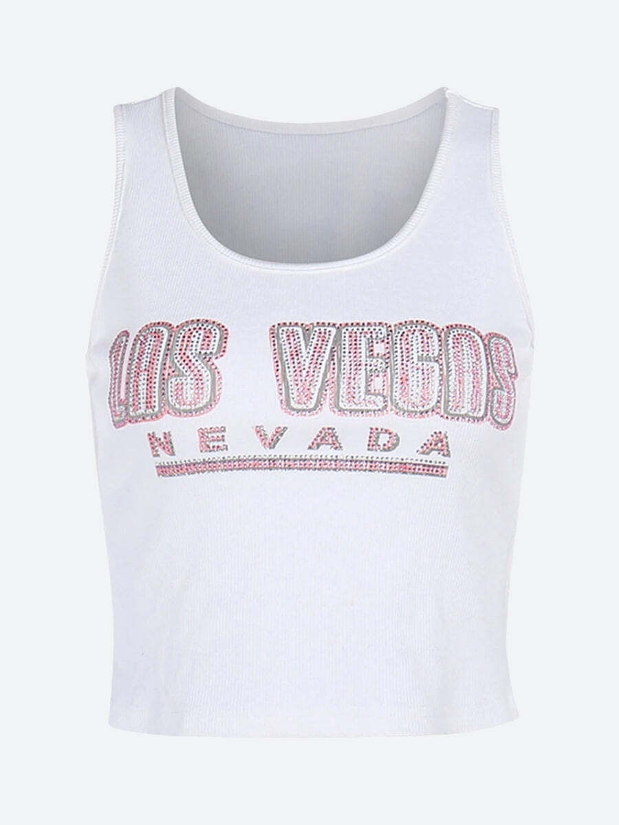 Bring the sparkle of the Strip to your wardrobe with this Las Vegas Tank Top. Featuring rhinestone-studded “Las Vegas Nevada” lettering on a classic white ribbed base, it’s the ultimate Y2K-inspired essential for girls who love a little glam.