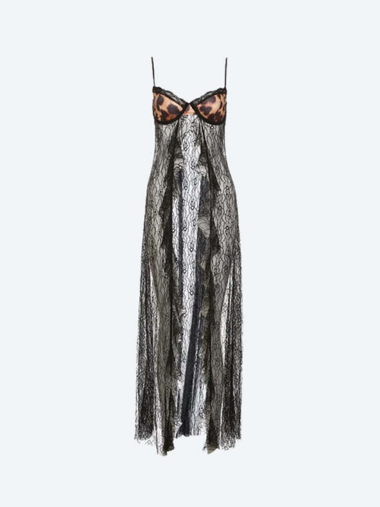 Turn heads with this bold leopard lace bra top, where sheer black lace meets fierce animal print. With a deep V cut, ultra-thin straps, and dramatic side ruffles, it’s made for layering or styling solo. Perfect for edgy fits, festival nights, or Y2K-inspired looks with a sultry twist.