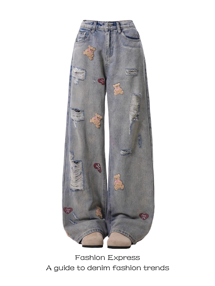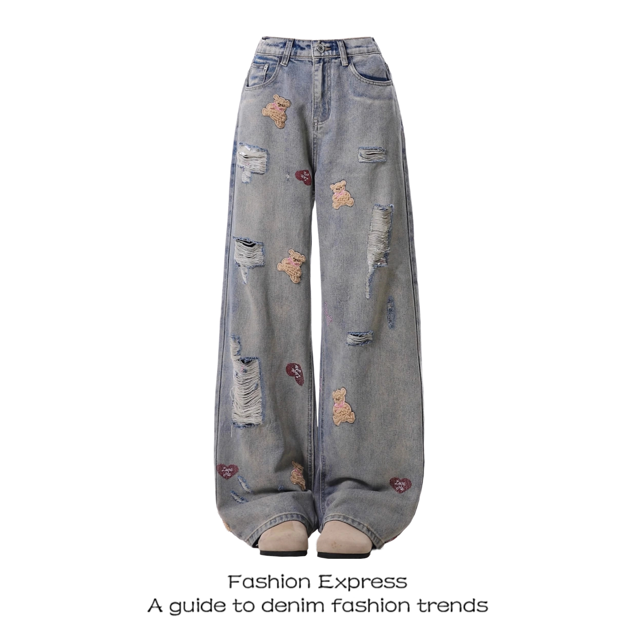 Light Blue Bear Embroidered Denim Pants Women, Retro, Ripped Fringe, Straight Leg, Spring Autumn High-quality product featuring spring outfits, leather pants outfit winter, fall fits and more. Modern design that fits the latest trends. Premium materials ensure durability and comfort. Order now for special offers! Product designed with attention to every detail. Suitable for all occasions and personal styles.