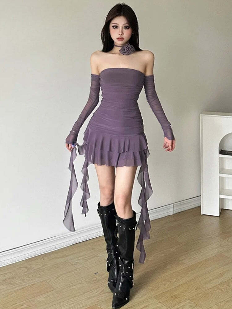 Drama meets romance in this Mesh Ruffled Strapless Mini Dress. Designed to sculpt your curves with its ruched bodice and body-hugging silhouette, it’s finished with layered mesh ruffles that cascade down like petals. The removable arm sleeves and rosette choker give it a gothic-fairy twist—perfect for statement nights out.