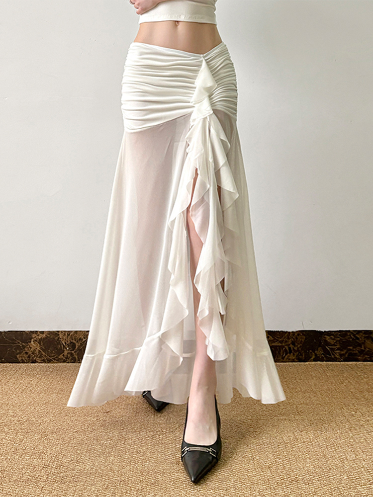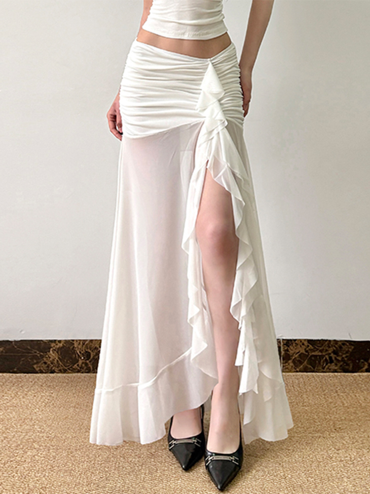 Mesh Ruffled Ribbon Split Hem Low WaiPleated Bodycon Long Skirt, Elegance High-quality product featuring coquette outfit, pretty outfits, fairy costume and more. Modern design that fits the latest trends. Premium materials ensure durability and comfort. Order now for special offers! Product designed with attention to every detail. Suitable for all occasions and personal styles.
