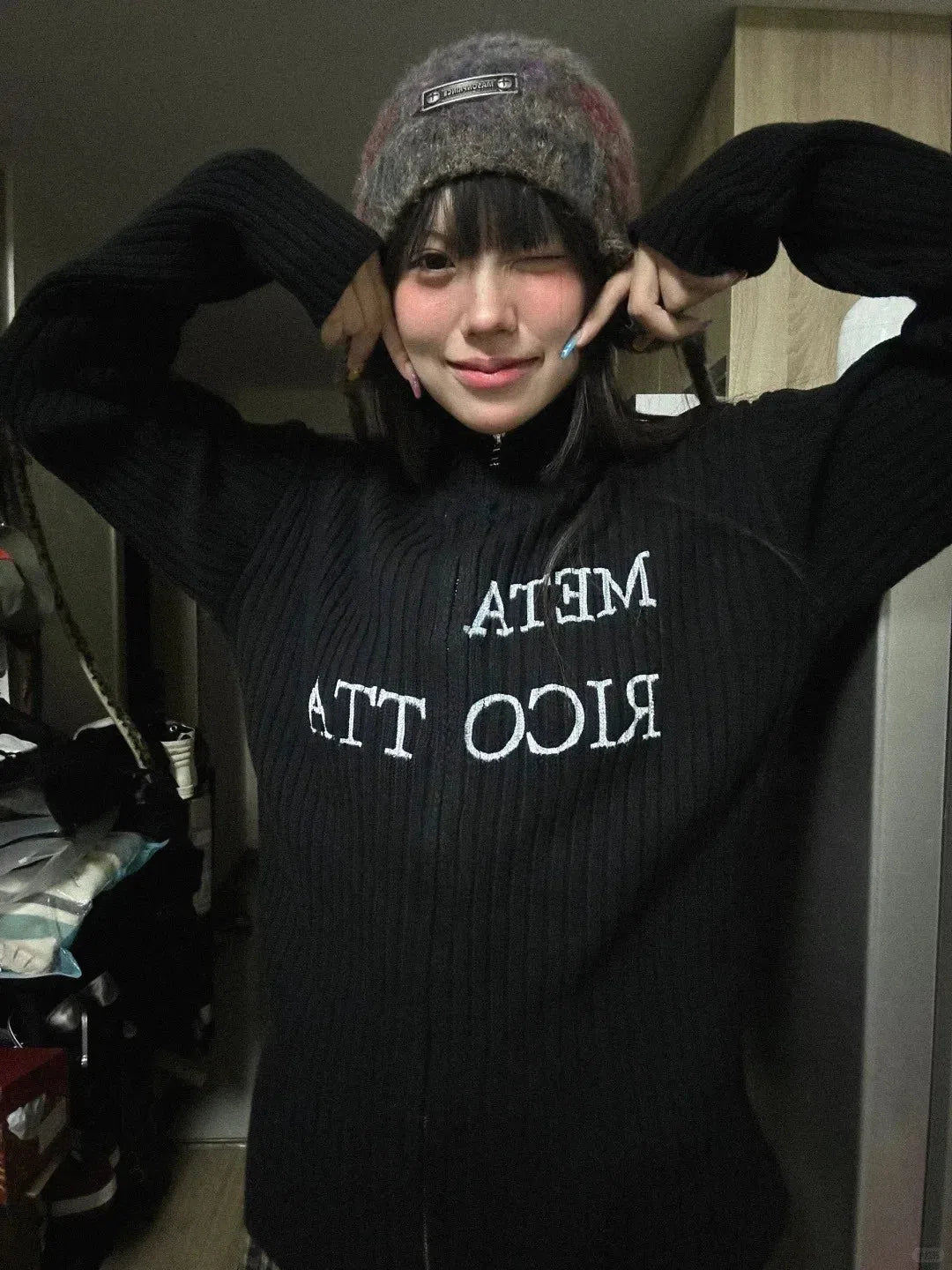 The Meta Ricotta Cardigan blends cozy warmth with a streetwear edge. Featuring a ribbed knit design, bold embroidered text, and a relaxed fit, this zip-up sweater is perfect for layering. Its soft fabric keeps you warm while maintaining a laid-back aesthetic.