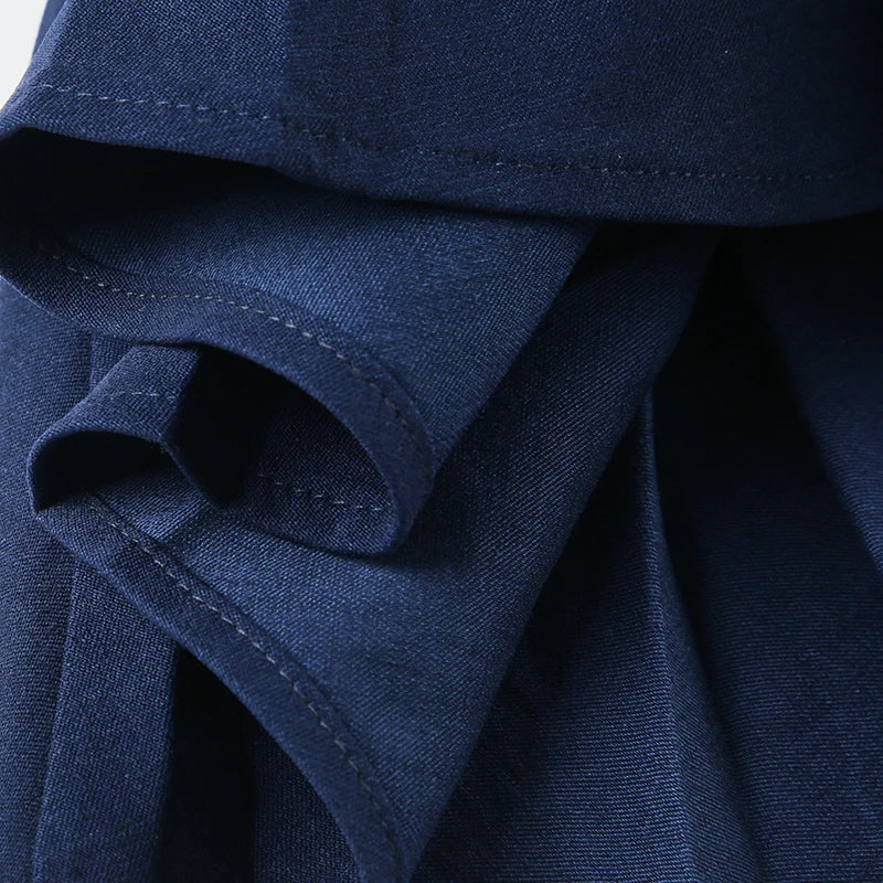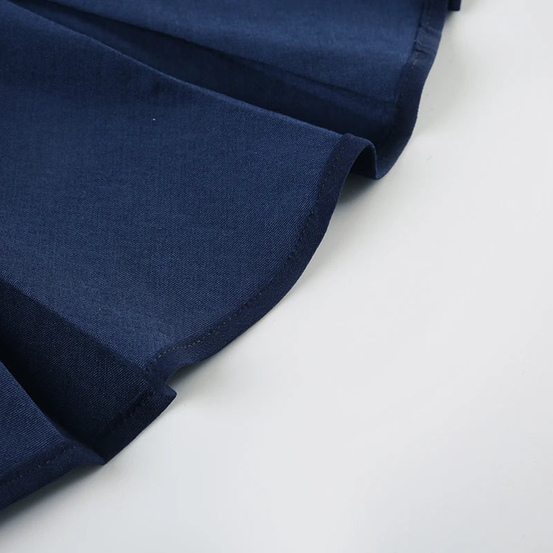 A navy mini dress inspired by nautical style, detailed with contrast trim, button front, and a pleated hem. Its structured fit and sailor-inspired neckline bring a playful yet chic vibe, making it perfect for statement streetwear or themed looks.