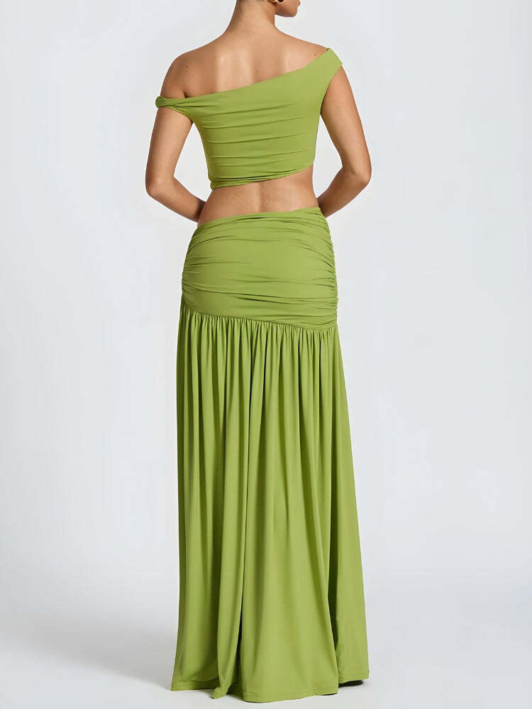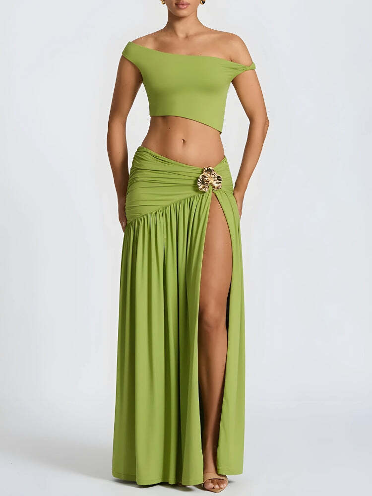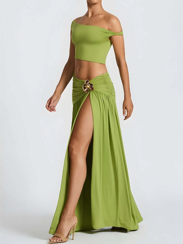 Command attention in this Off Shoulder Crop Top & Slit Maxi Dress Two Piece Set. With a sultry off-shoulder neckline and bold thigh-high slit, this lime green look blends structure and flow. The ornate metallic buckle accent at the waistline elevates the ensemble with a luxe touch.