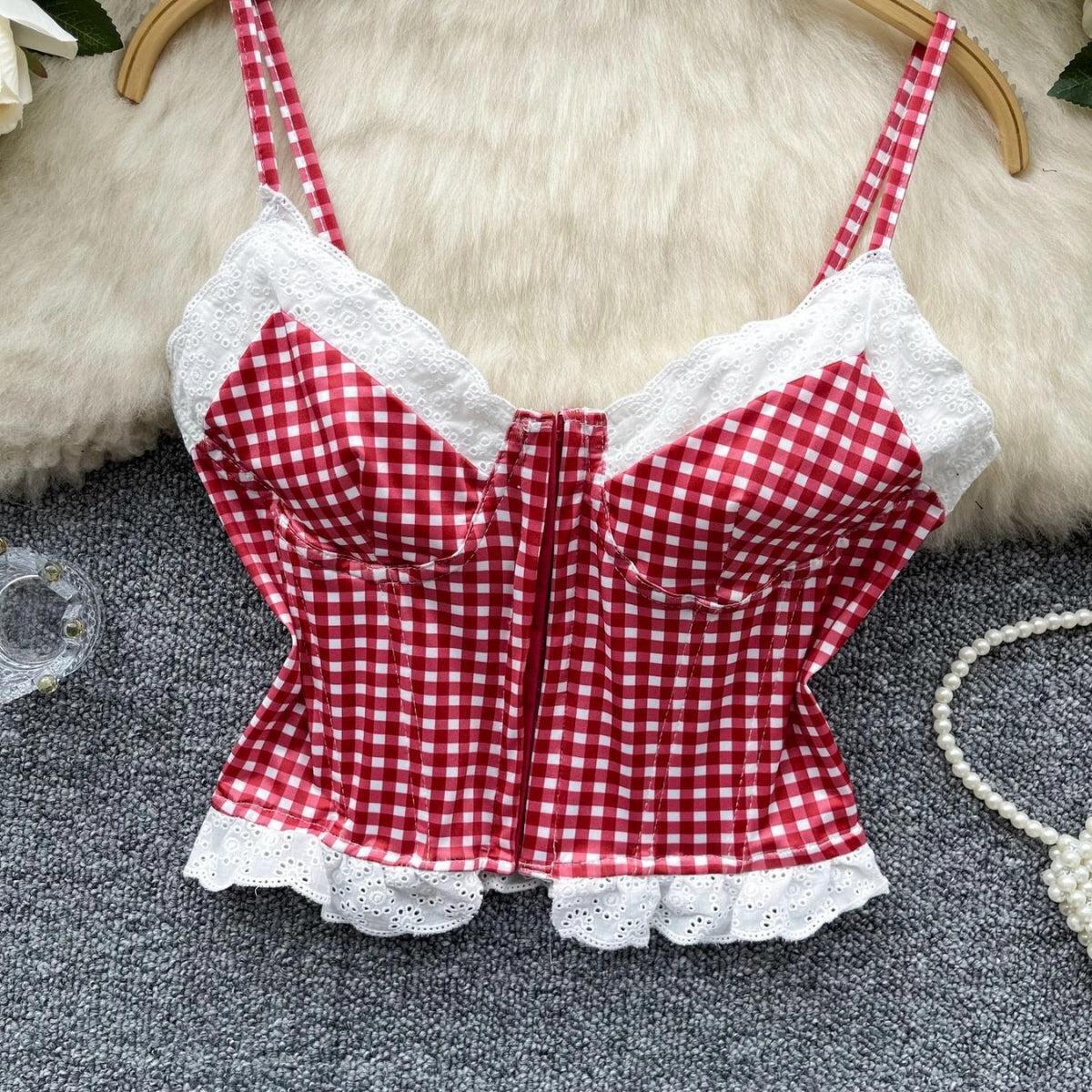 This top brings a nostalgic flair with its bold plunge neckline and classic plaid pattern. This top is perfect for festival wear or casual summer outings, offering a playful yet daring look. The lace trim adds a feminine touch, while the fitted bodice accentuates the figure. Pair it with a ruffled skirt and statement accessories to complete the vintage-inspired ensemble.
