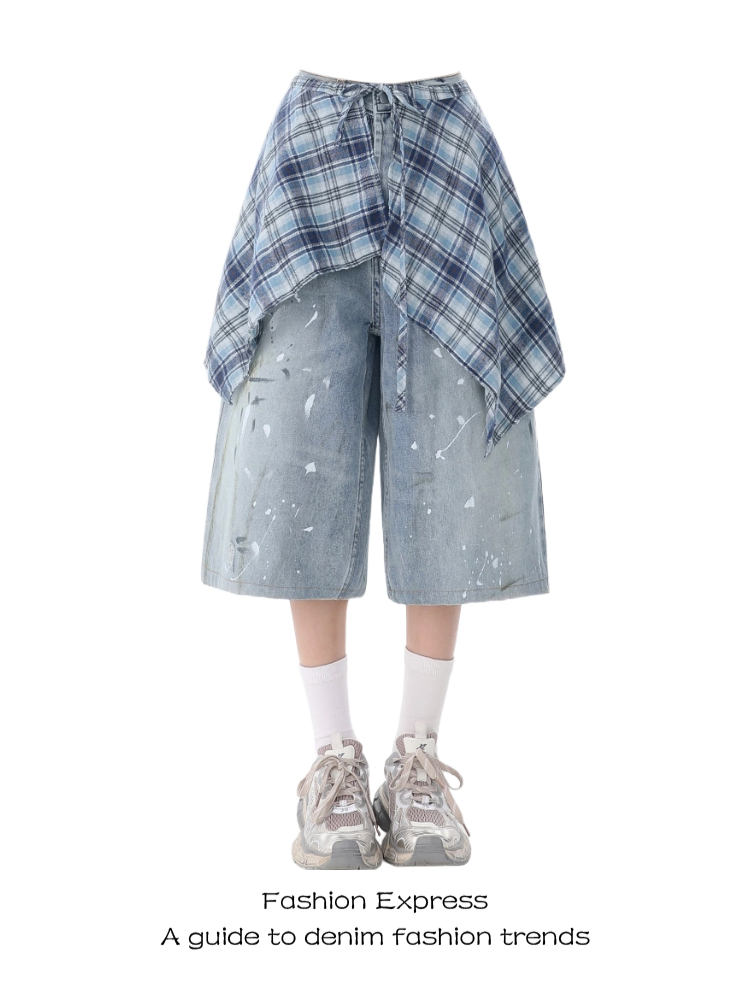 Plaid Split Hem Denim Pants Women Summer Ink Splash, Three Quarter Length Street High-quality product featuring fall fashion, outfit inspo fall, fall clothing trends 2025 and more. Modern design that fits the latest trends. Premium materials ensure durability and comfort. Order now for special offers! Product designed with attention to every detail. Suitable for all occasions and personal styles.