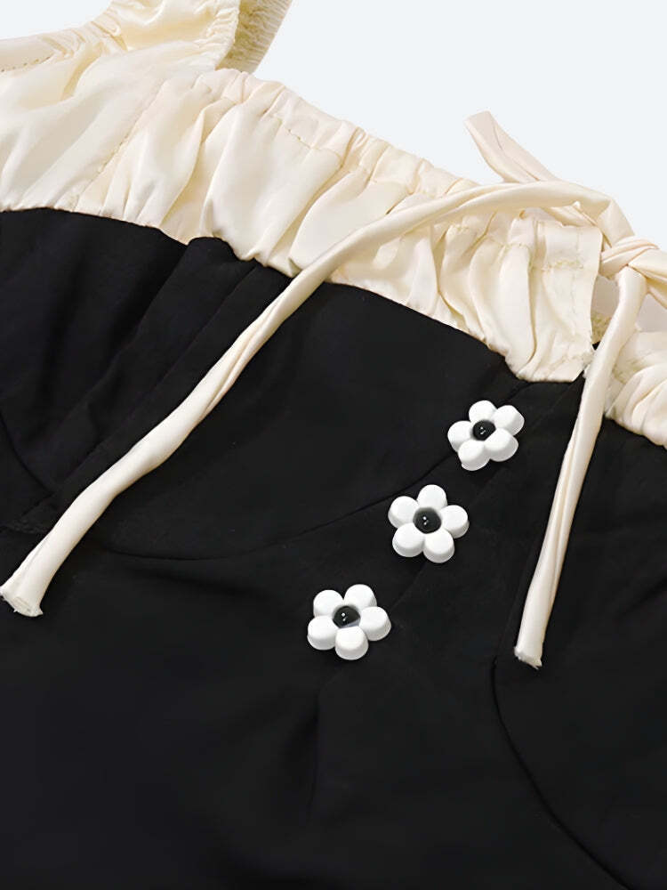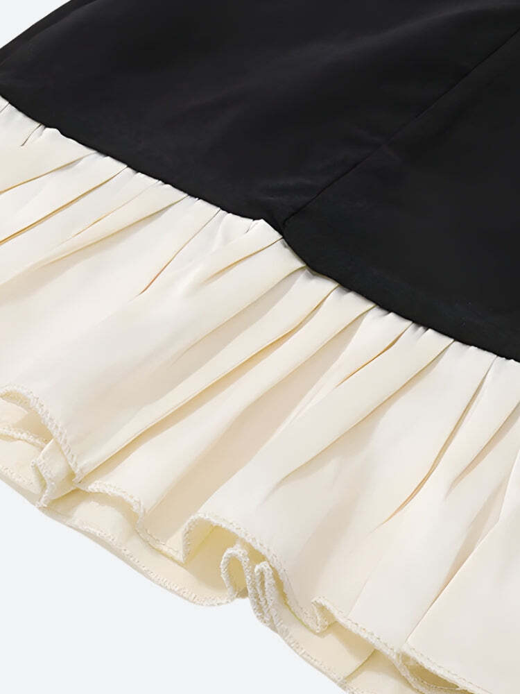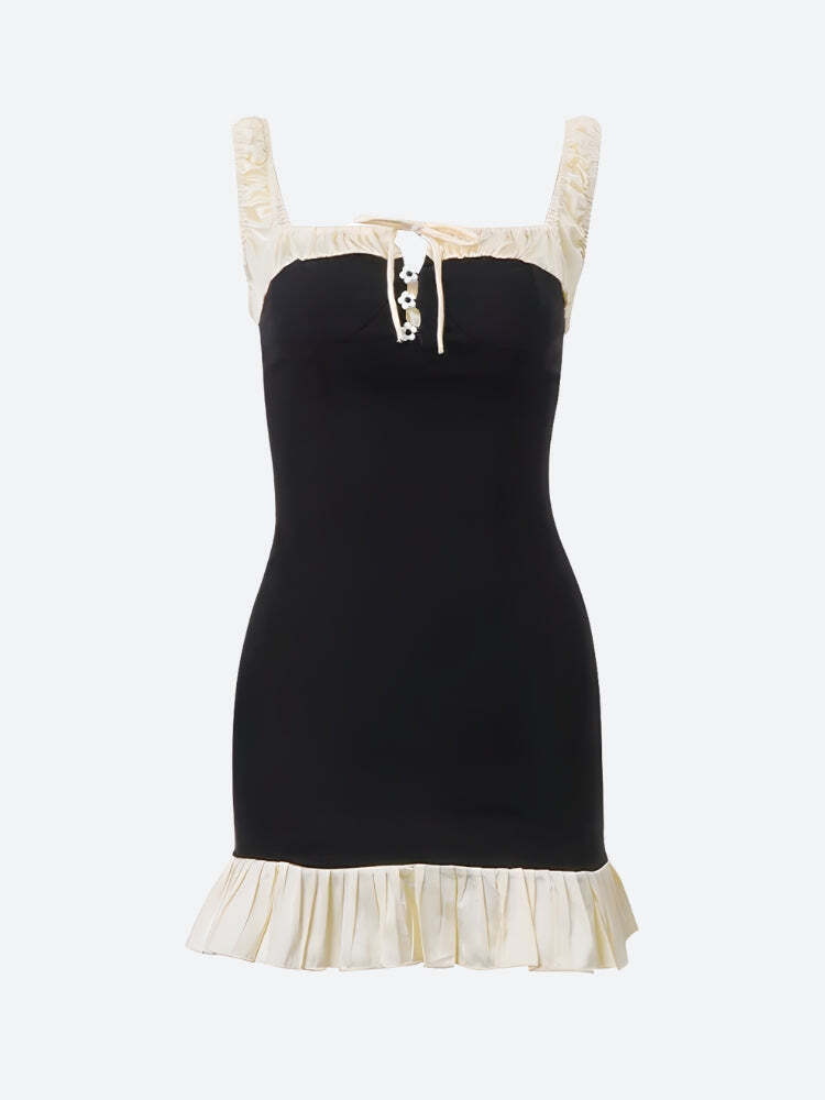 Classic charm meets modern coquette in this two-tone mini dress. With its contrast satin-like bust and pleated hem, it gives vintage energy with a flirty twist. The daisy-button detail down the front adds a touch of cottagecore sweetness.