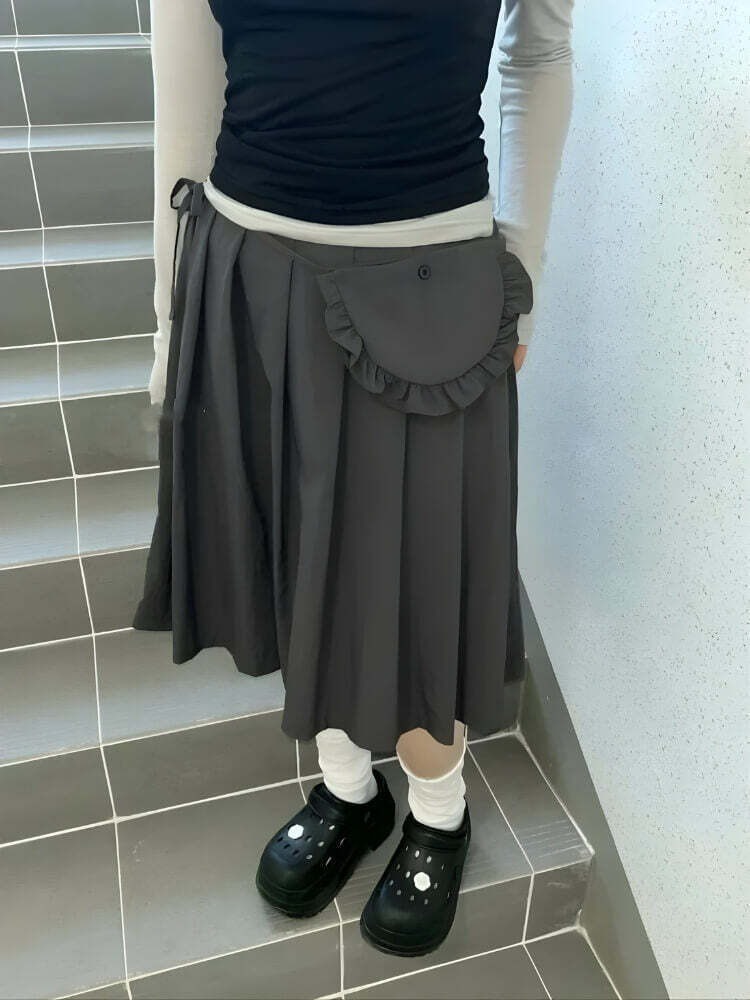 A classic pleated midi skirt designed with a structured silhouette and an attached pocket detail for a playful twist. The high-waist cut gives it a flattering fit, while the soft drape makes it easy to style with shirts, knits, or cropped tops. A versatile piece that blends practicality with aesthetic street style.
