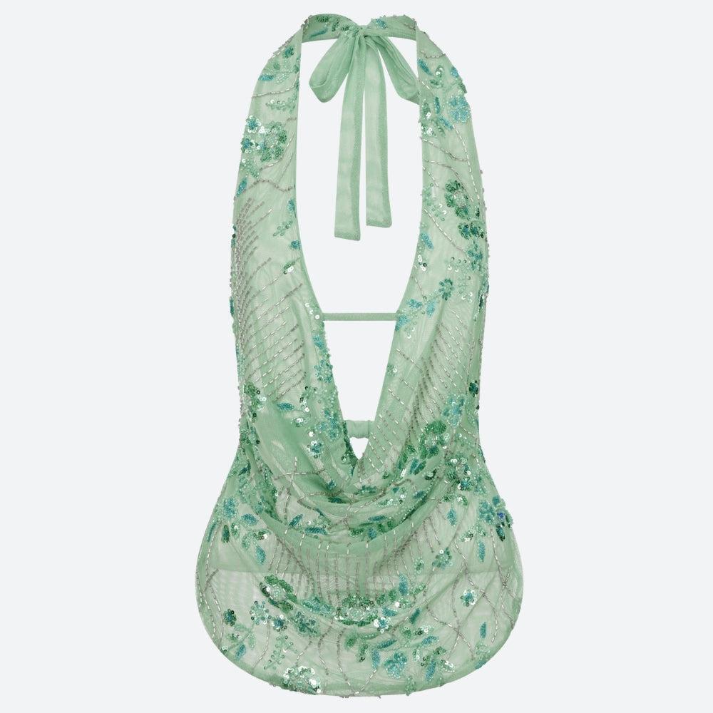 This plunge neck sequined beaded top sports a mint-green chiffon base embroidered with shimmering sequins and glass beads. The deep V neckline flows into a draped cowl back with layered straps that tie at the neck. Lightweight and sculpted, it pairs well with high-waisted skirts or trousers for elegant occasions or evening styling.